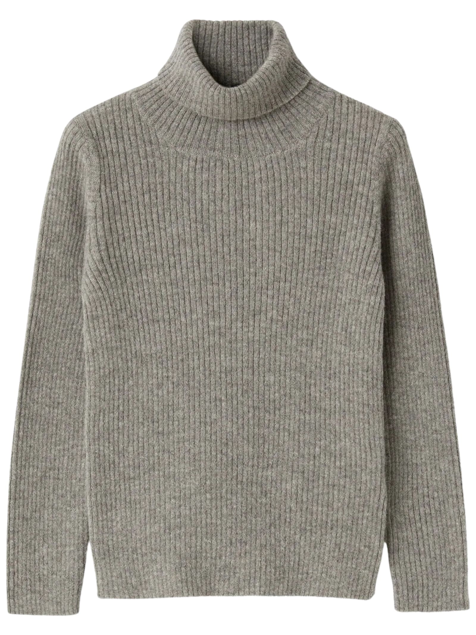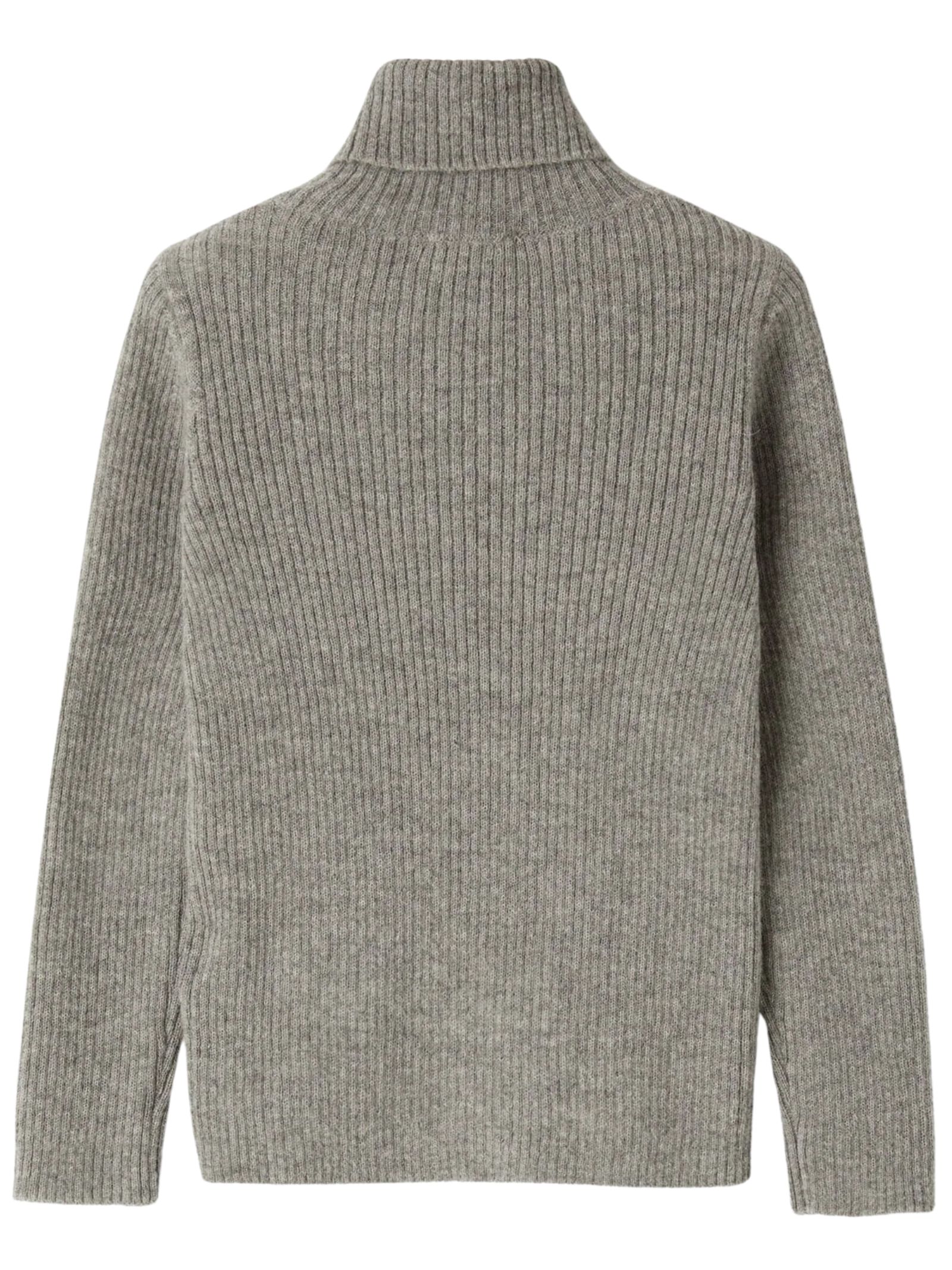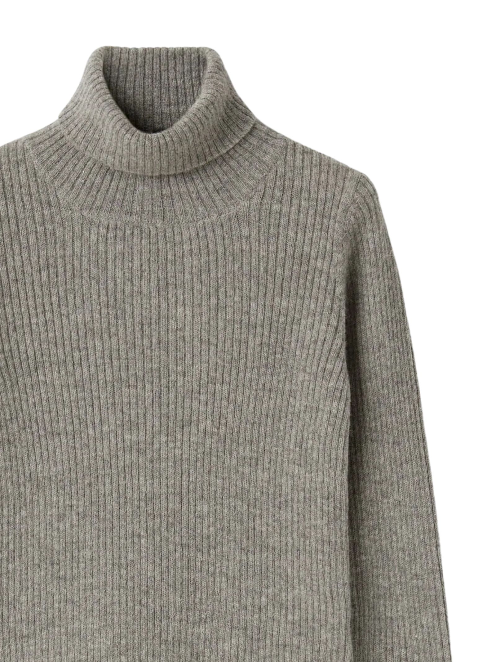 Il Gufo Kids gray turtleneck sweater, made of a soft ribbed wool blend, featuring a roll collar, long sleeves, and a slim fit. Composition: 50% nylon, 40% alpaca, 10% wool.