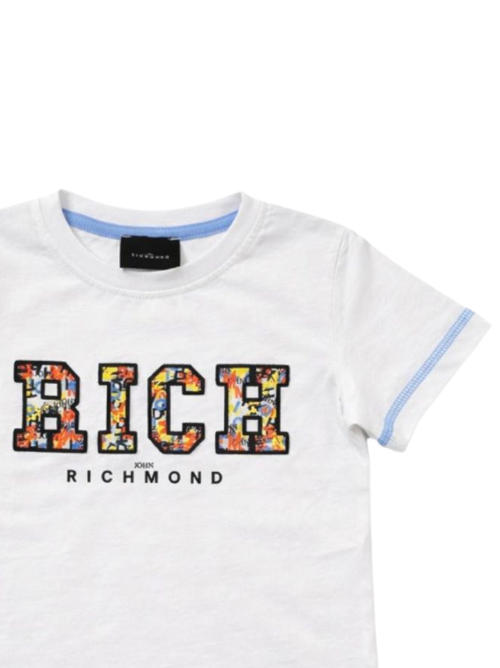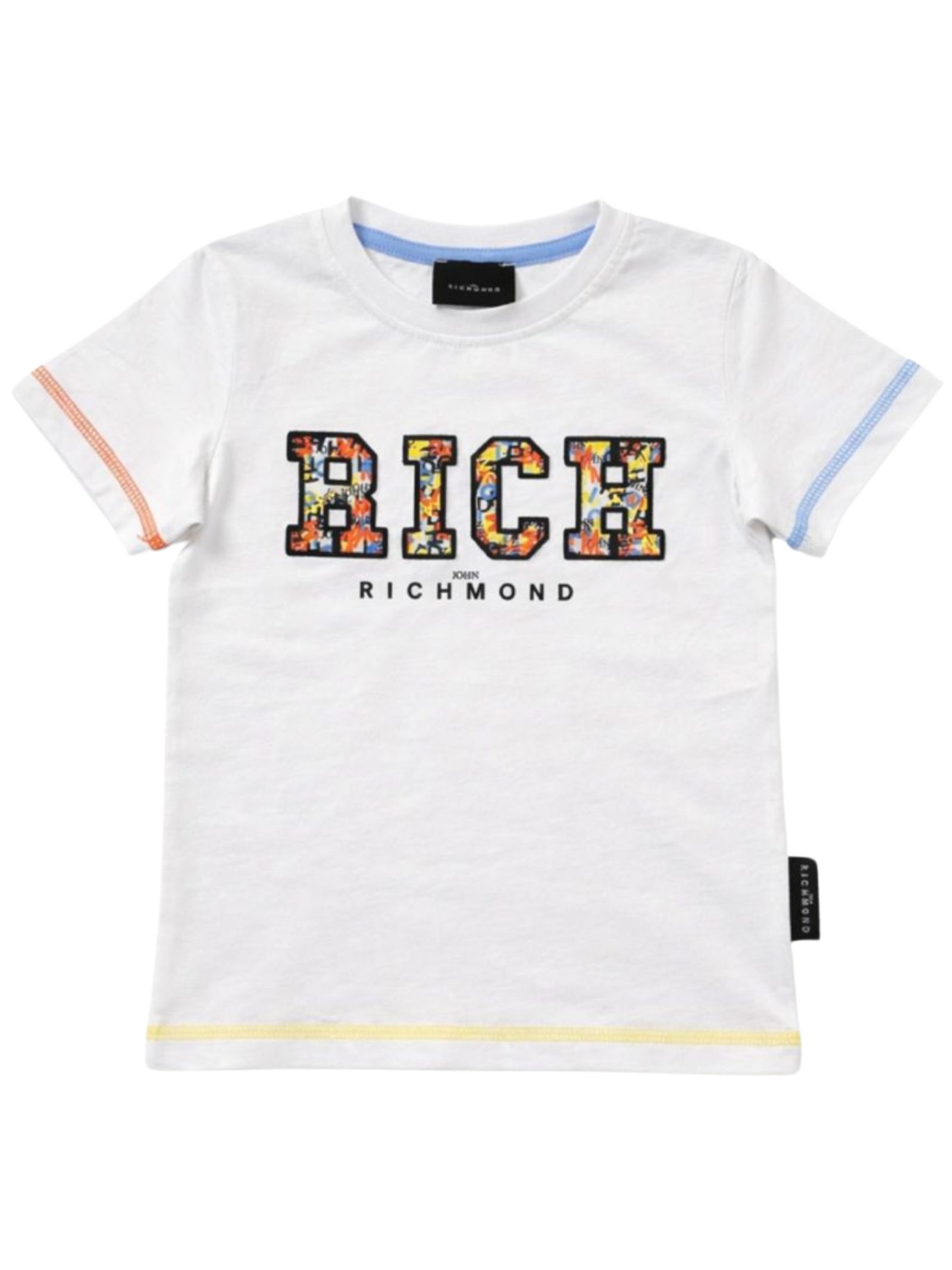 Jhon Richmond Kids white T-shirt, crew neck, short sleeves, contrasting multicolor central logo embroidery, regular fit. Composition: 100% cotton.