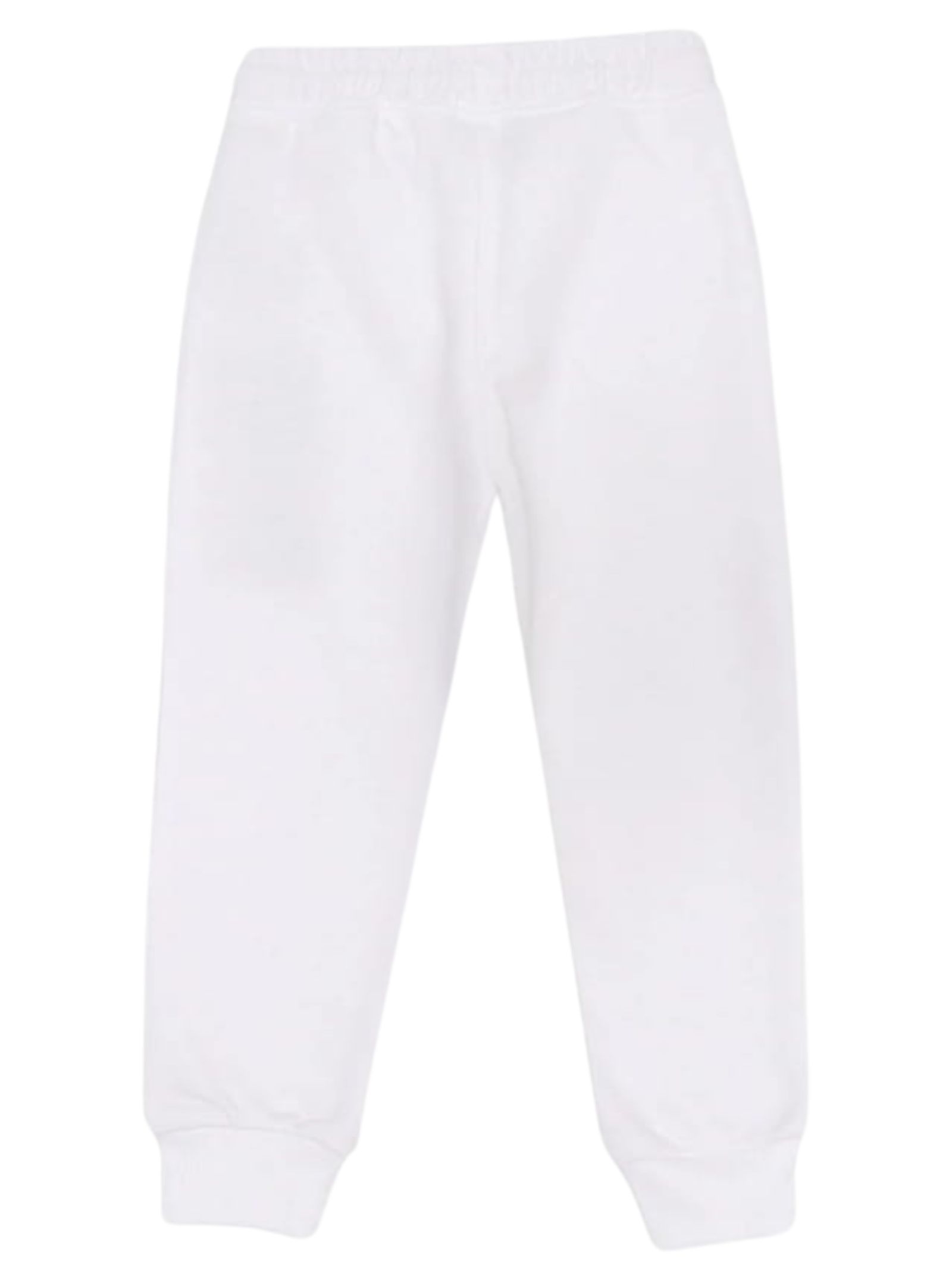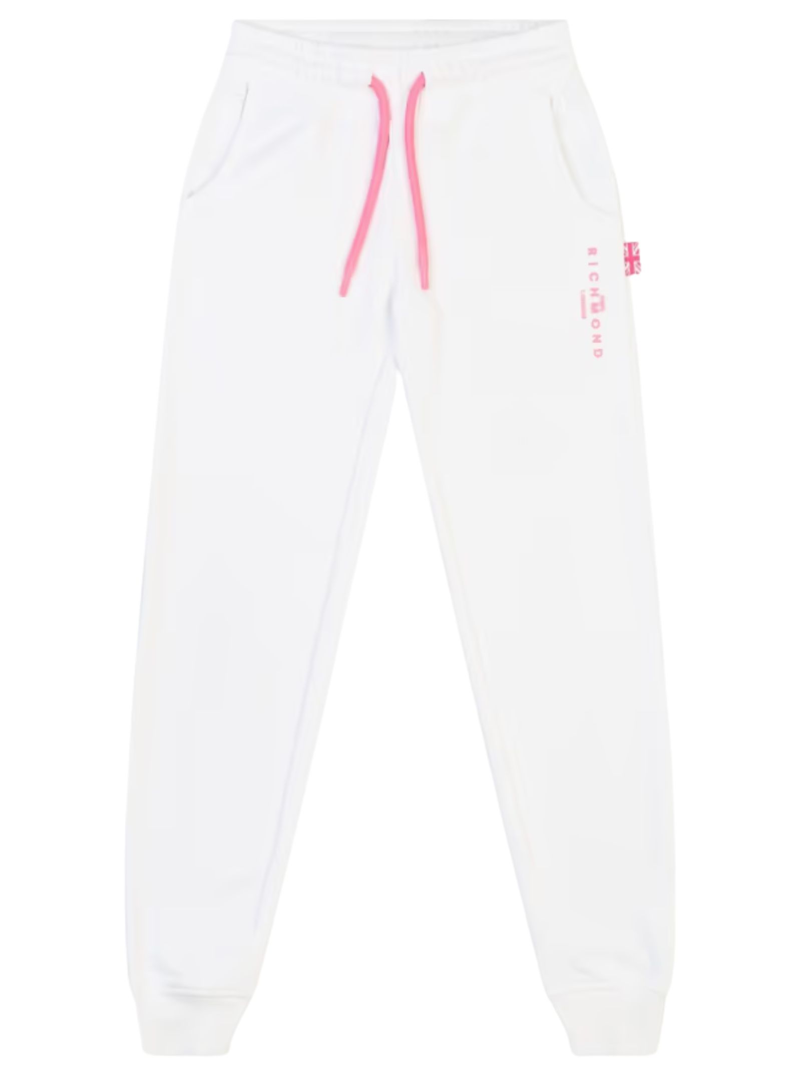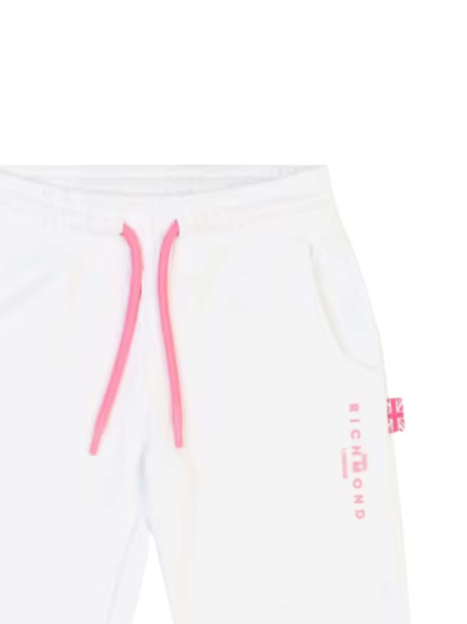 Jhon Richmond Kids white trousers with contrasting fuchsia details, elasticated waistband with drawstring, two side pockets, logo print, elasticated ankles, regular fit. Composition: 86% cotton, 14% polyester.