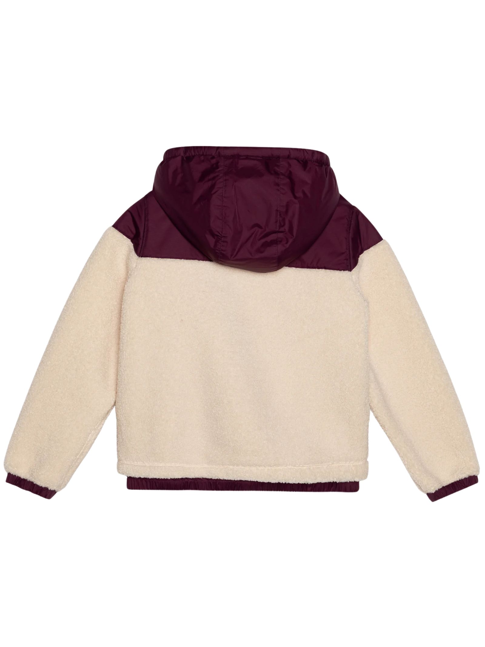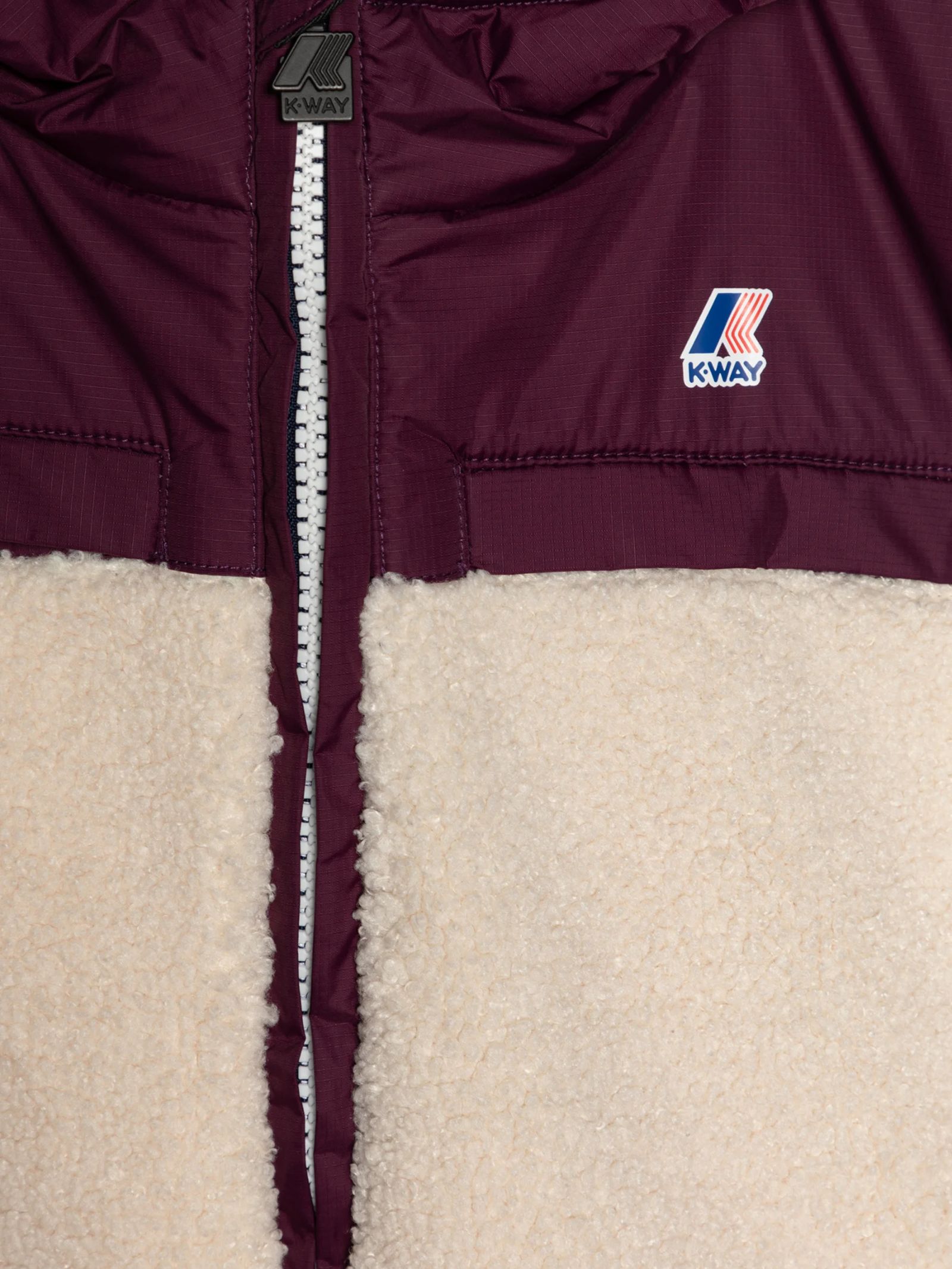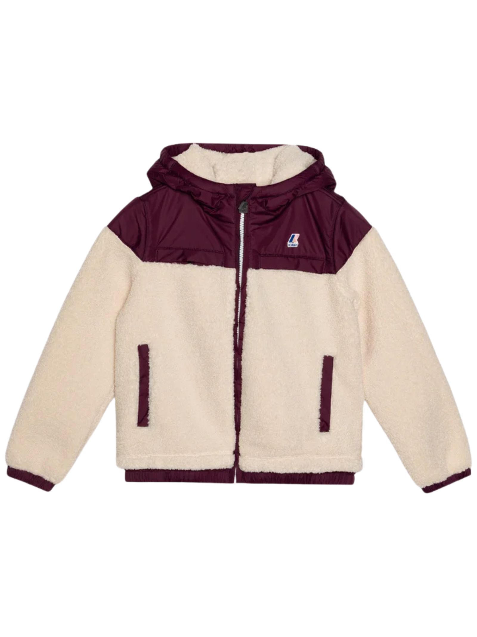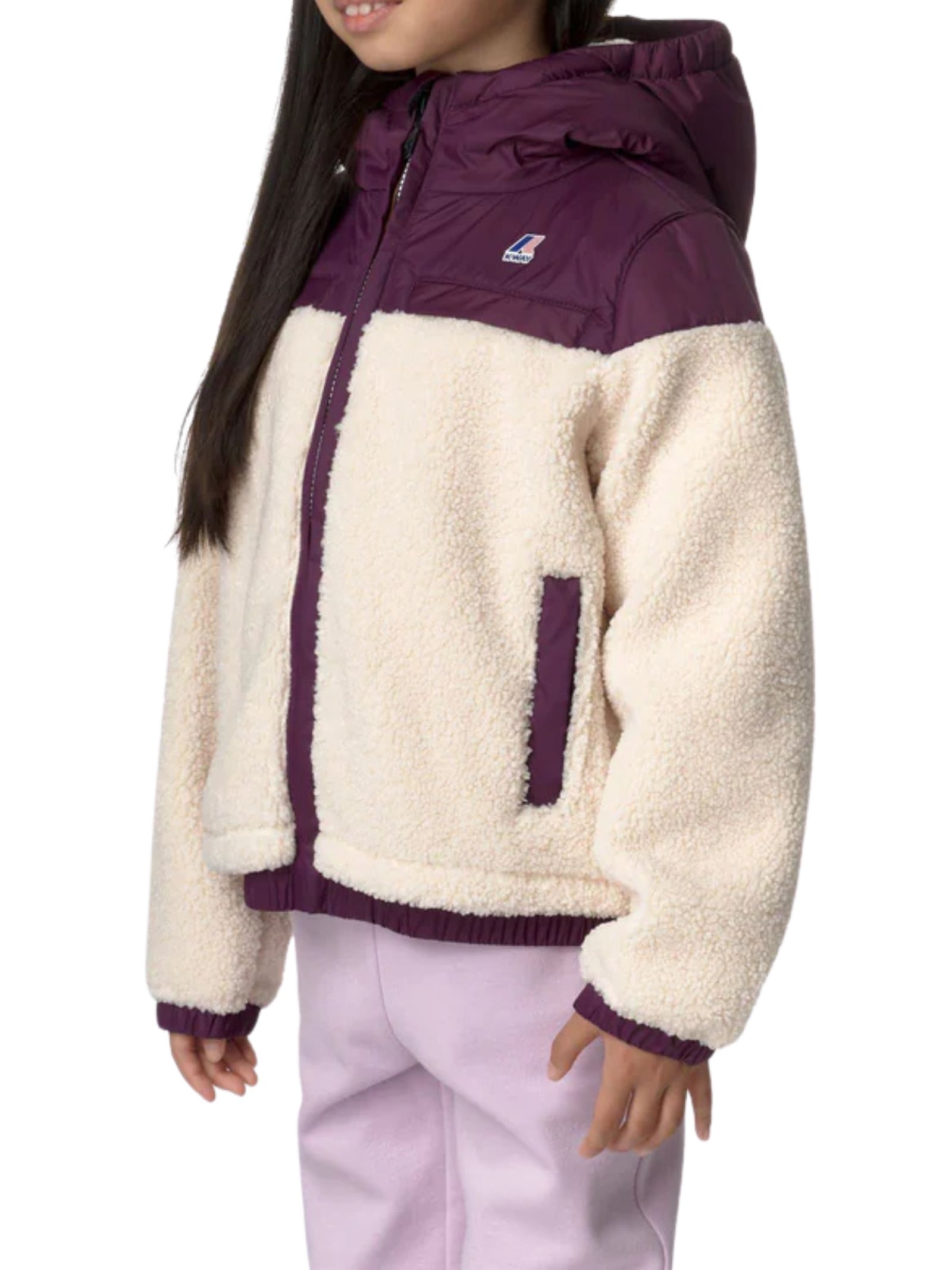 K-Way Kids Jildaz jacket in cream/purple, made of soft sherpa-effect fabric interspersed with nylon applications that add durability and a technical touch to the look, hood with fixed elastic bands, zip closure, internal windproof flap, elasticated cuffs, 2 pockets, vertical chest pocket, internal elasticated hem, regular fit, multicolor printed logo. Composition: 100% Polyester