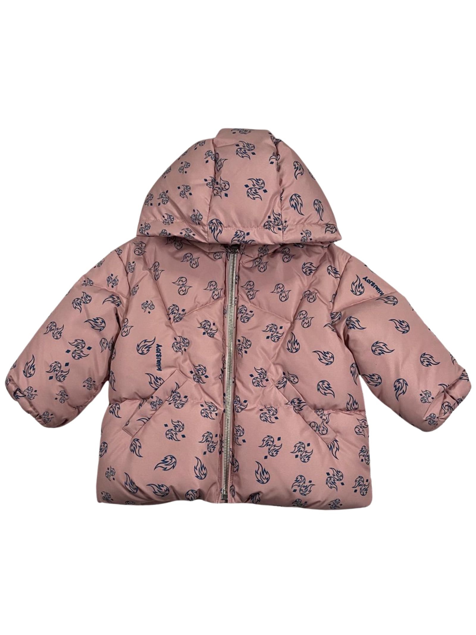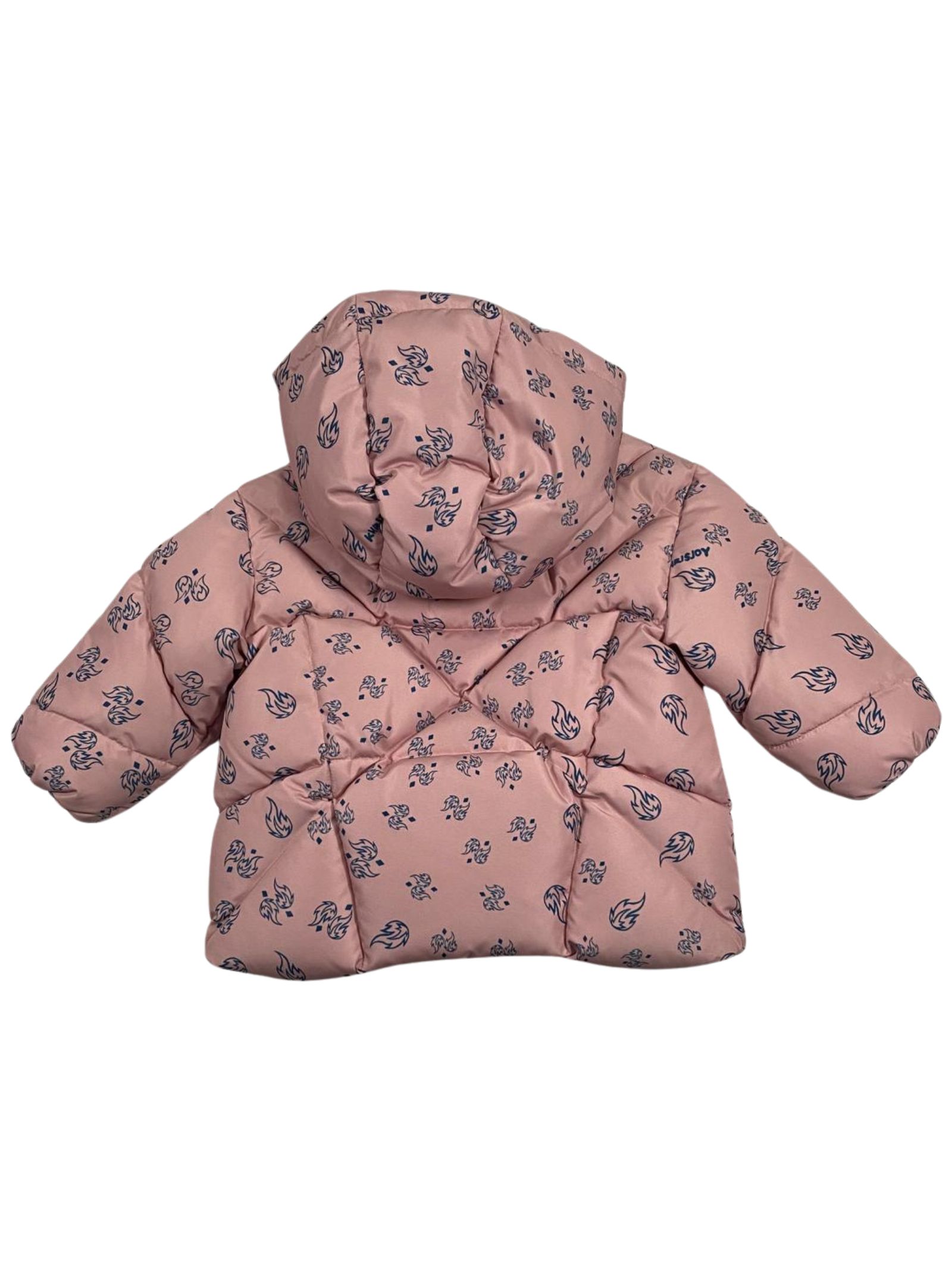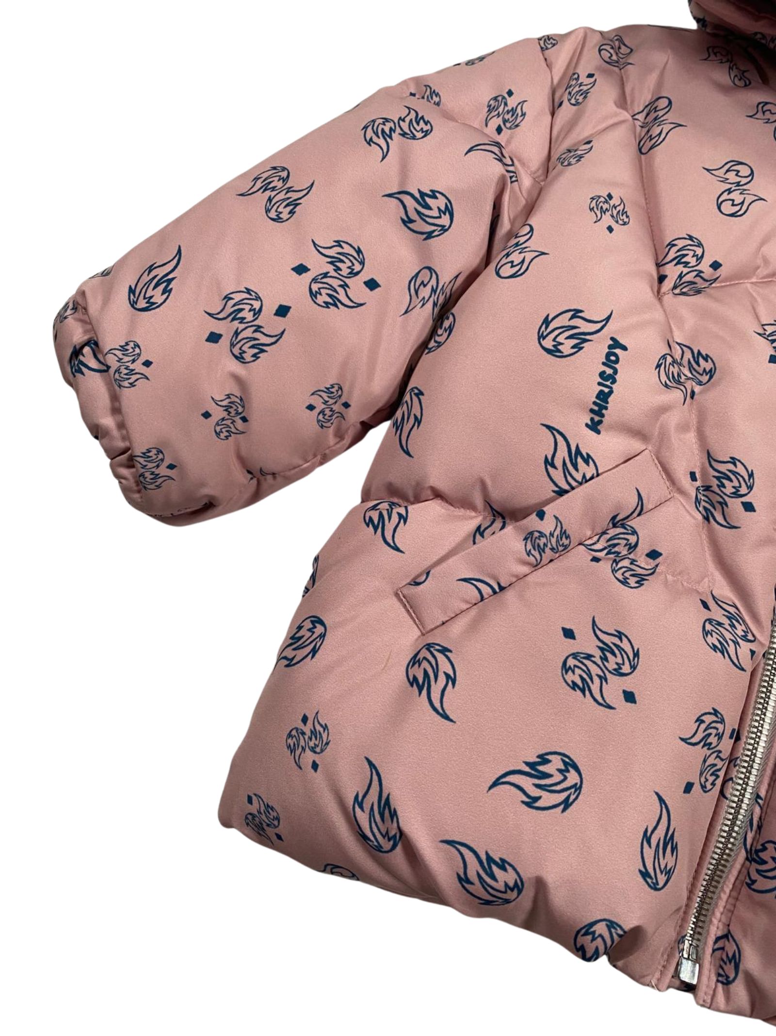 Khrisjoy Kids pink jacket with contrasting bandana print, quilted design, padded, hood, front zip closure, zip hem, two side pockets. Composition: 100% polyester. Filling: 80% goose down, 20% goose feathers.