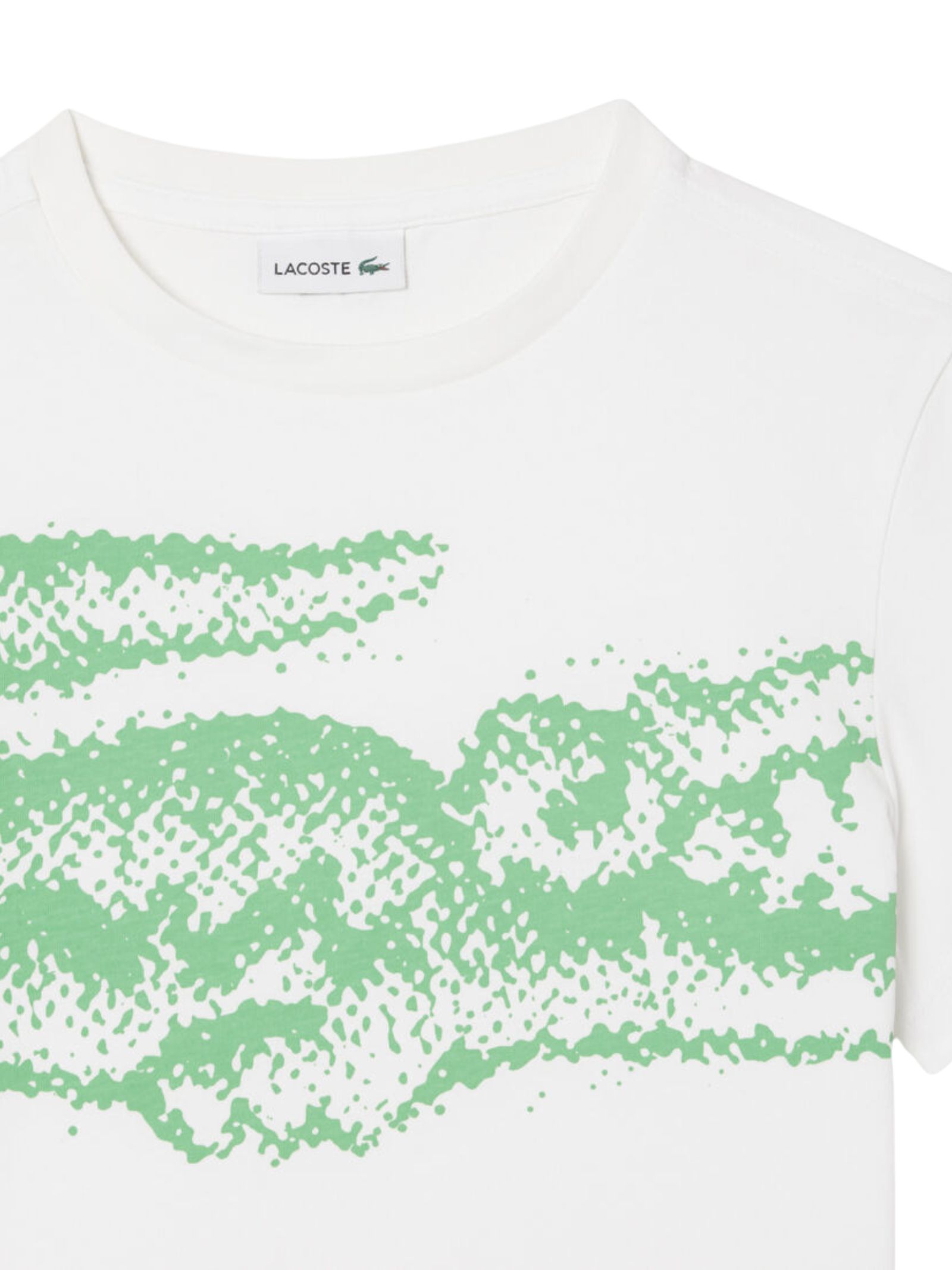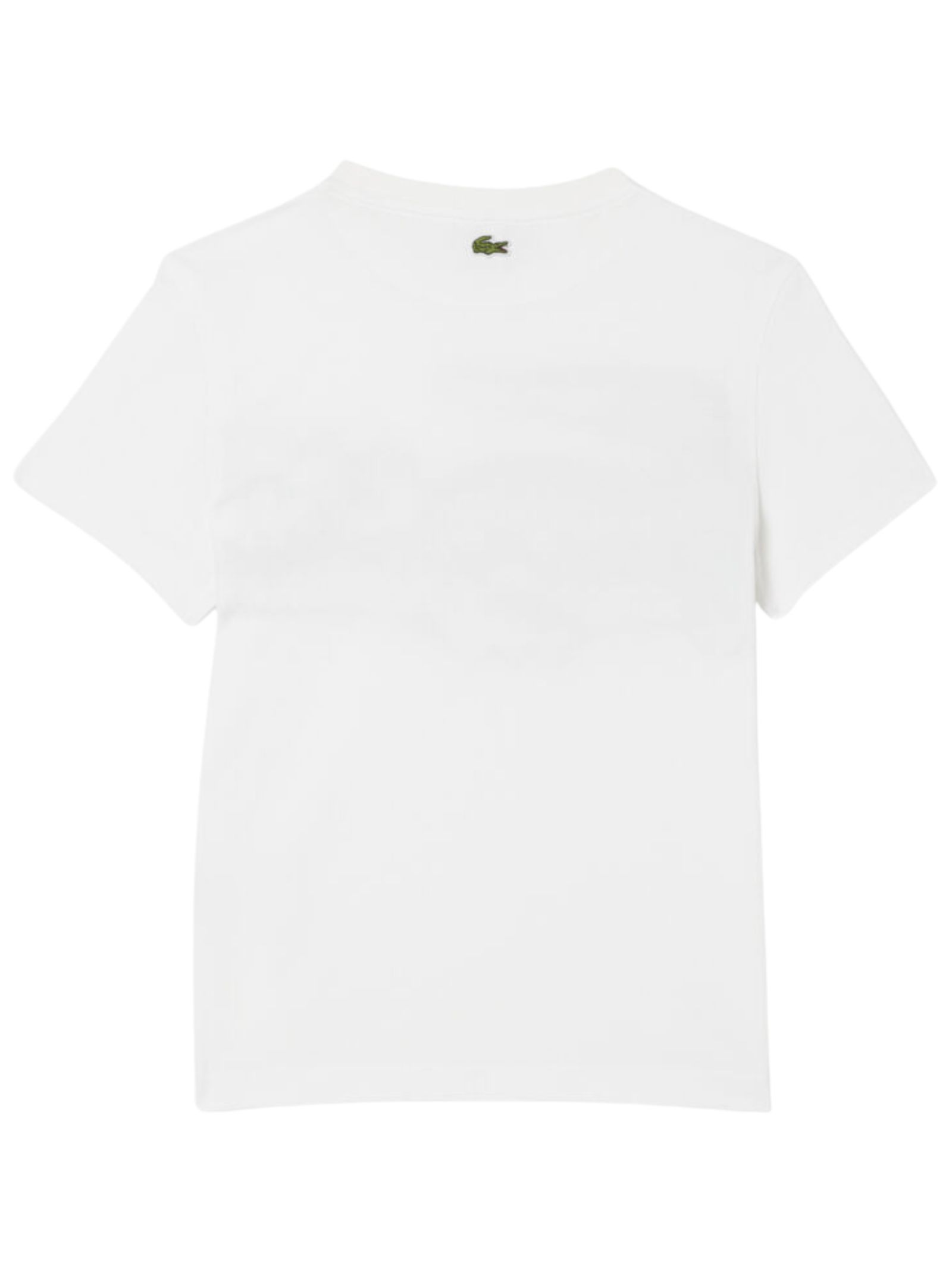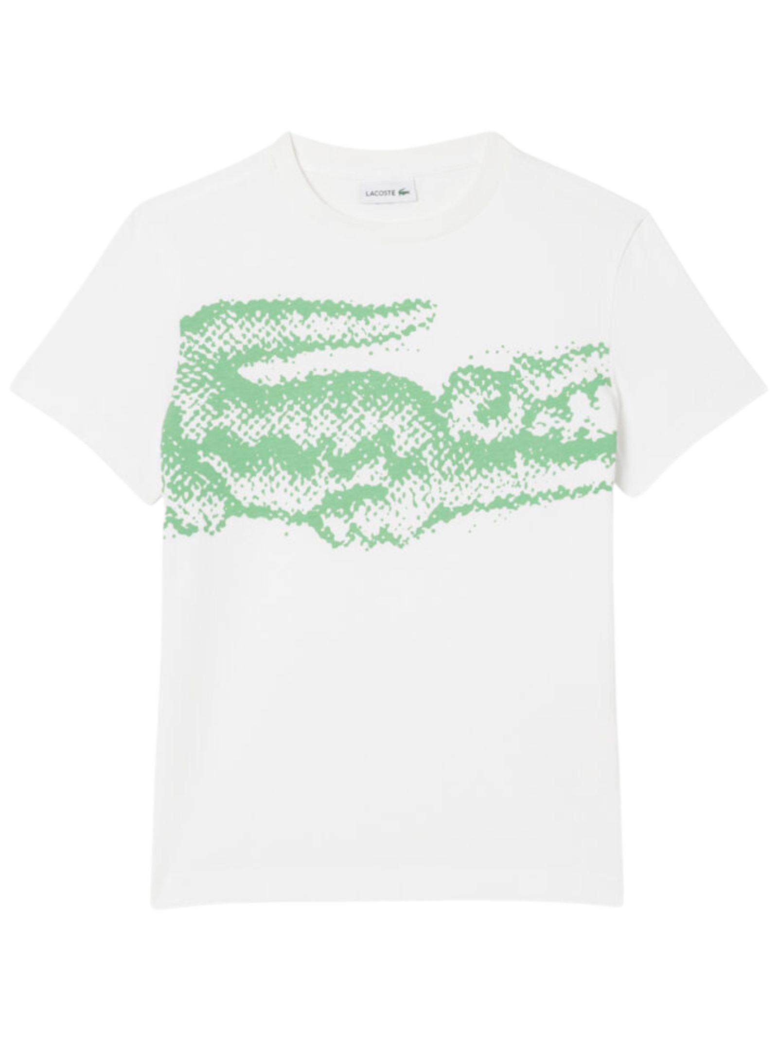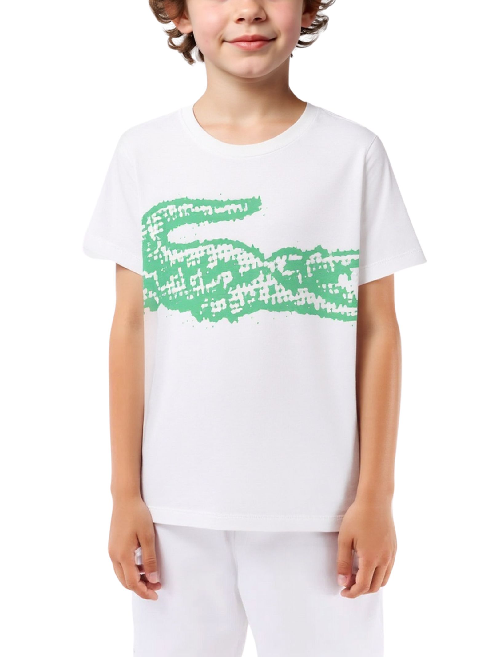 Lacoste Kids white T-shirt with contrasting green central print, crew neck, short sleeves, logo appliqué on the back, straight hem, regular fit. Composition: 100% cotton.