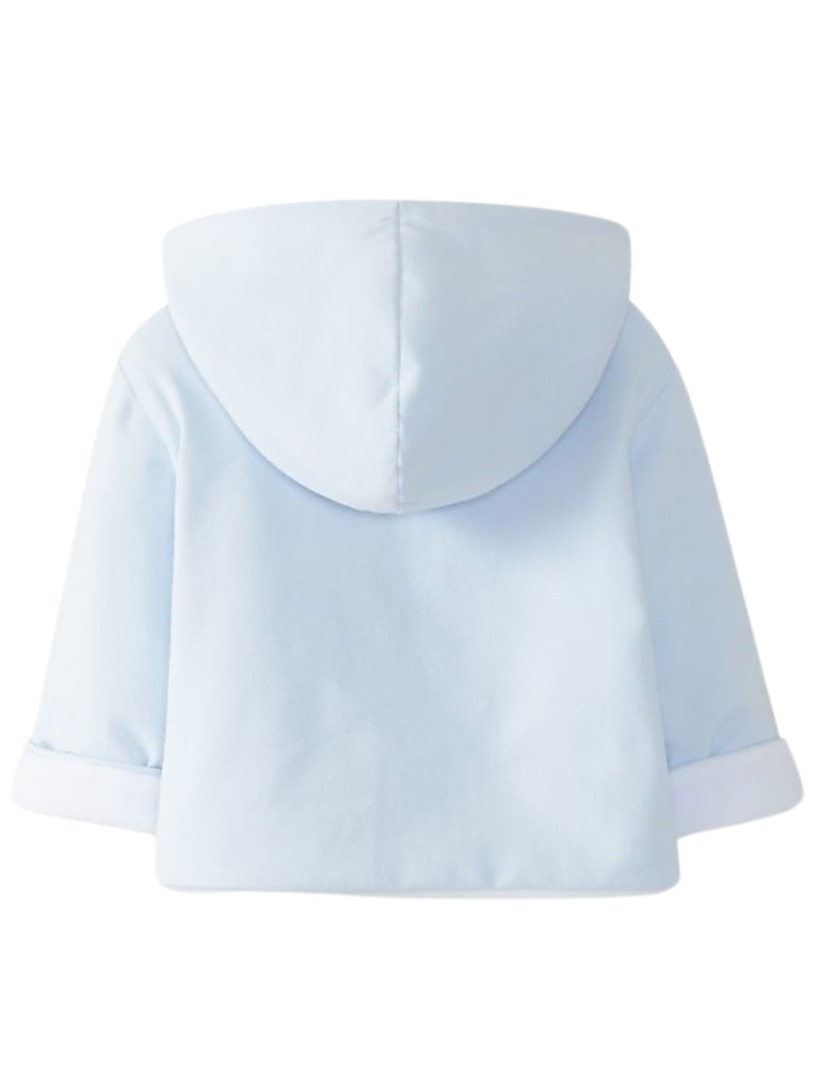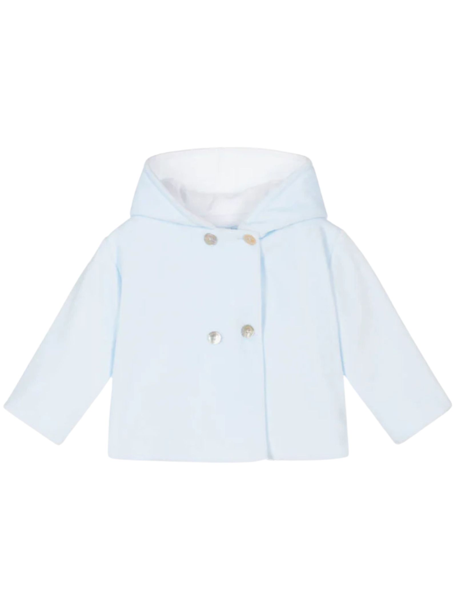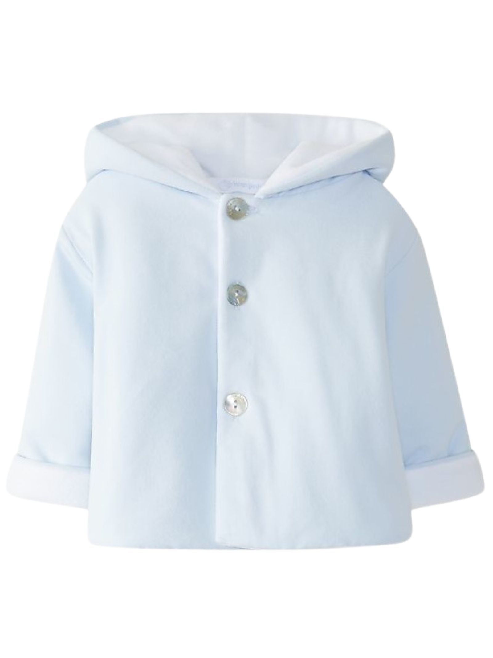 Laranjinha Kids sky blue cardigan, hooded design, long sleeves, mother of pearl buttons. Composition: 80% cotton 20% polyester. Lining: 100% cotton