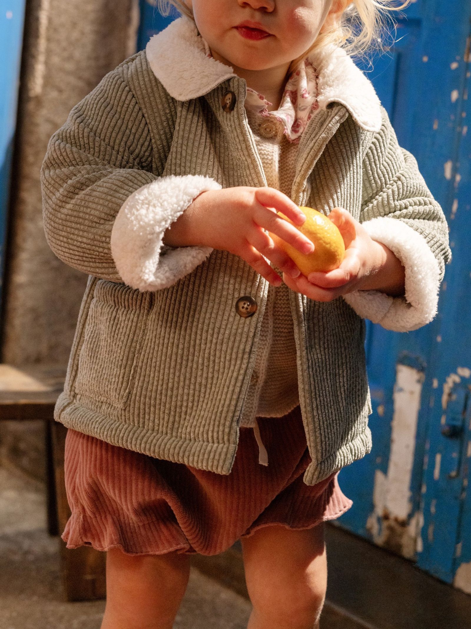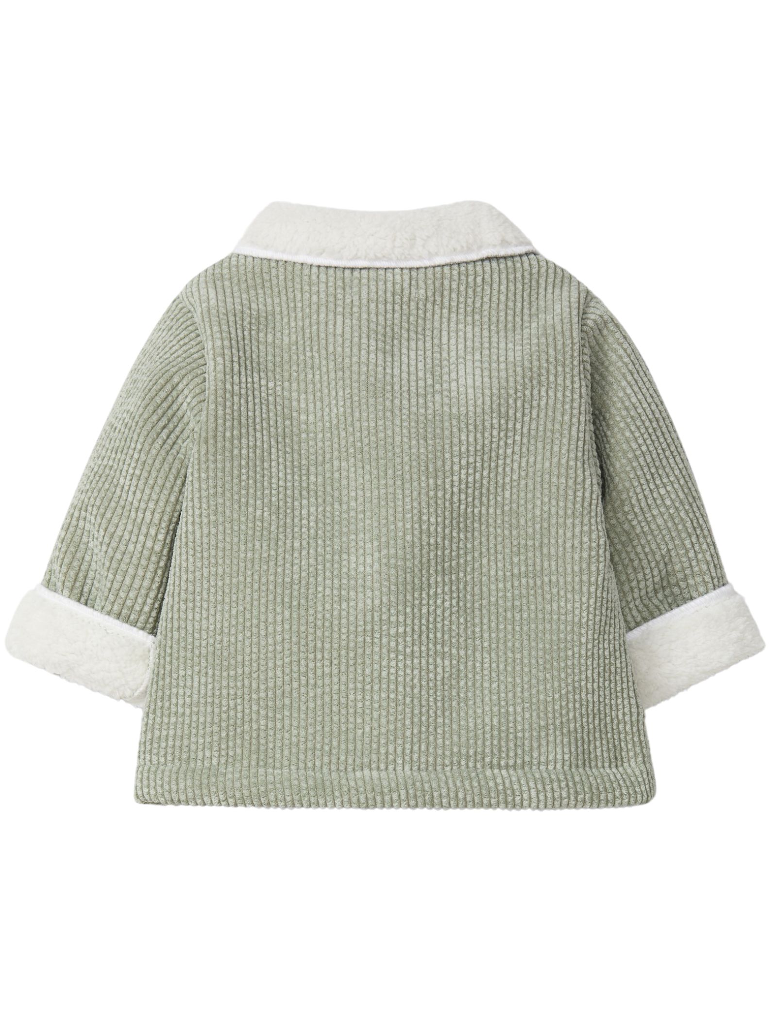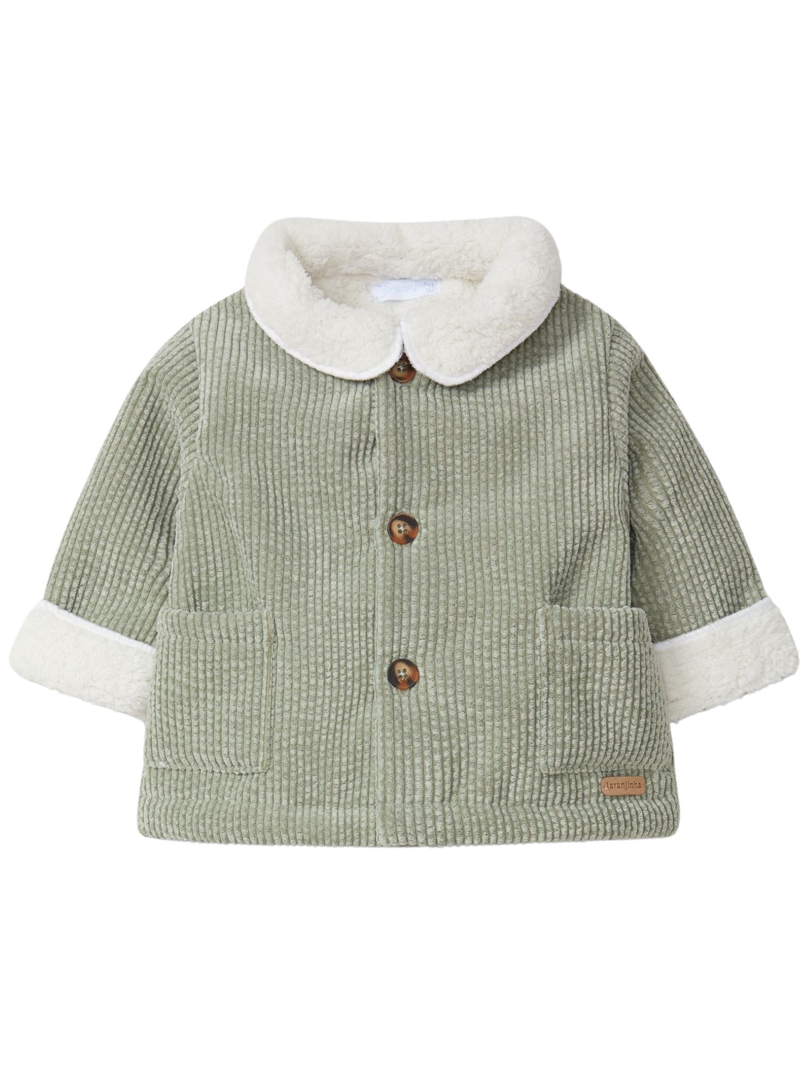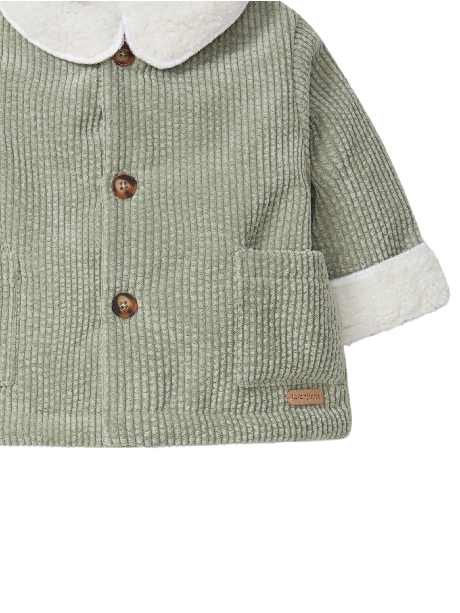 Laranjinha Kids green cardigan in velvety striped fabric, contrasting white sherpa interior, collar and cuffs, functional front pockets, logo application. Composition: 100% cotton
