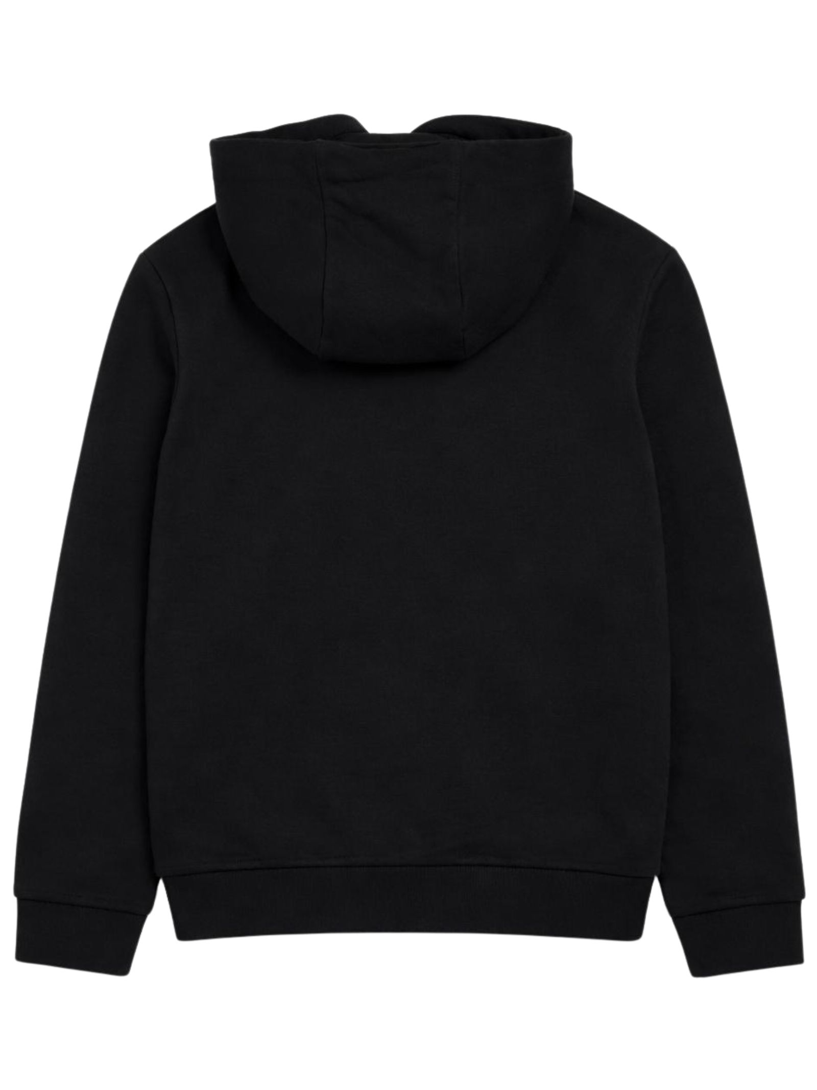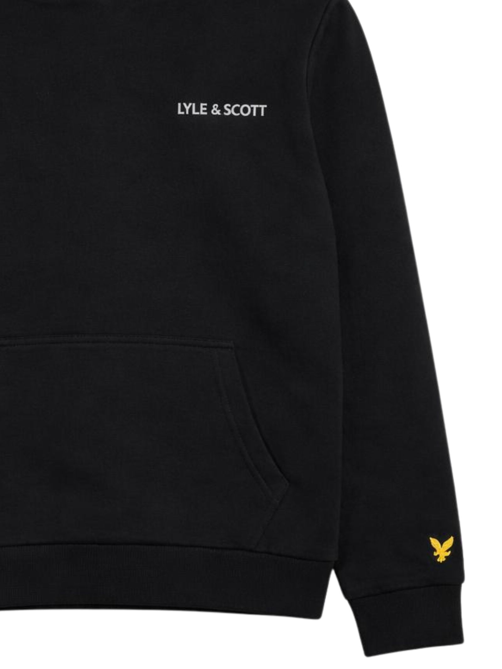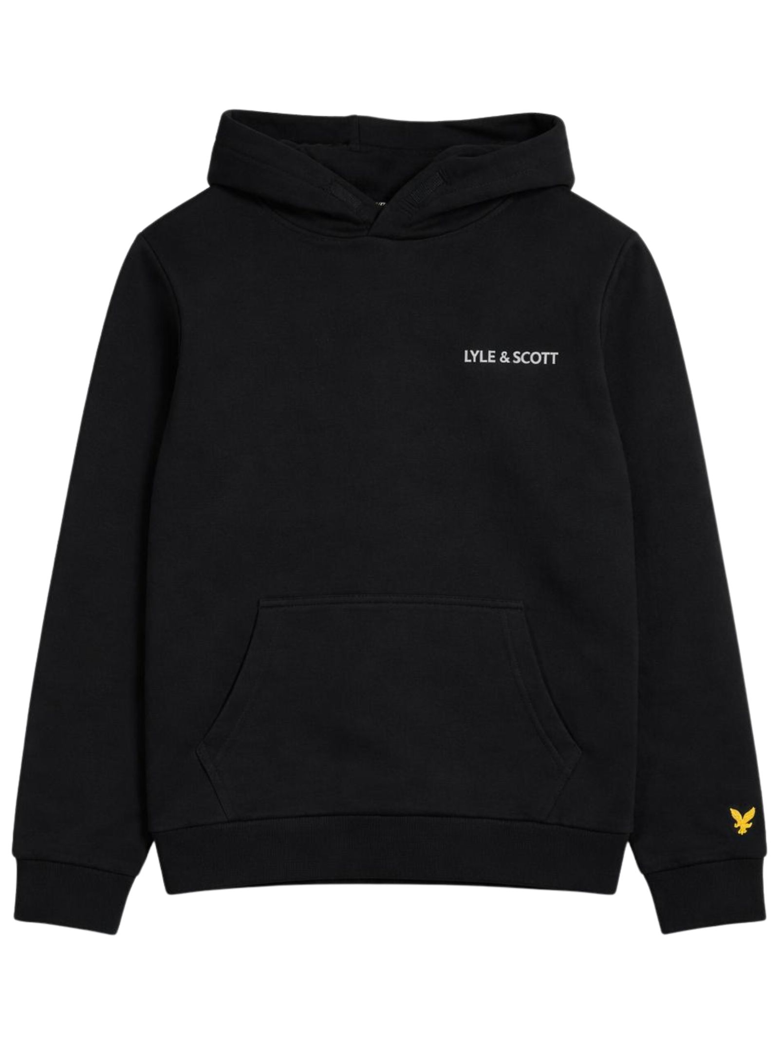 Lyle & Scott Kids black hoodie with long sleeves and ribbed cuffs, featuring a logo print on the chest, an embroidered logo on the arm, a straight hem, and a regular fit. Composition: 100% cotton.