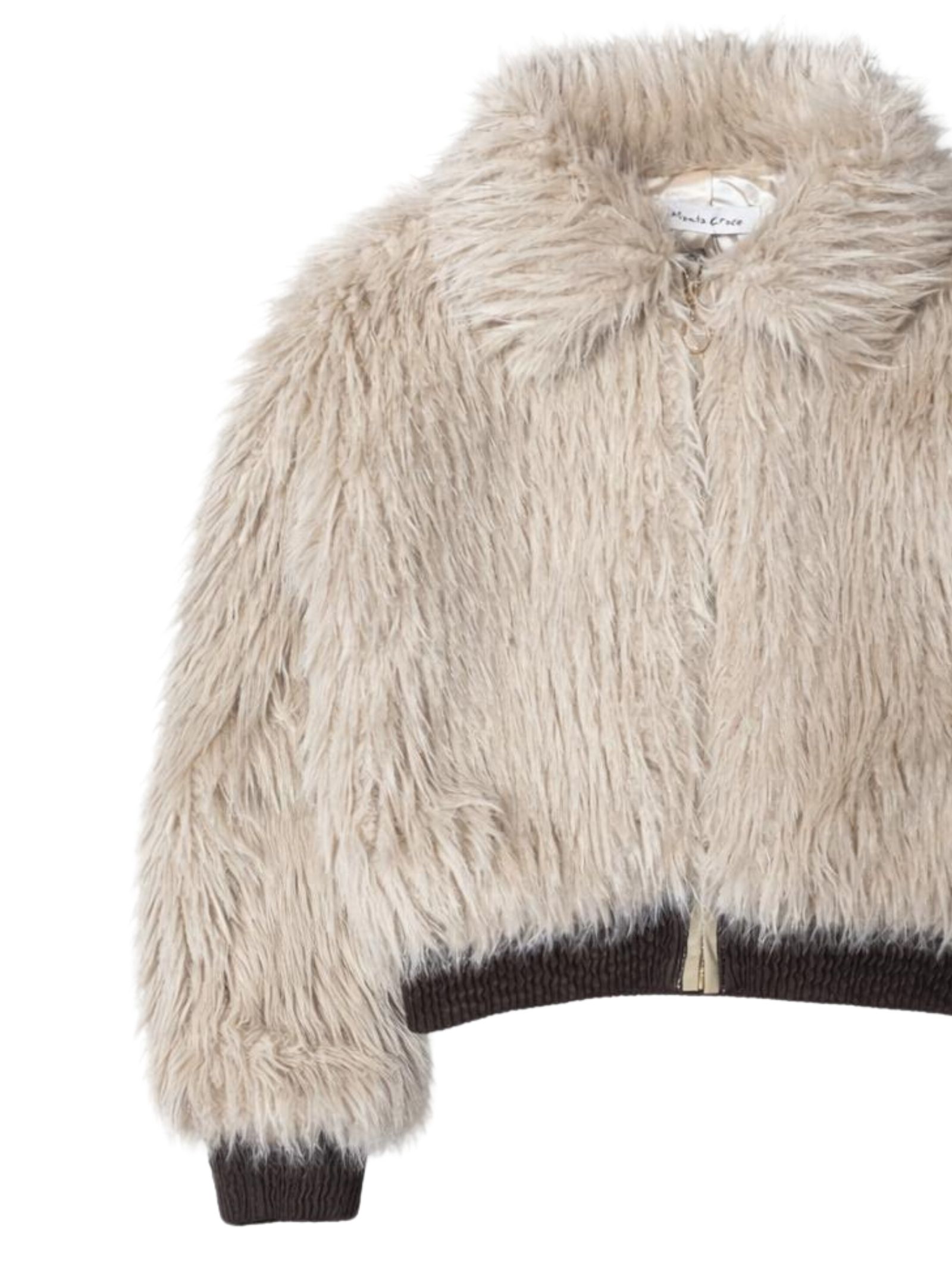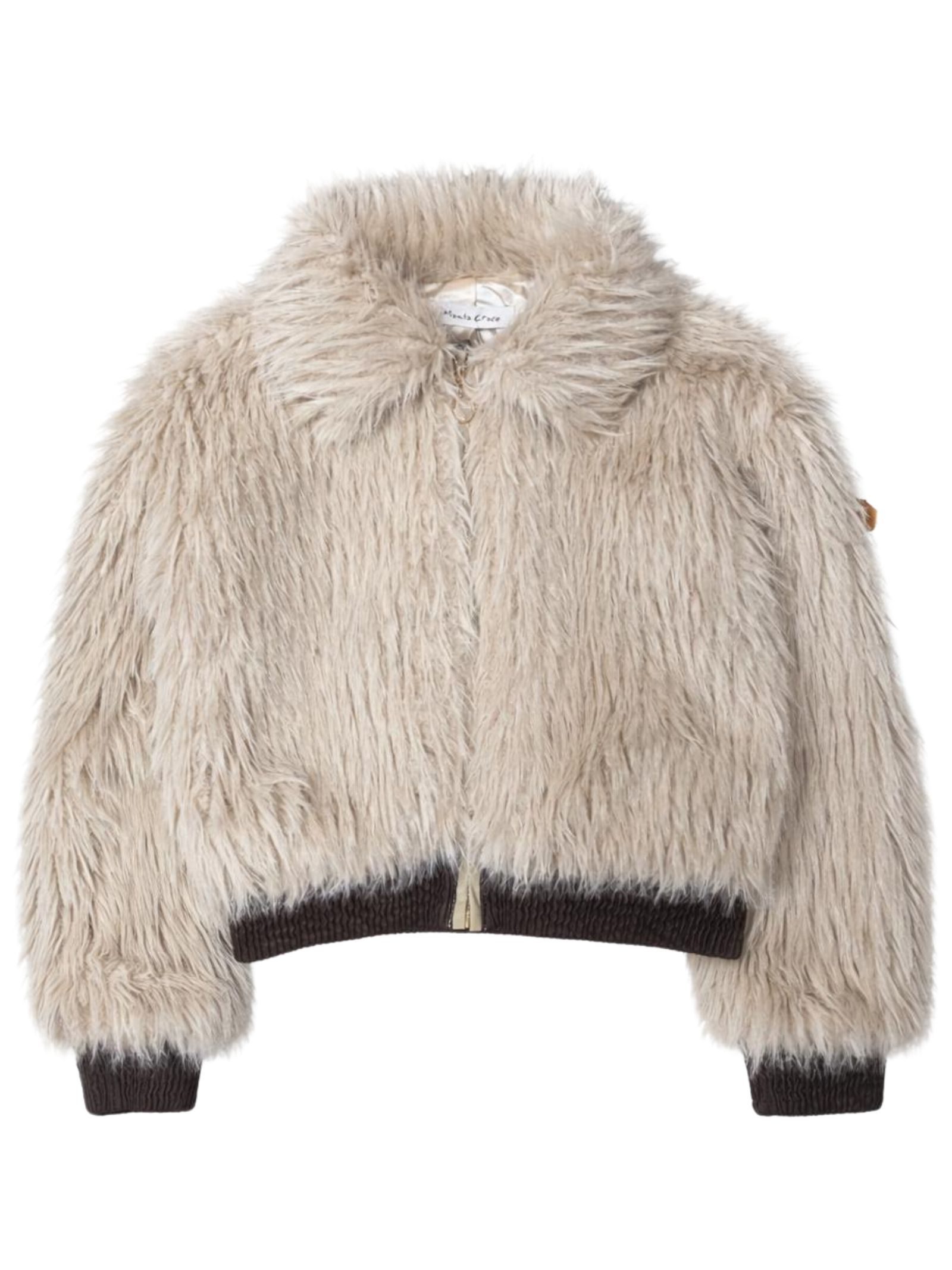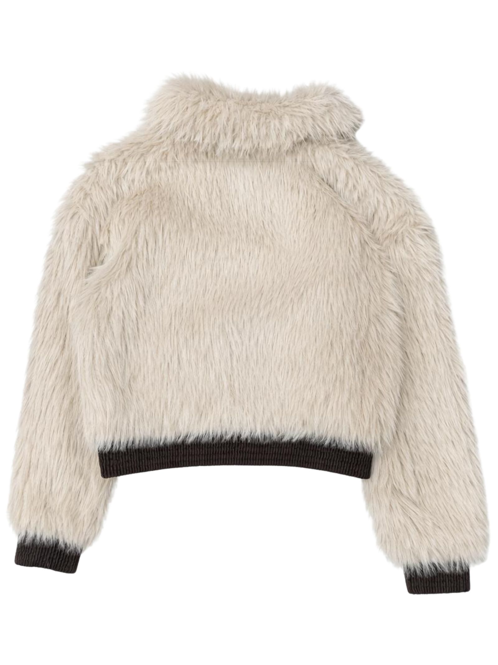 Manila Grace Kids beige jacket made of soft teddy-effect fabric, contrasting brown nylon details, slightly cropped design, elasticated hem and cuffs, two side pockets, regular fit. Composition: 100% polyester.