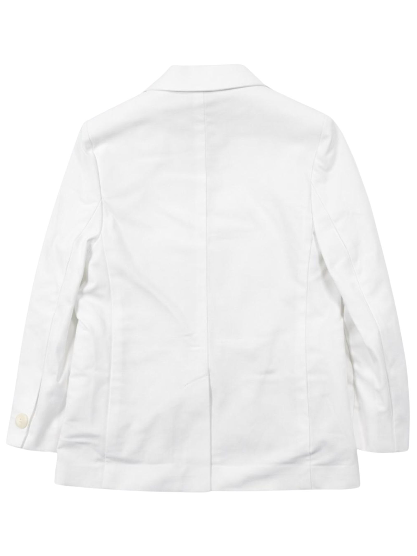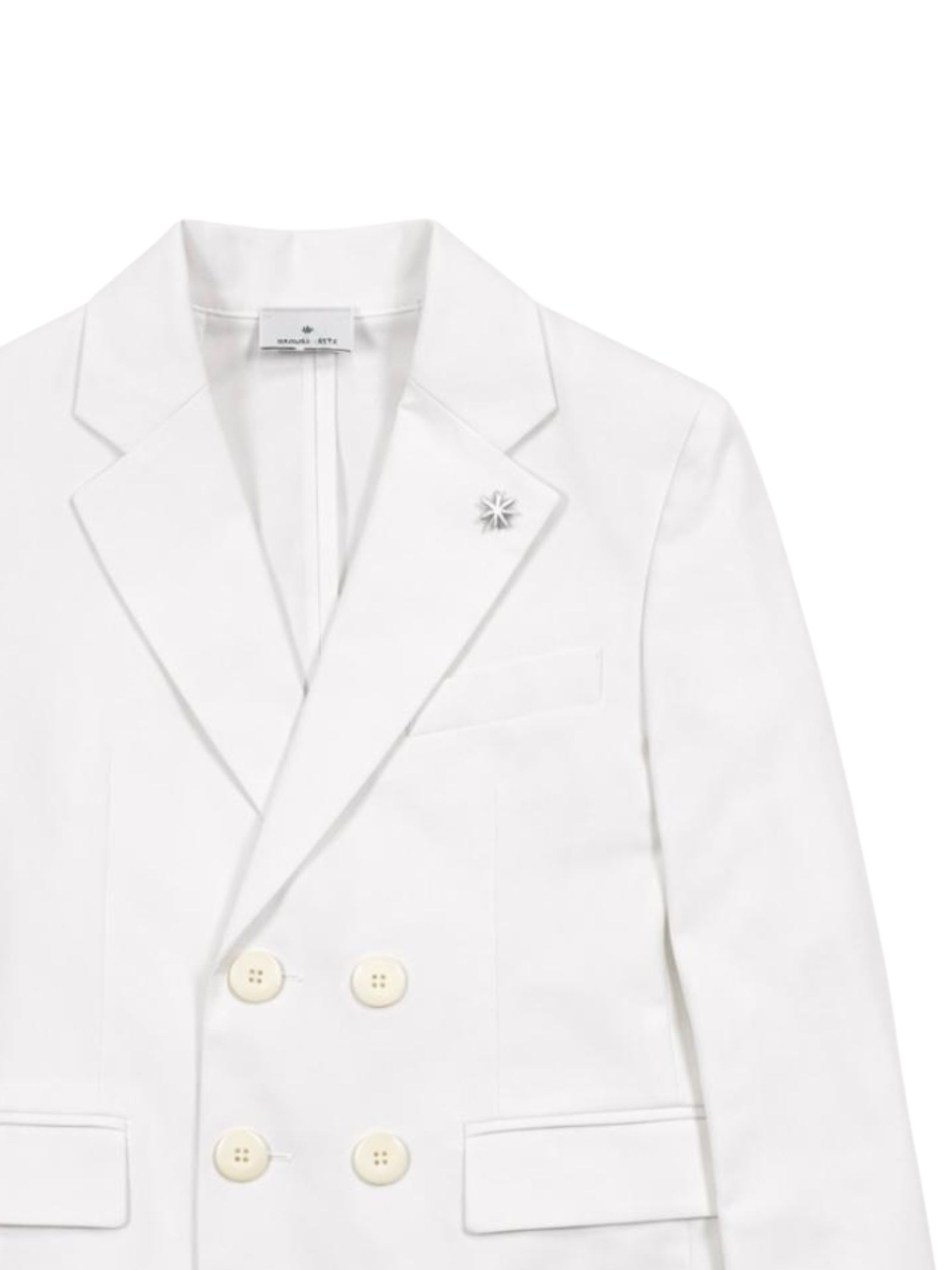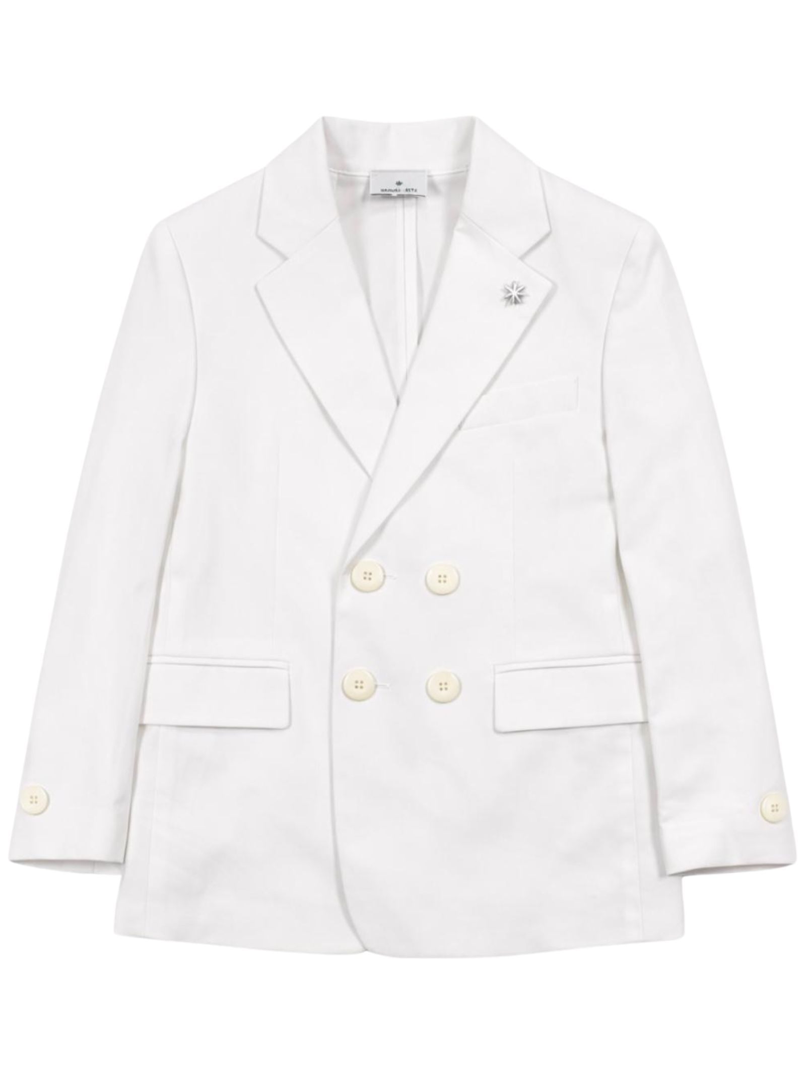 Manuel Ritz Kids white double-breasted jacket, long sleeves, two front pockets, one chest pocket, center back vent, straight cut, regular fit. Composition: 80% viscose, 20% polyester. Made in Italy.