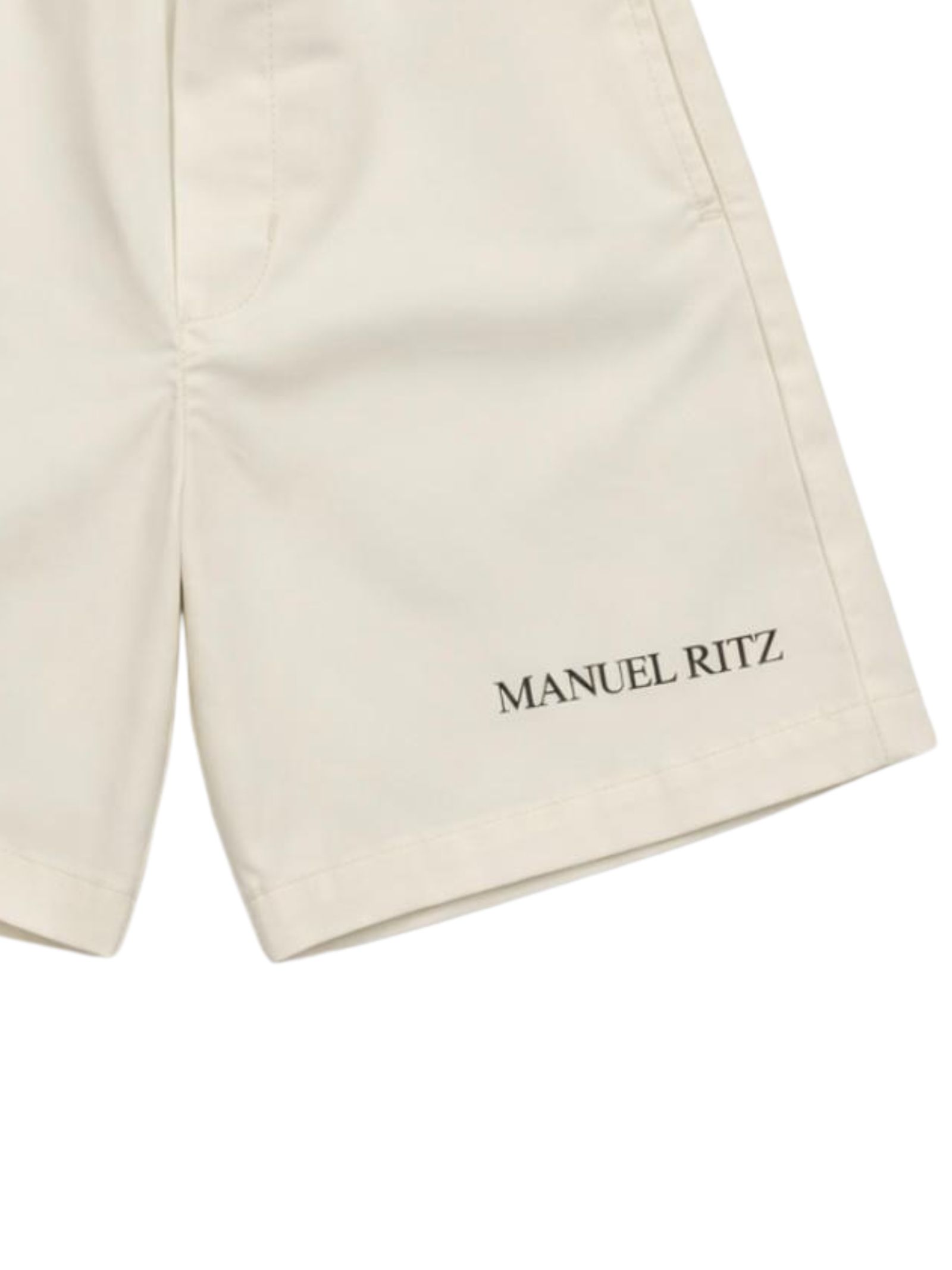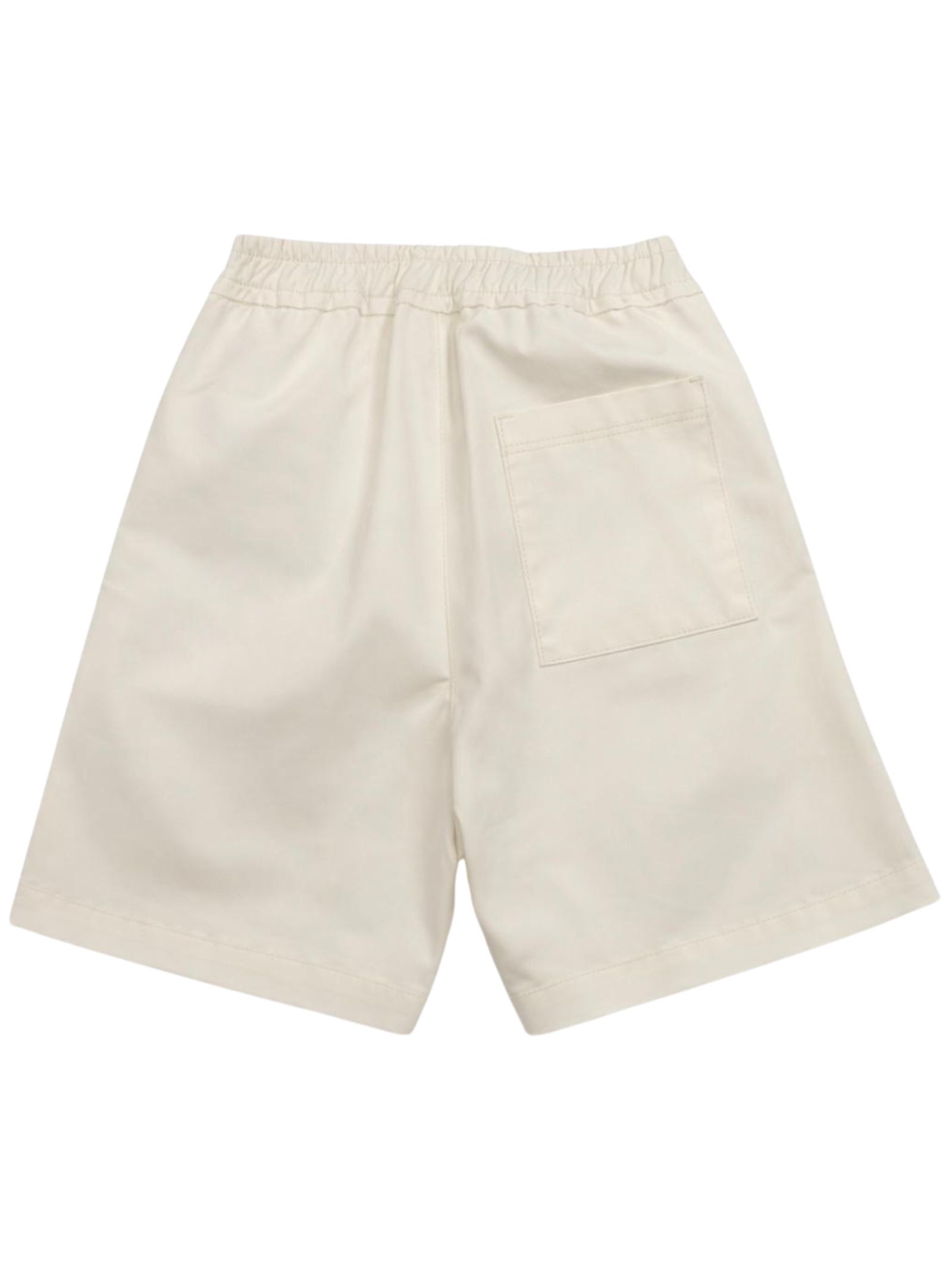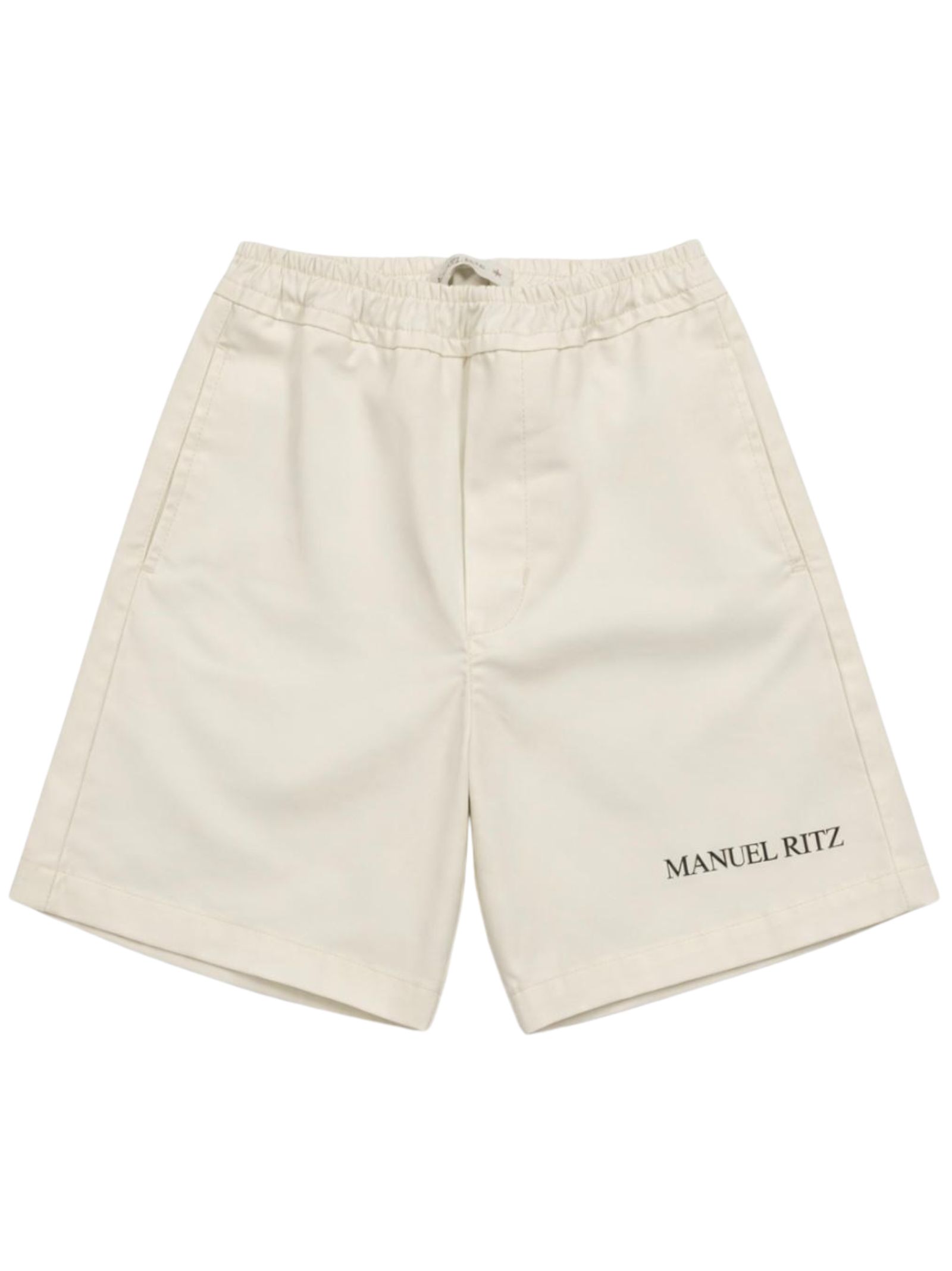 Manuel Ritz Kids cream Bermuda shorts with an elastic waistband, two side pockets, one back pocket, a contrasting logo print, and a regular fit. Composition: 97% cotton, 3% elastane. Made in Italy.