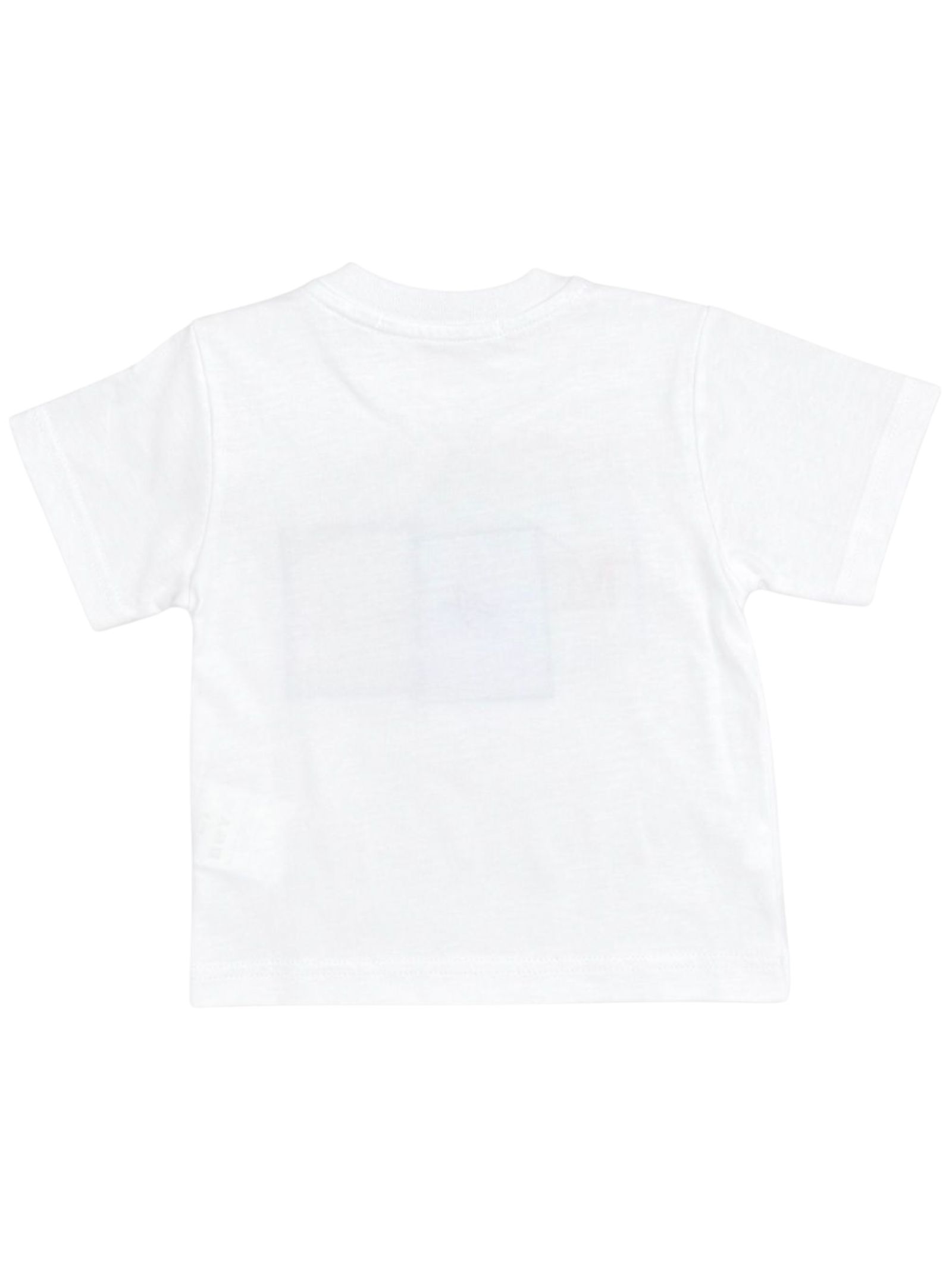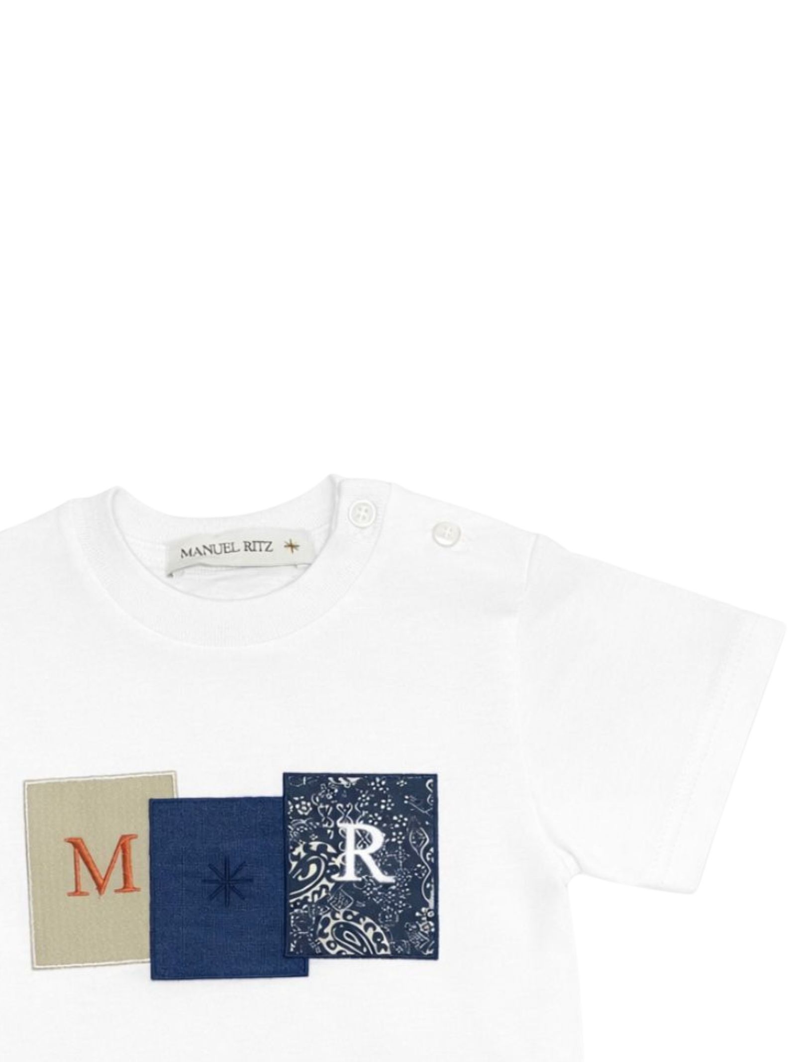 Manuel Ritz Kids white T-shirt, crew neck, short sleeves, contrasting central logo embroidery, button closure on the shoulder, straight hem, regular fit. Composition: 100% cotton. Made in Italy.