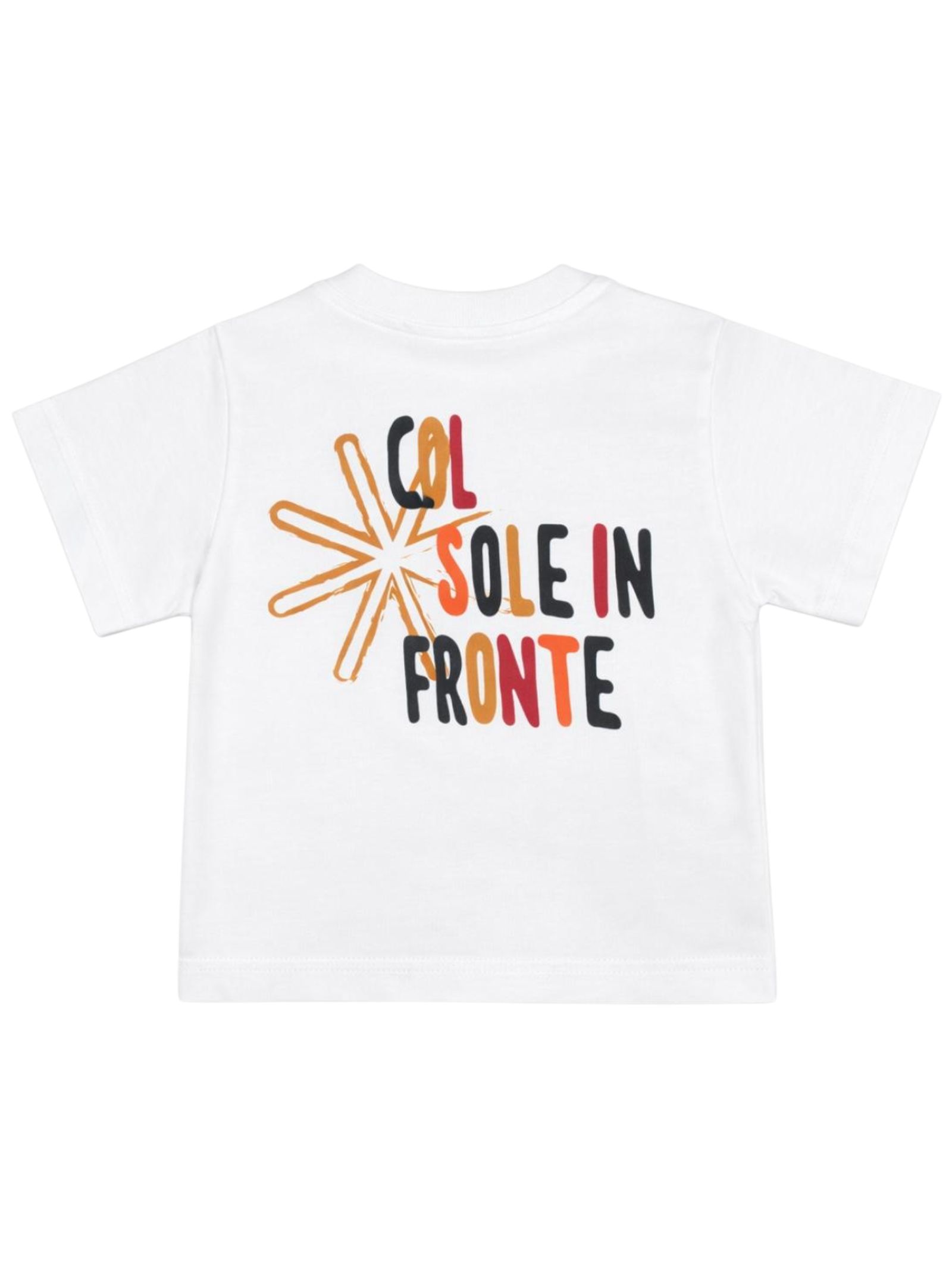 Manuel Ritz Kids white T-shirt, crew neck, short sleeves, contrasting print on both sides, button closure at the shoulder, straight hem, regular fit. Composition: 100% cotton. Made in Italy.