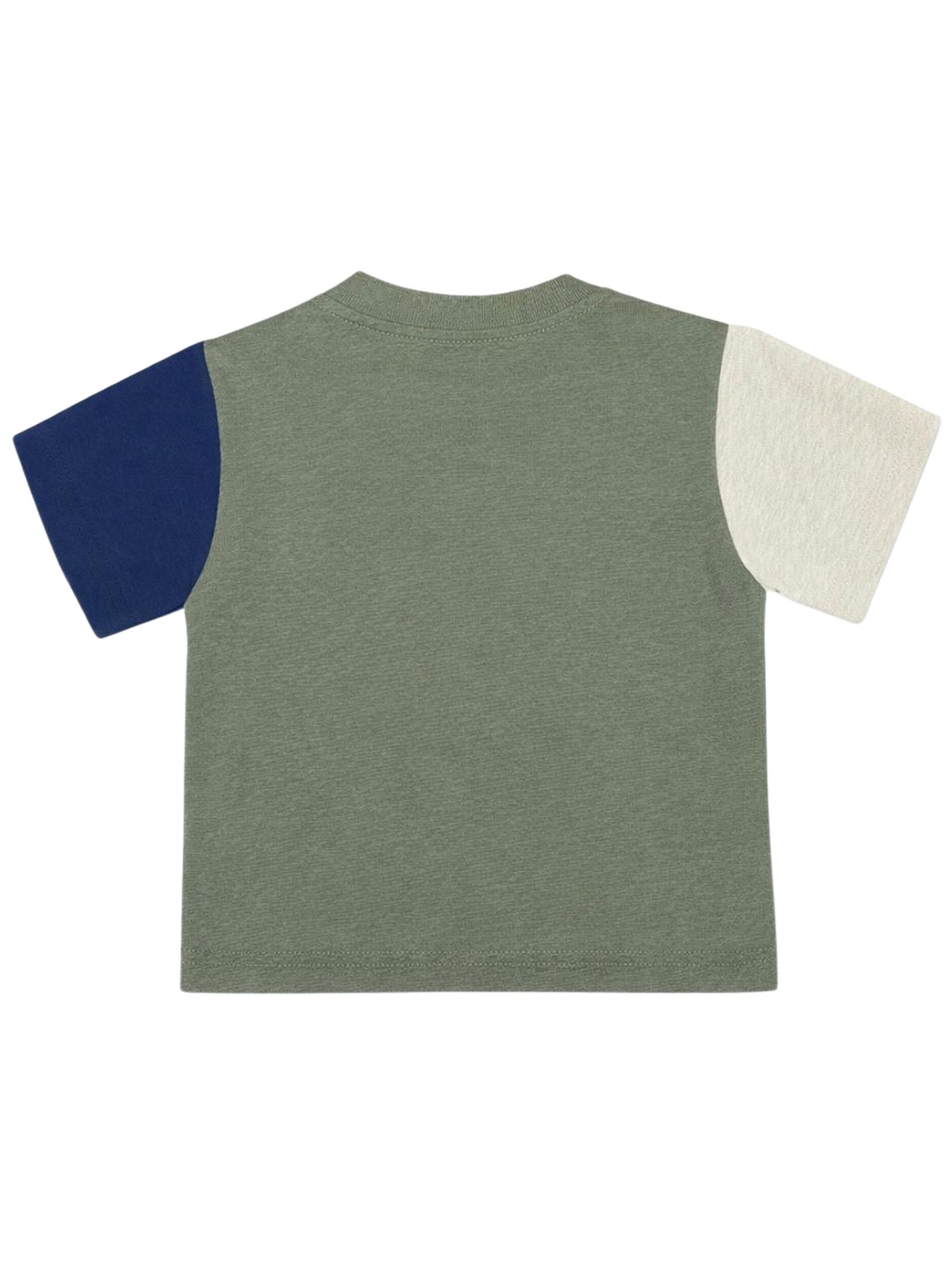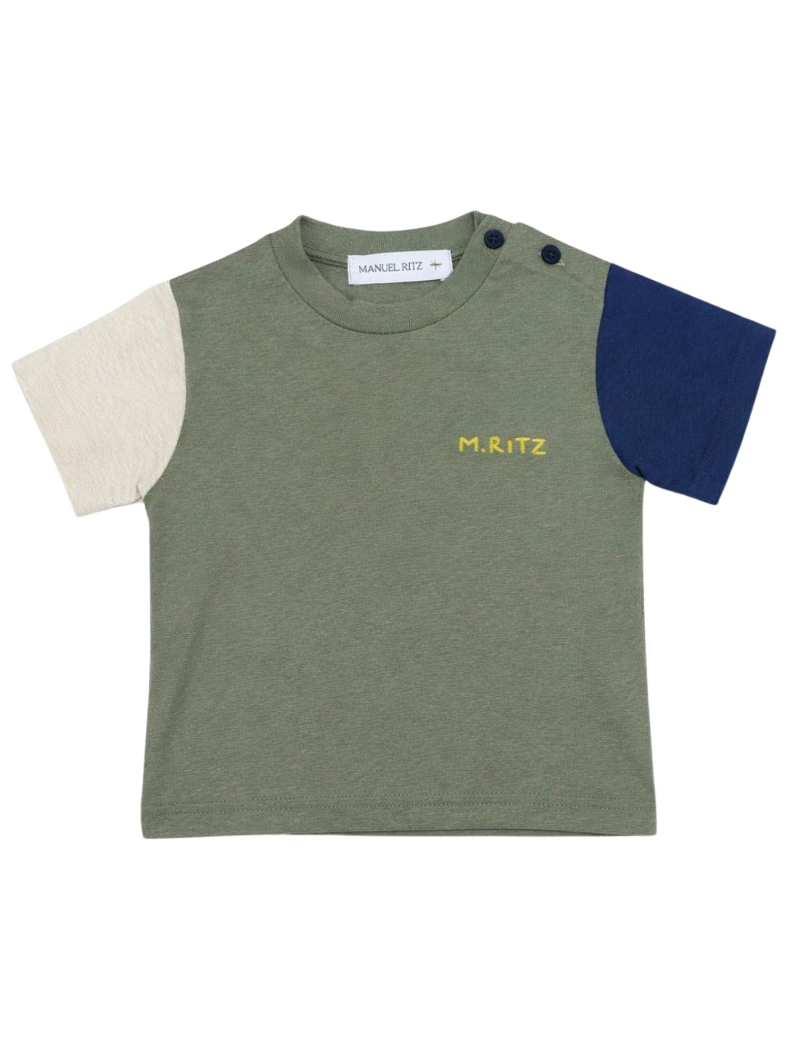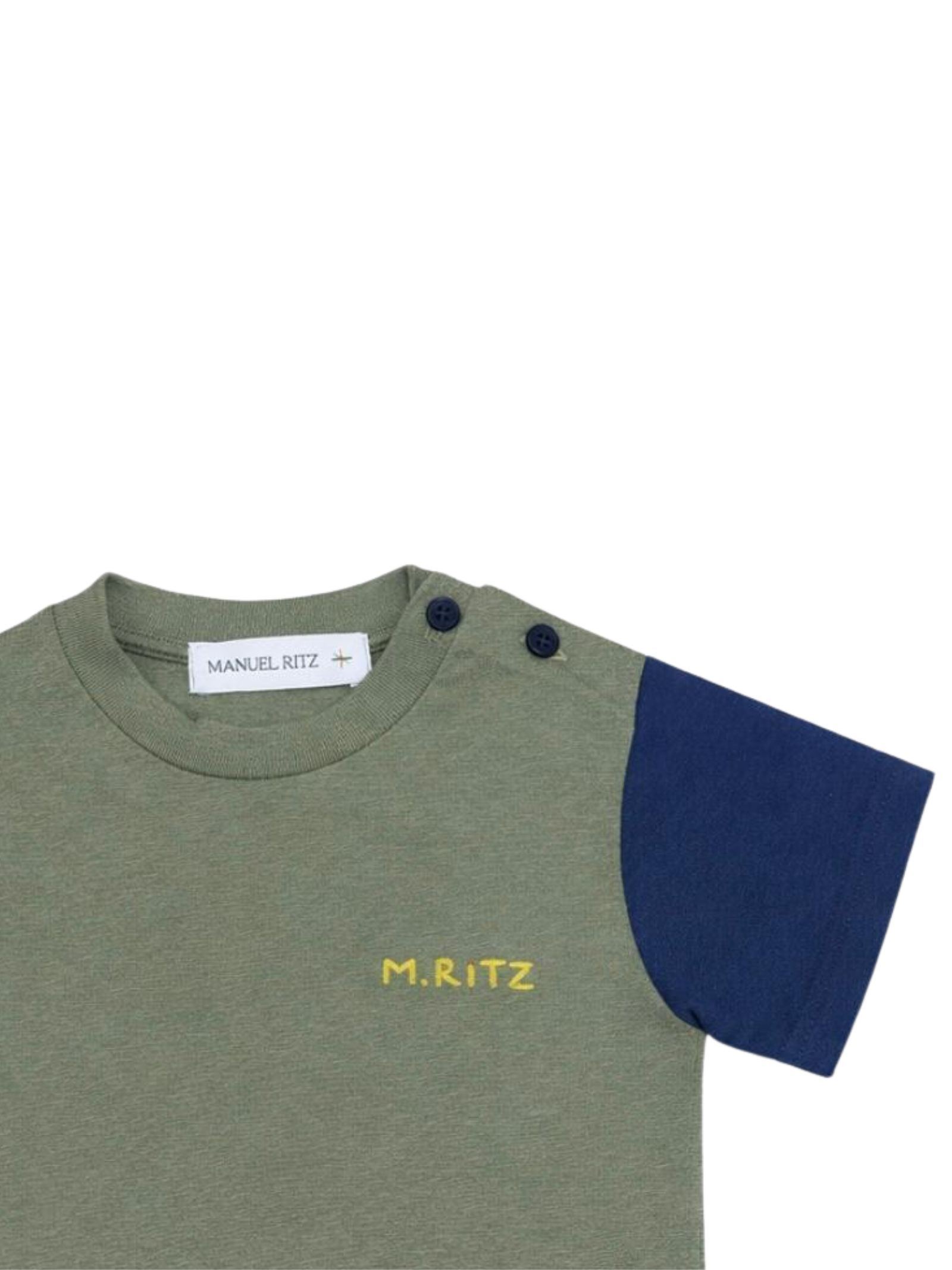 Manuel Ritz Kids green T-shirt with contrasting blue/beige details, crew neck, short sleeves, logo embroidery, button closure on the shoulder, straight hem, regular fit. Composition: 55% linen, 45% cotton. Made in Italy.
