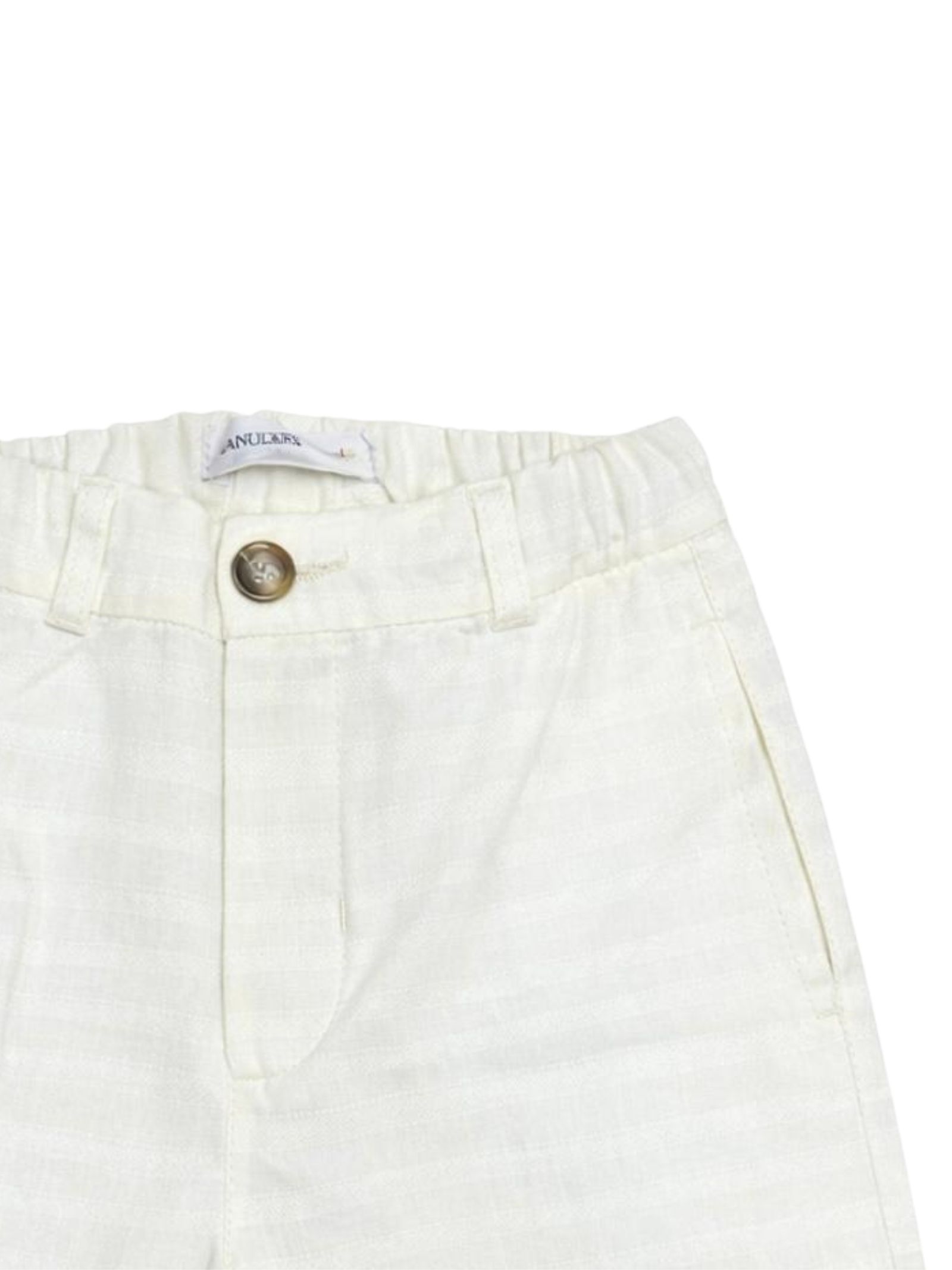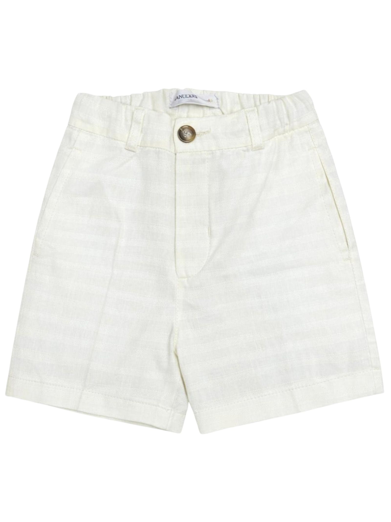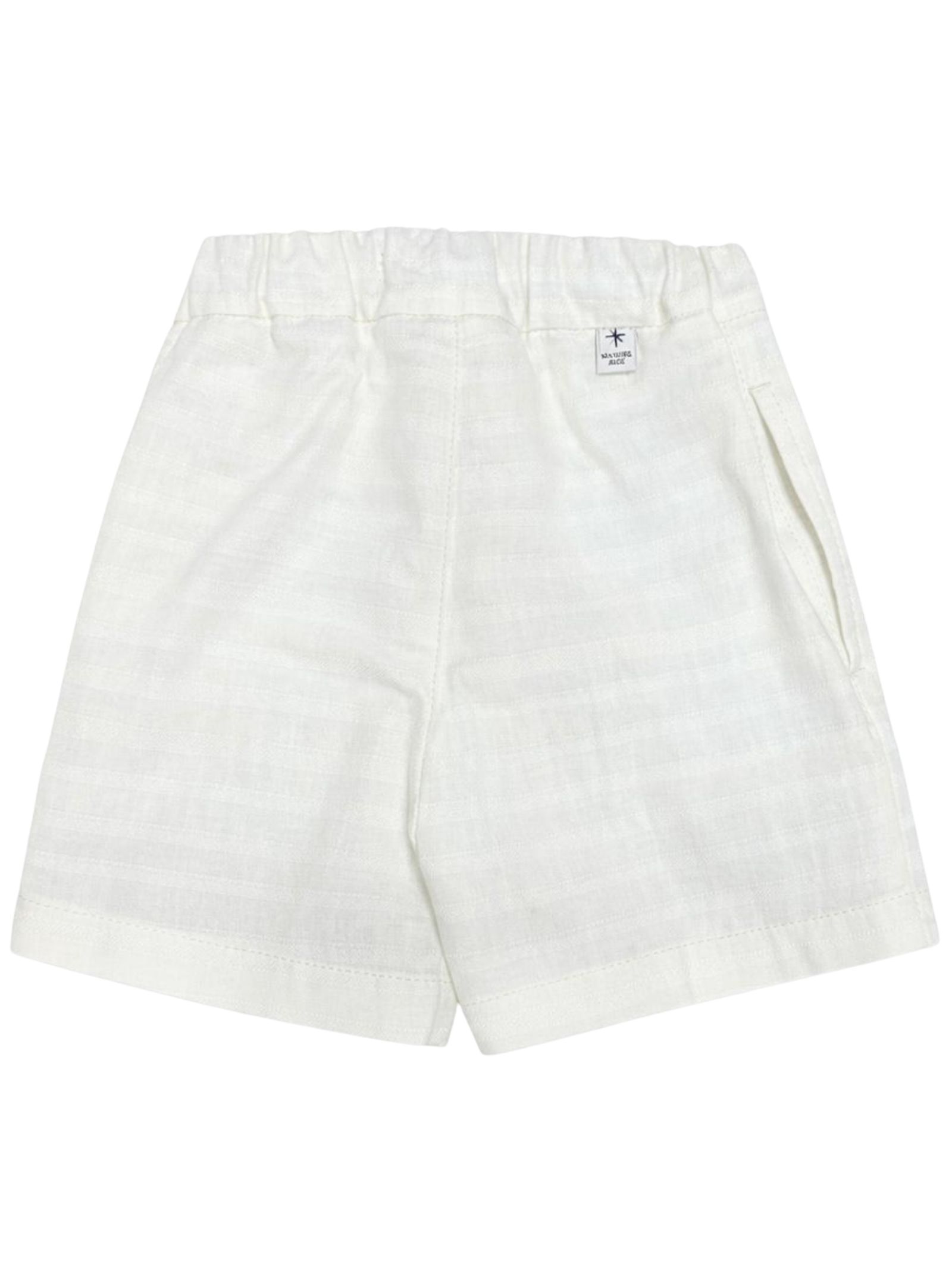 Manuel Ritz Kids cream-colored Bermuda shorts, made from a soft linen and cotton blend, feature an elastic waistband at the back, a button and zip closure, two side pockets, a logo patch, and a regular fit. Composition: 50% cotton, 50% linen. Made in Italy.