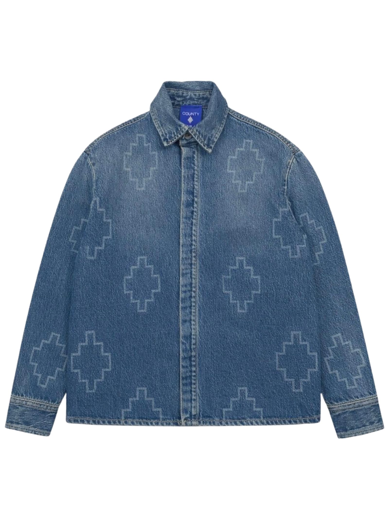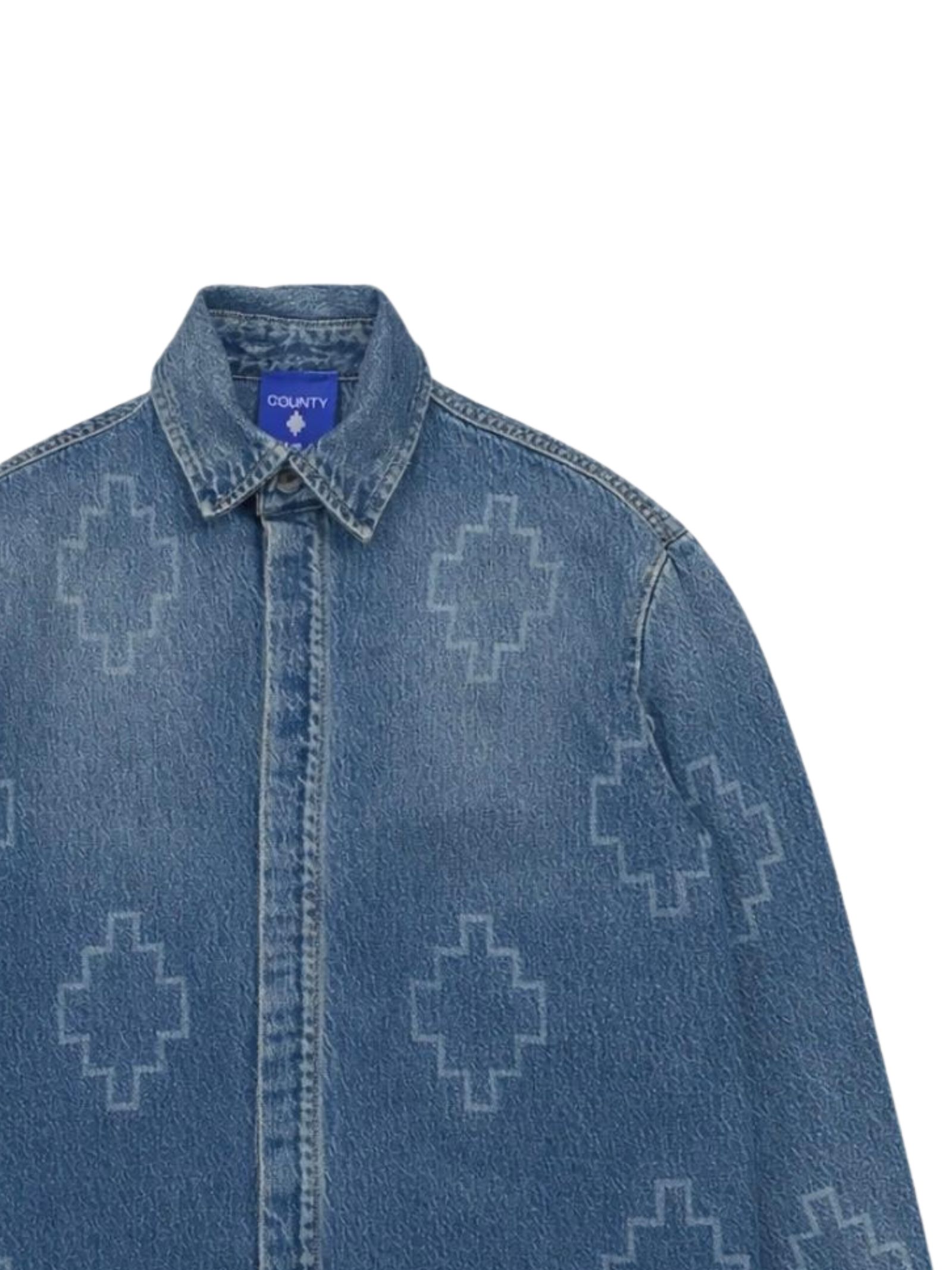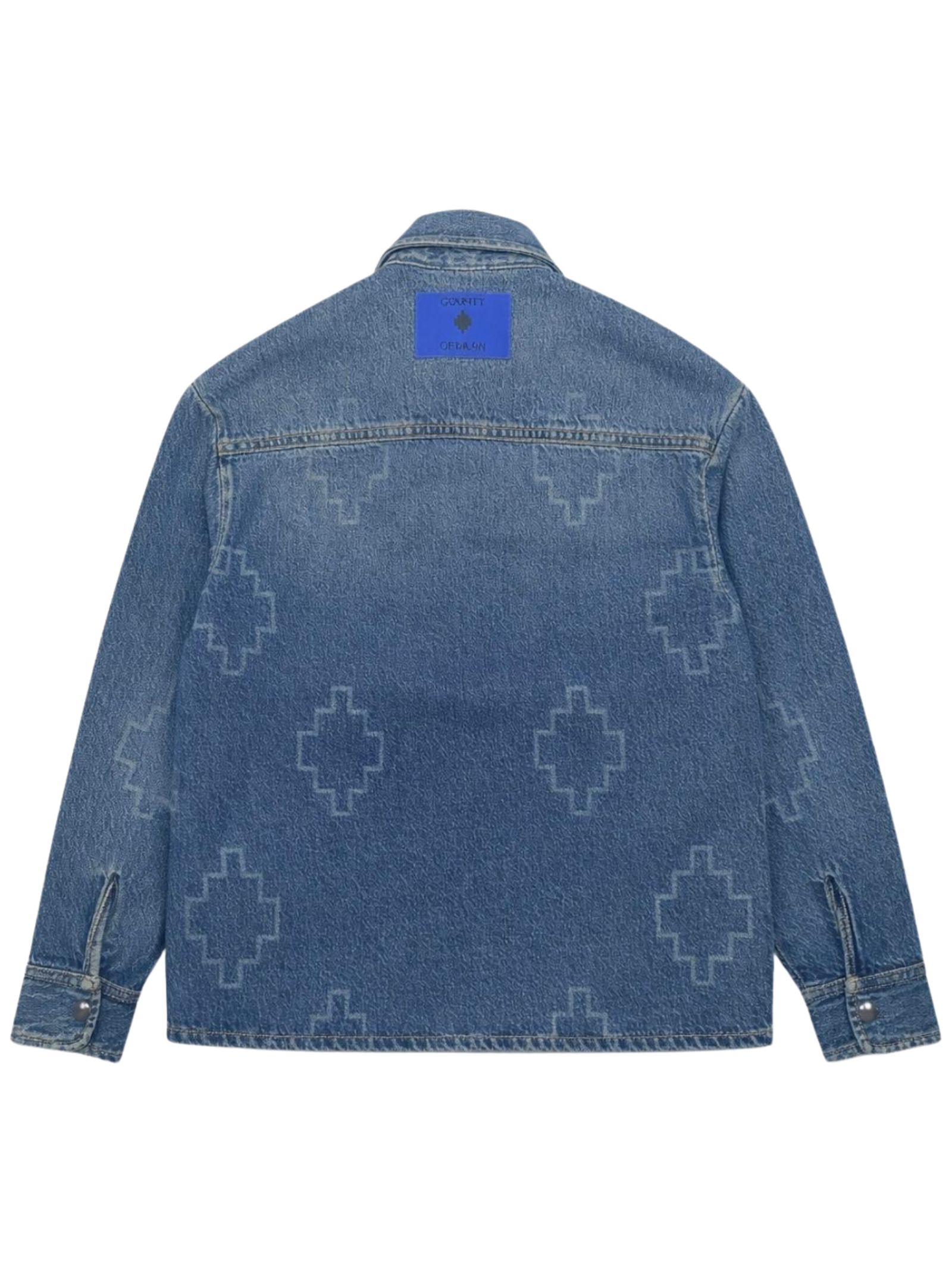 Marcelo Burlon Kids cotton denim jacket, contrasting all-over logo print, long sleeves, snap buttons, logo patch on the back, regular fit. Composition: 100% cotton. Made in Italy.