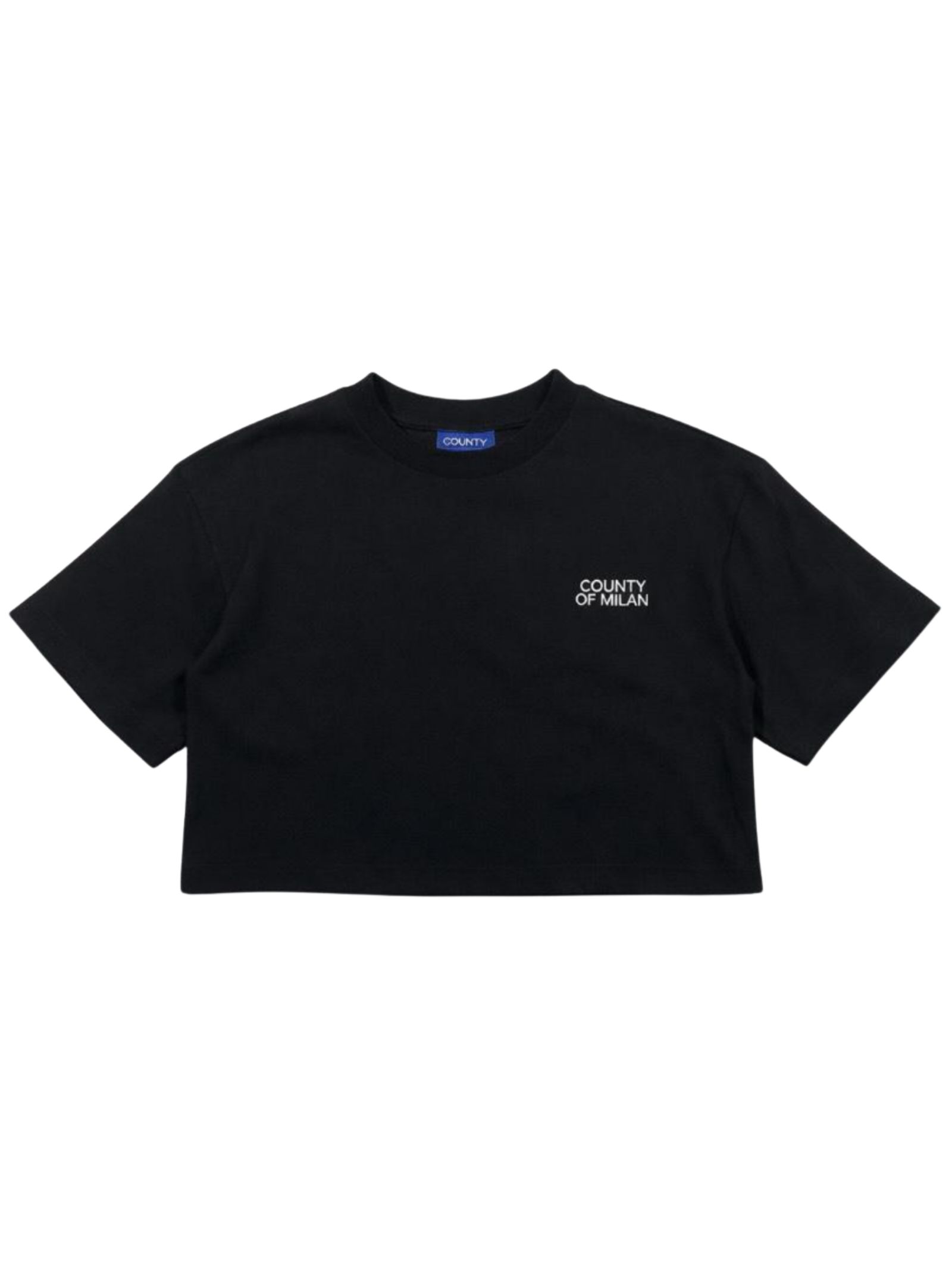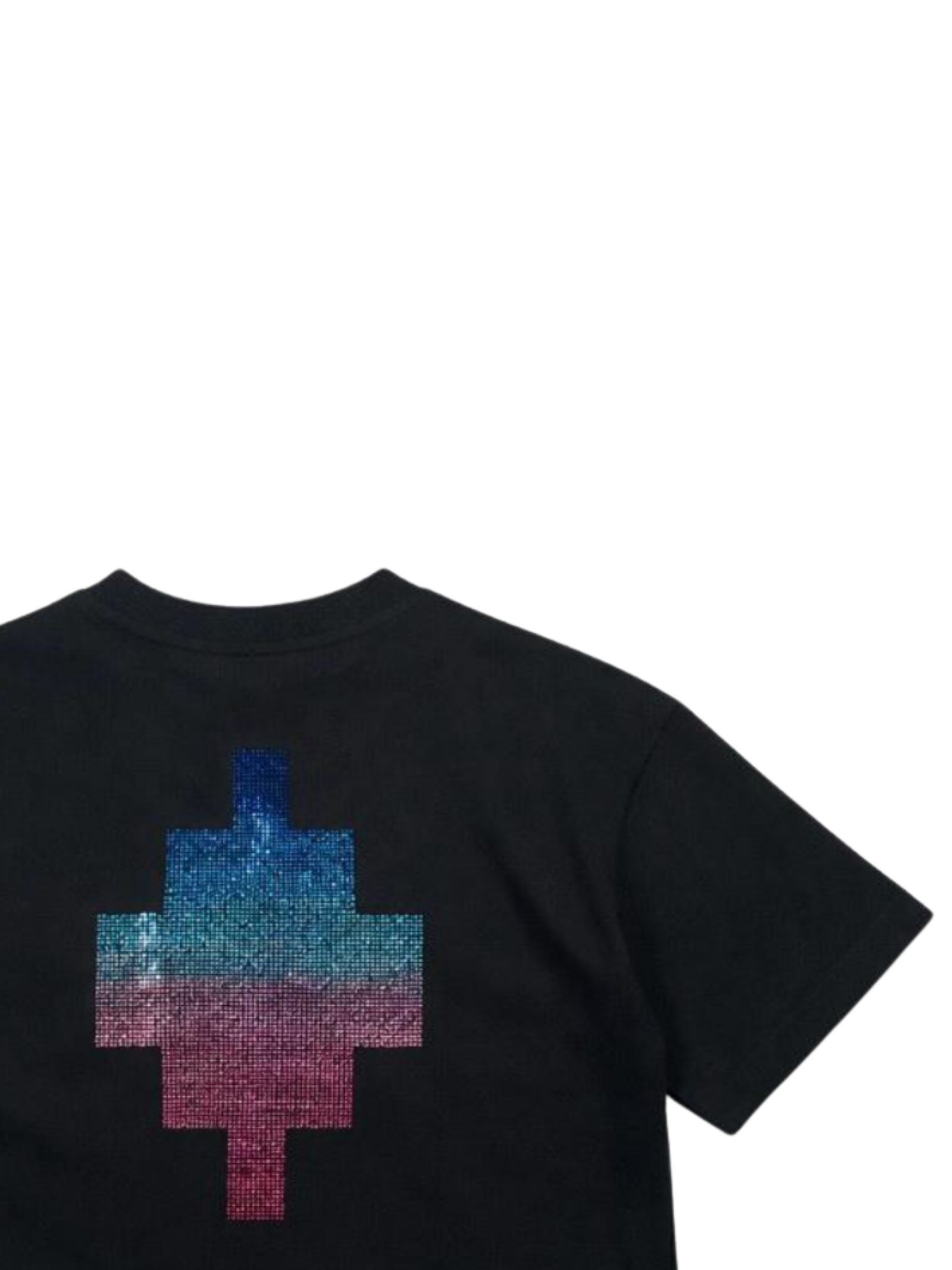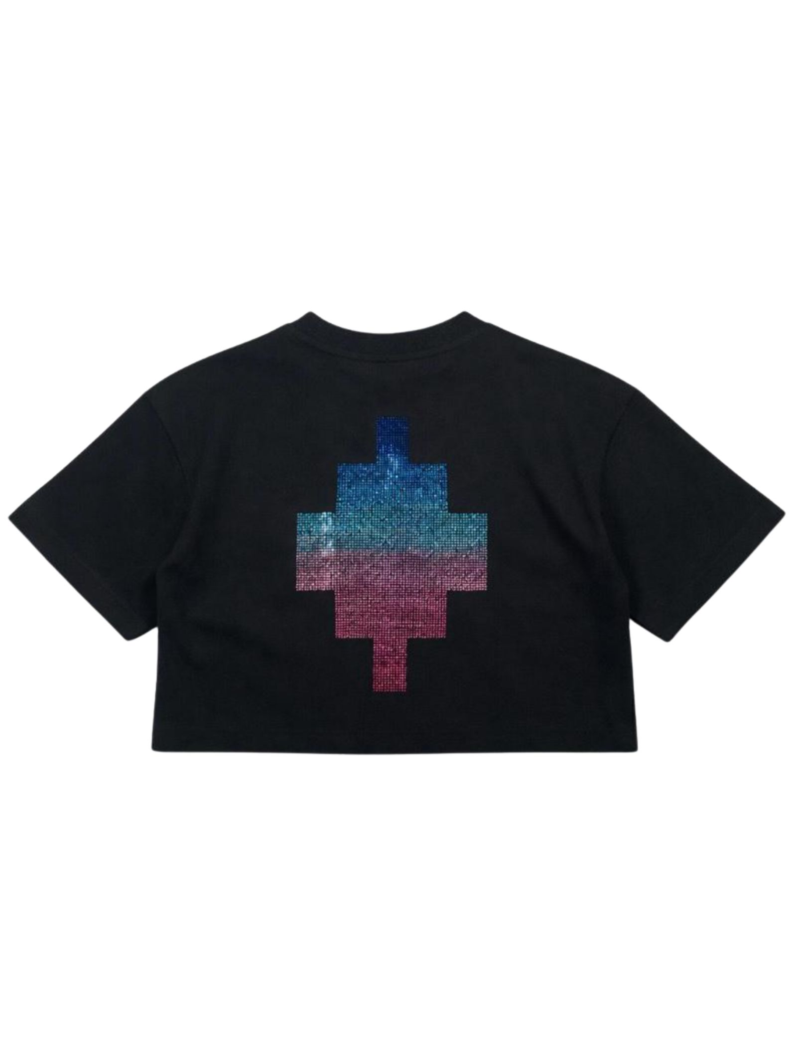 Marcelo Burlon Kids black cropped T-shirt with crew neck, short sleeves, contrasting multicolor rhinestone print on the back, straight hem, loose fit. Composition: 100% cotton. Made in Italy.