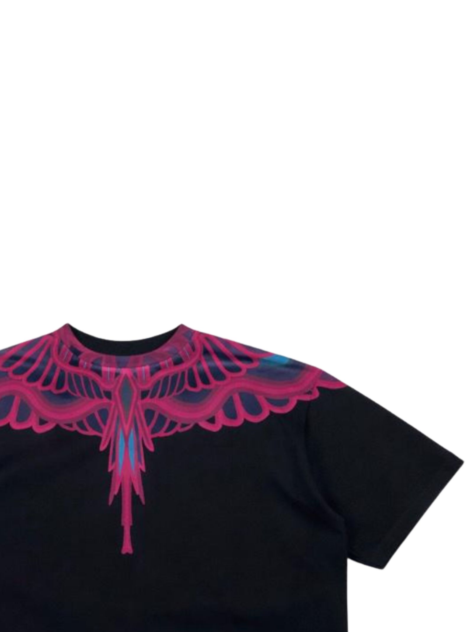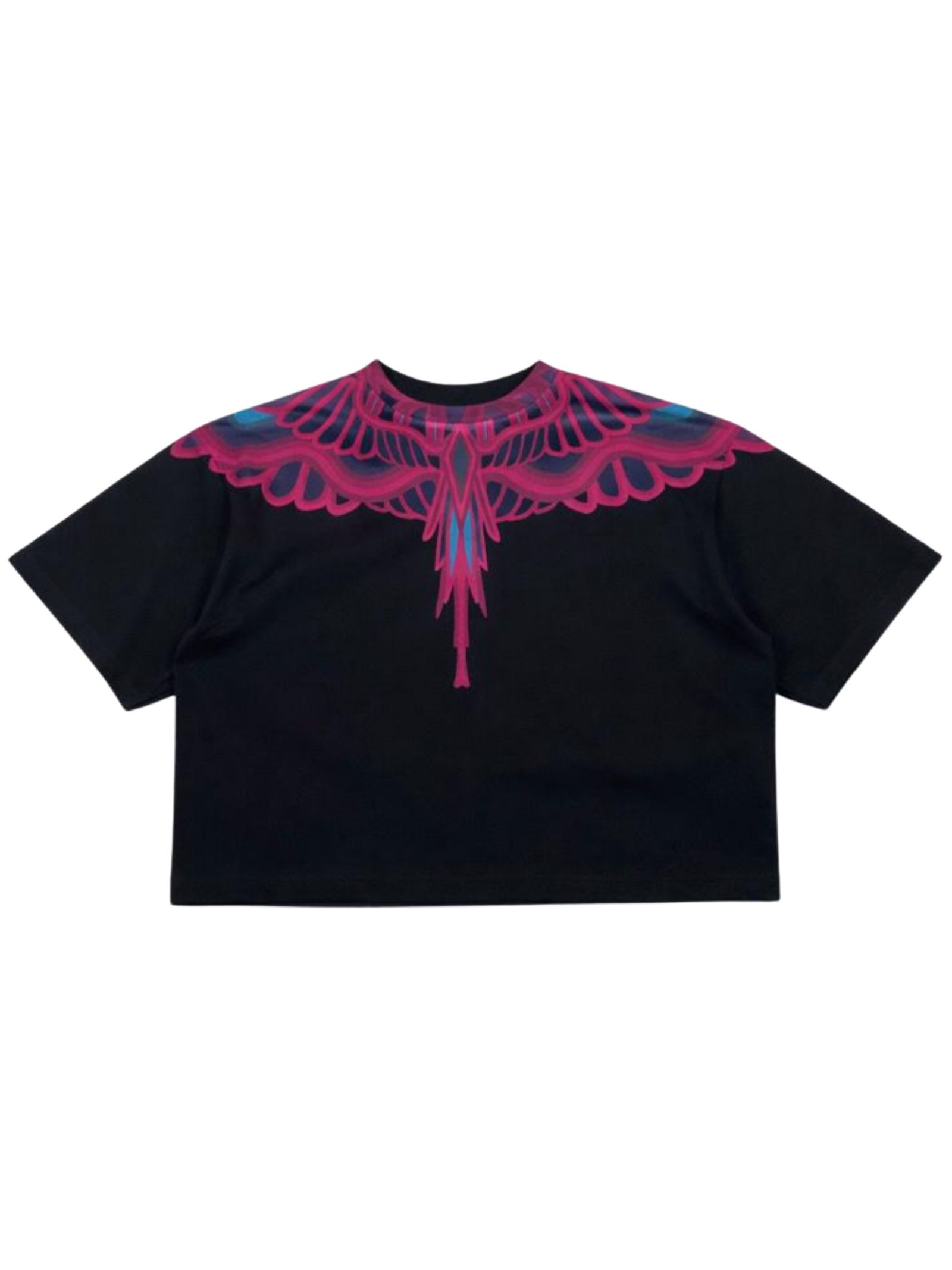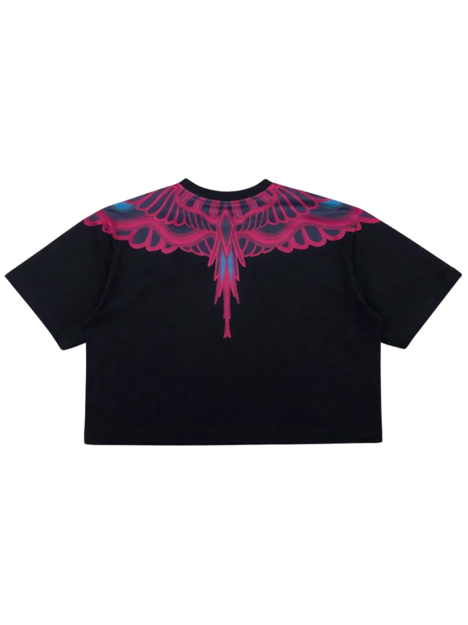 Marcelo Burlon Kids black cropped T-shirt with crew neck, short sleeves, contrasting print on both sides, straight hem, loose fit. Composition: 100% cotton.