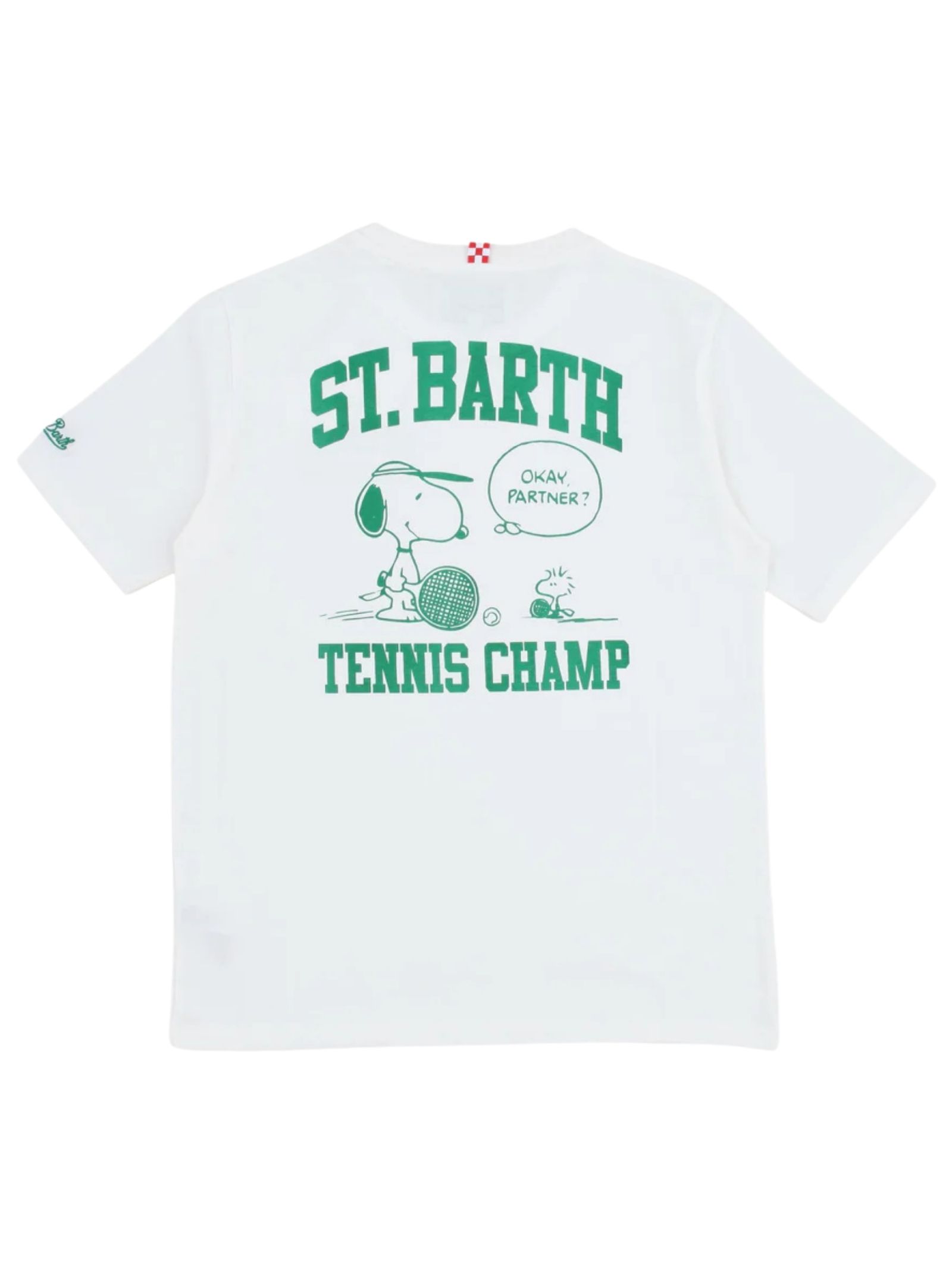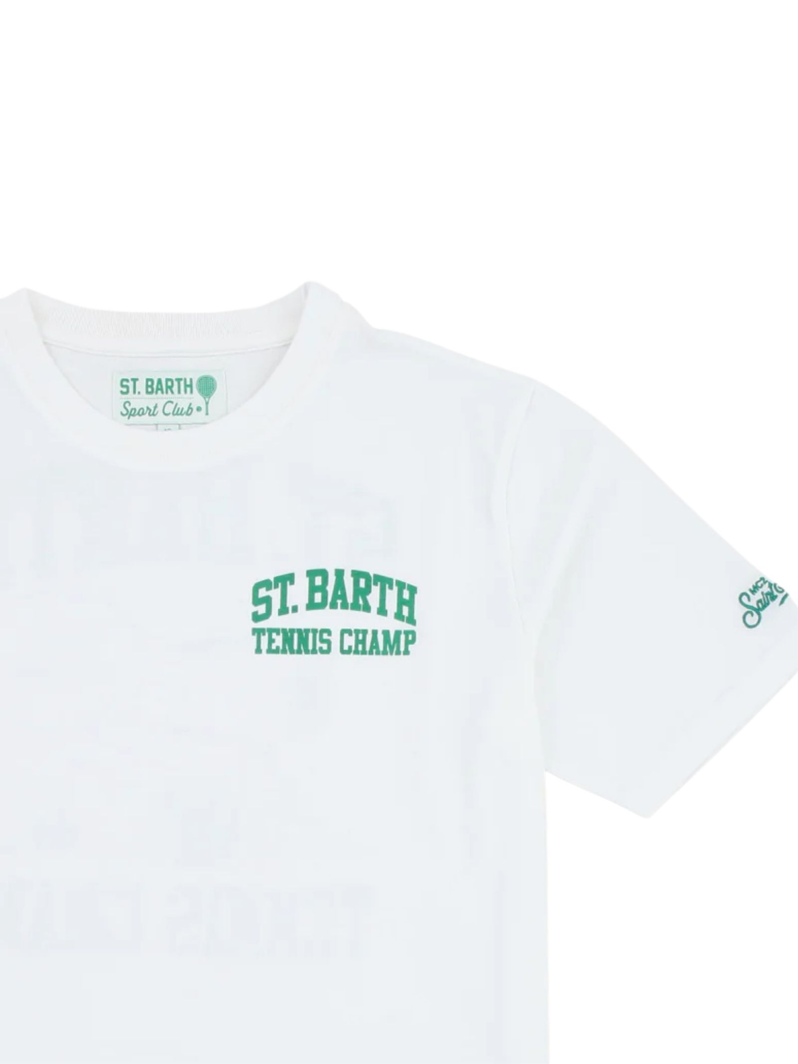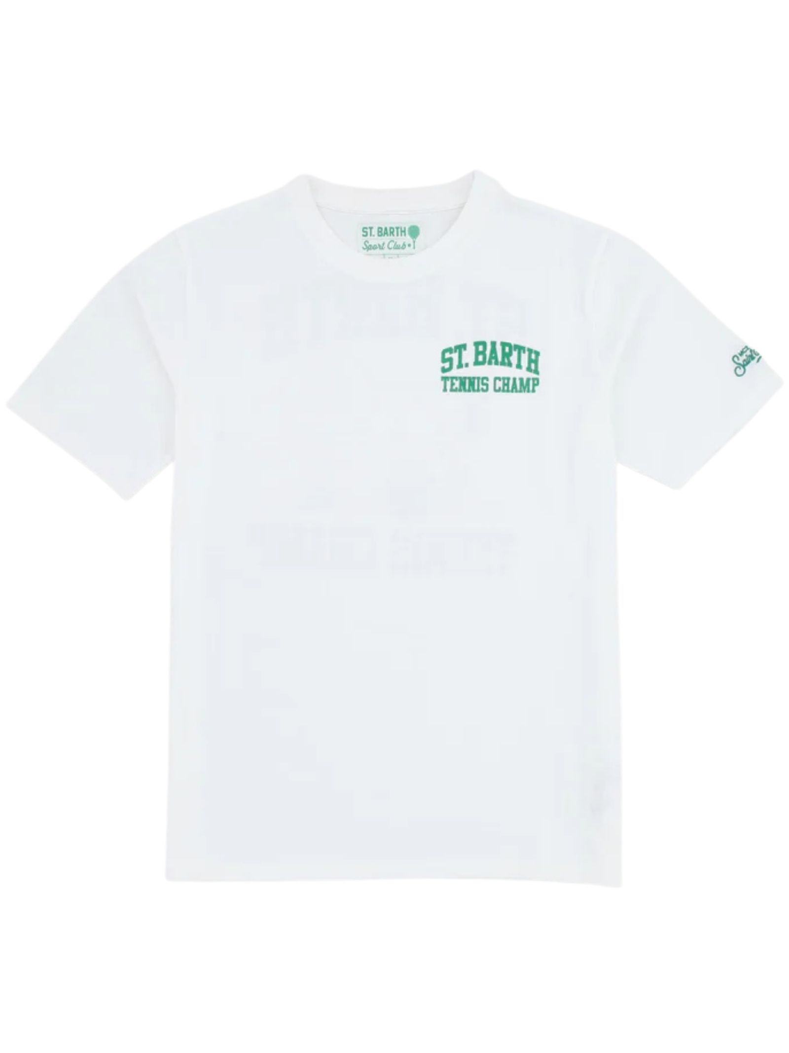 MC2 Saint Barth Kids white cotton T-shirt, crew neck, short sleeves, contrasting green print on the chest and back, regular fit. Composition: 100% cotton.