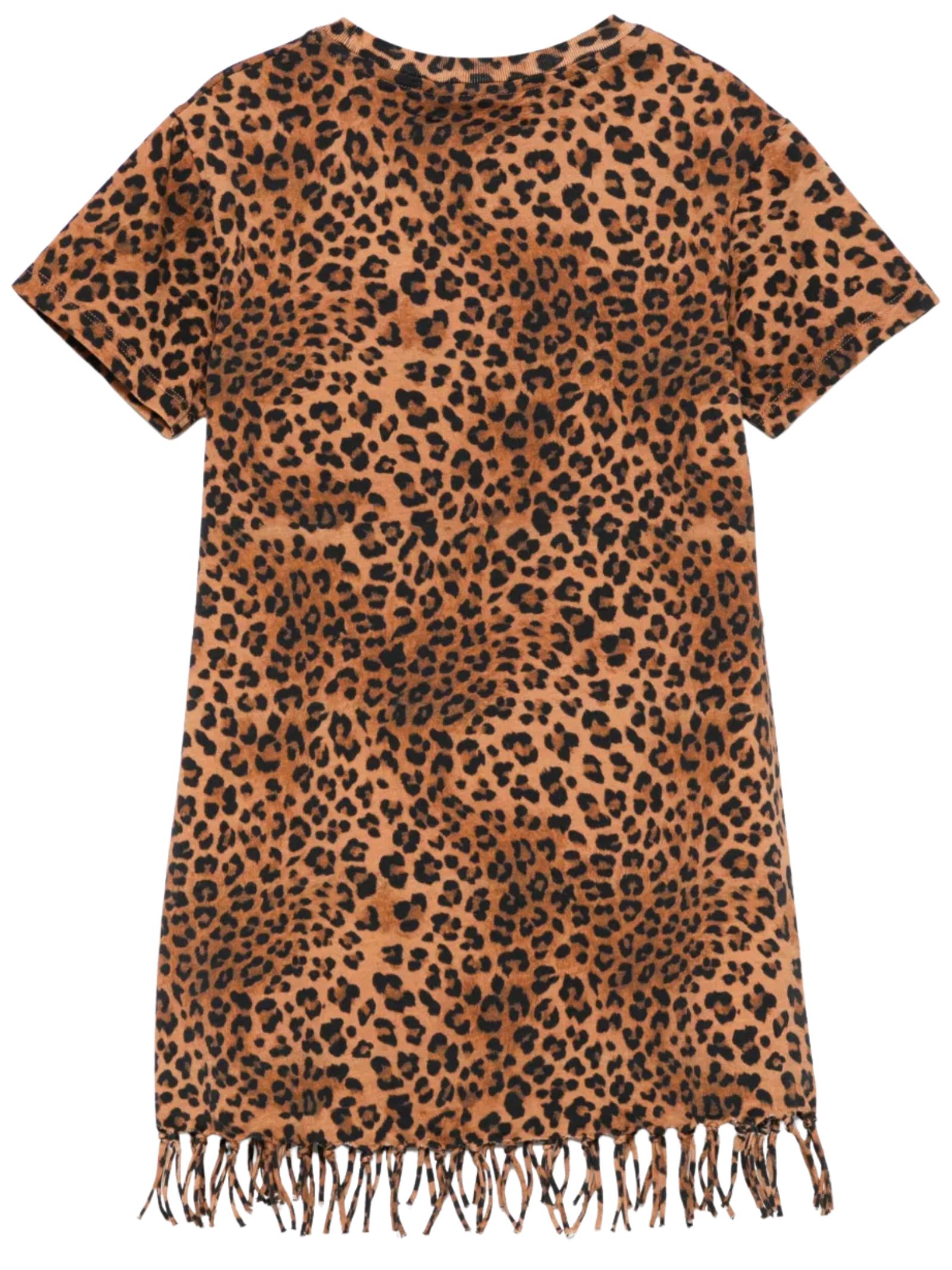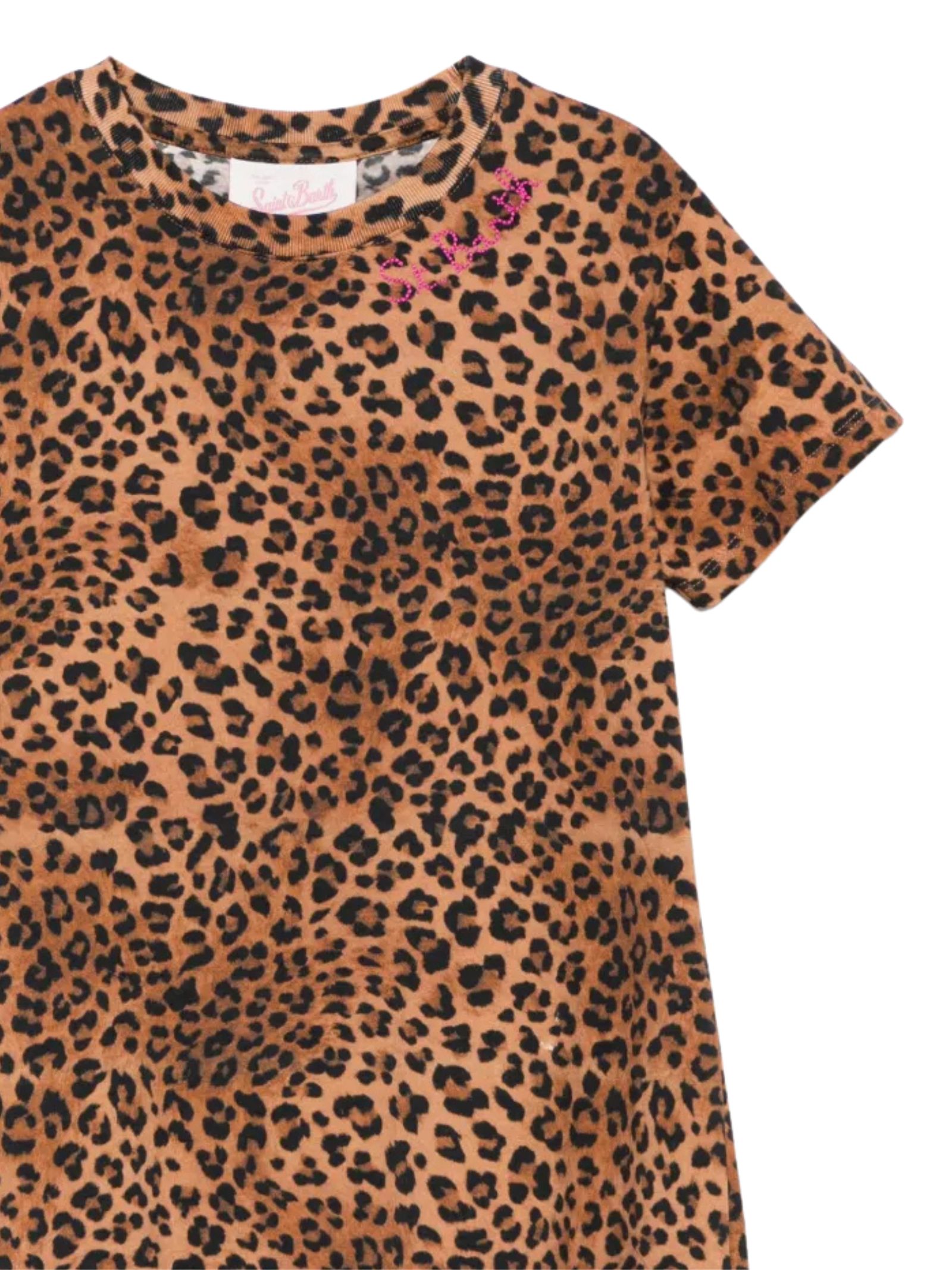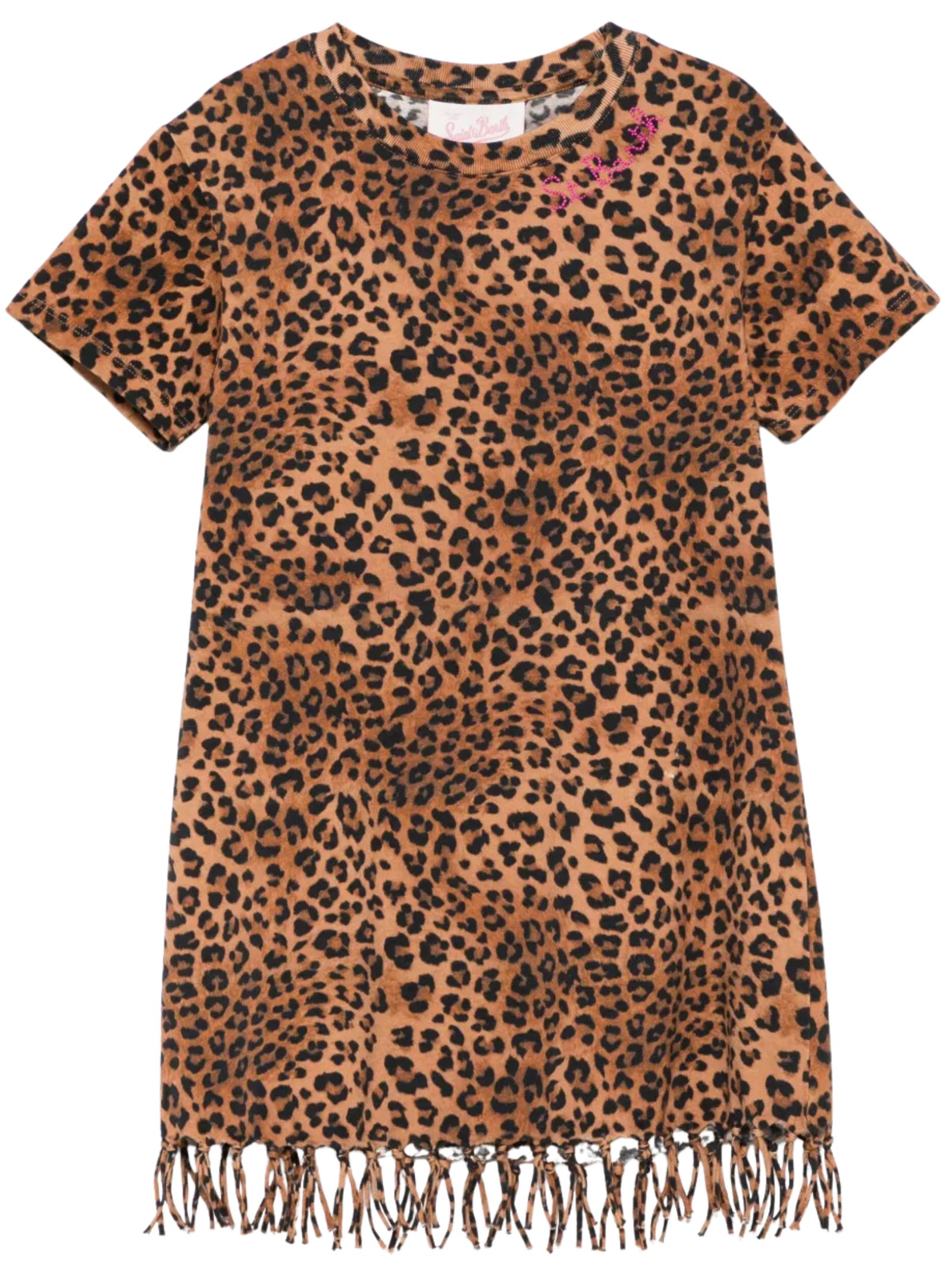MC2 Saint Barth Kids leopard print dress, made of cotton, crew neck design, short sleeves, contrasting logo embroidery, fringed hem, flared design. Composition: 100% cotton