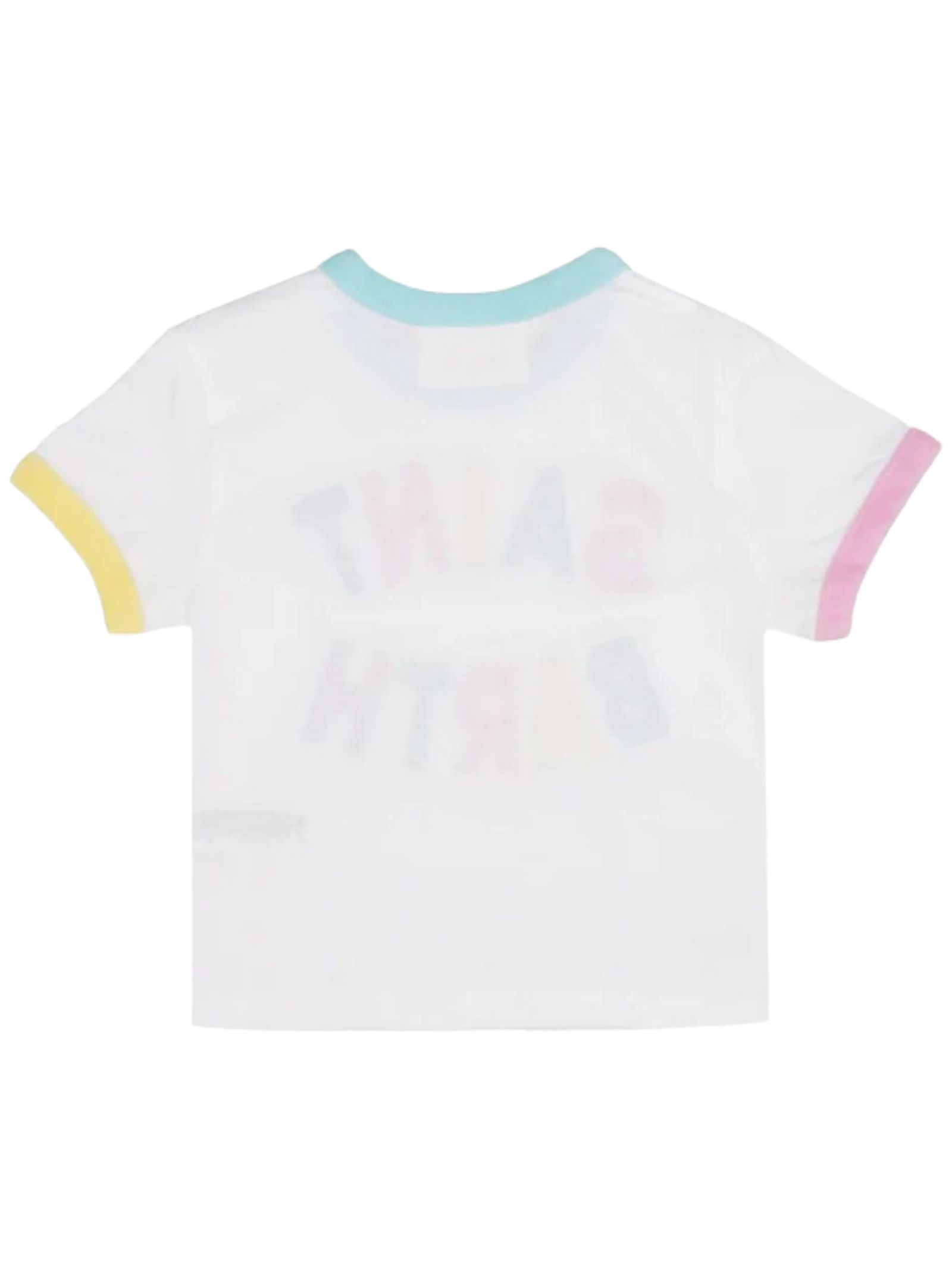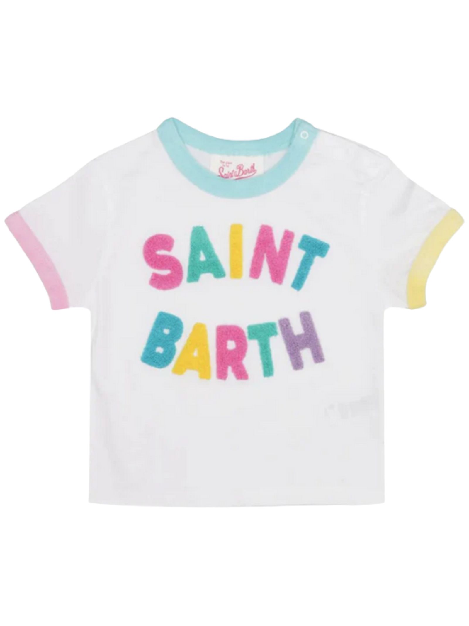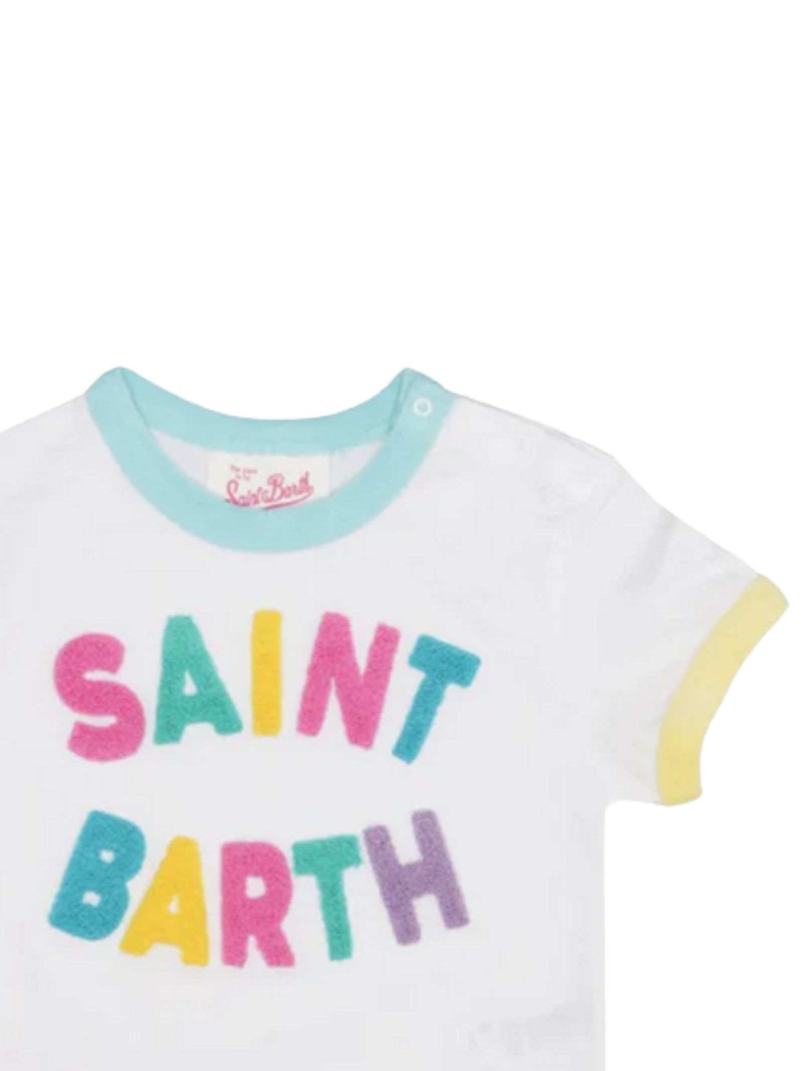MC2 Saint Barth Kids white t-shirt with multicolored contrasting trim, made of cotton, crew neck, short sleeves, multicolored terry St. Barth patch, regular fit. Composition: 100% cotton