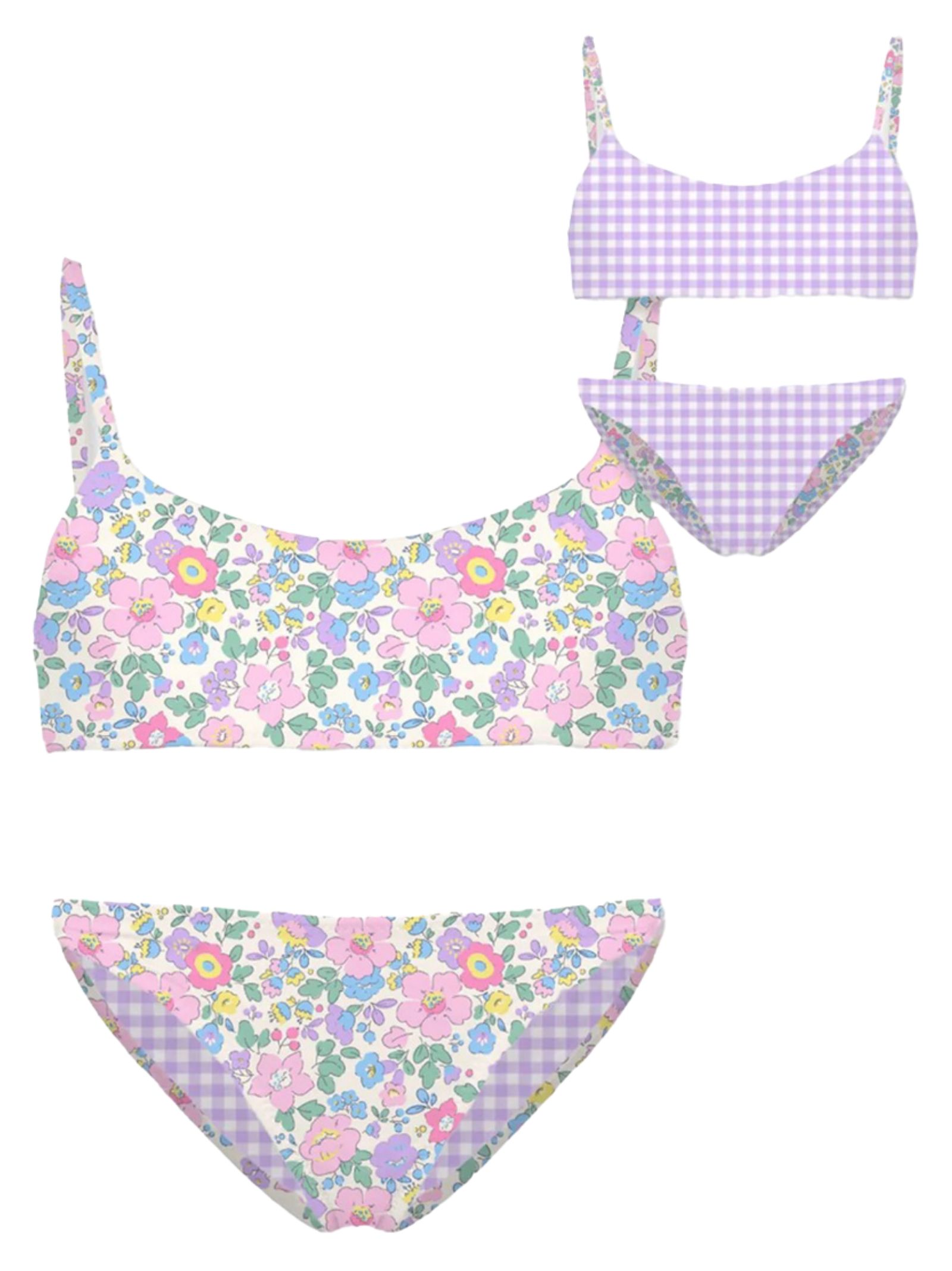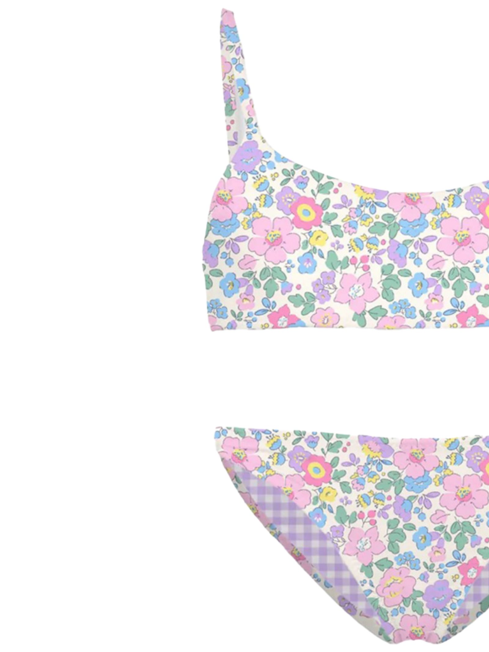 MC2 Saint Barth Kids reversible swimsuit in multicolored floral/lilac check print. Two-piece design, bandeau top with adjustable straps, classic bottoms, and logo patch. Composition: 90% polyamide, 10% elastane. Made in Italy.