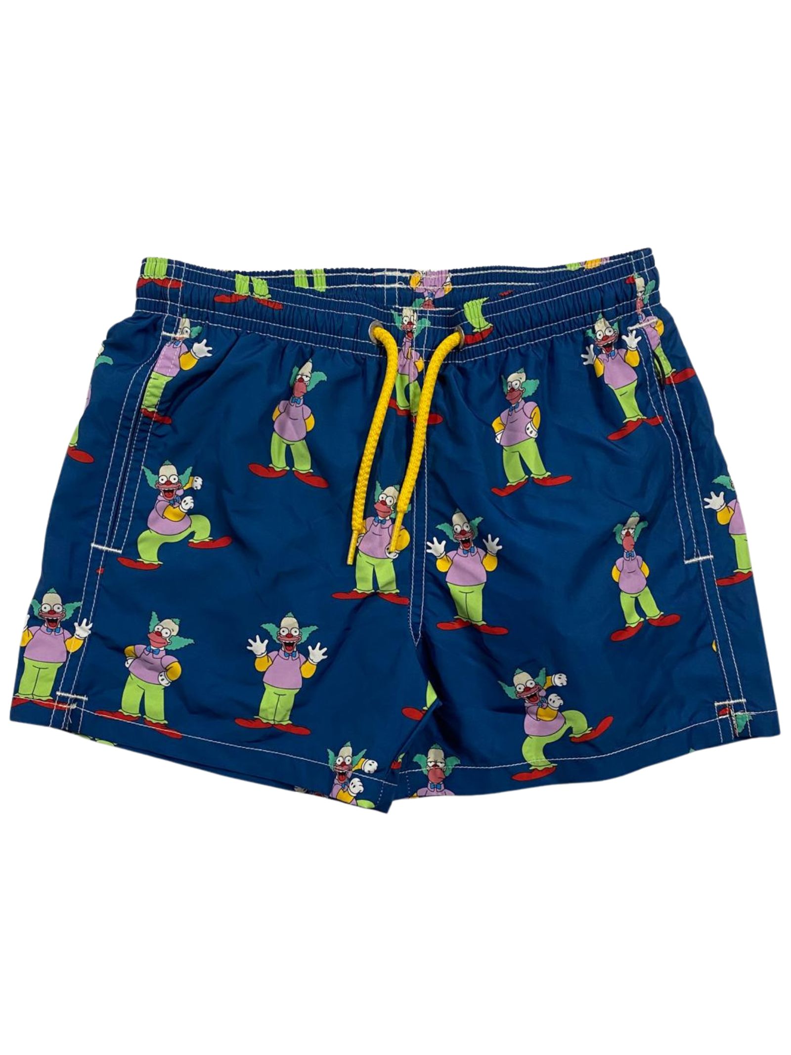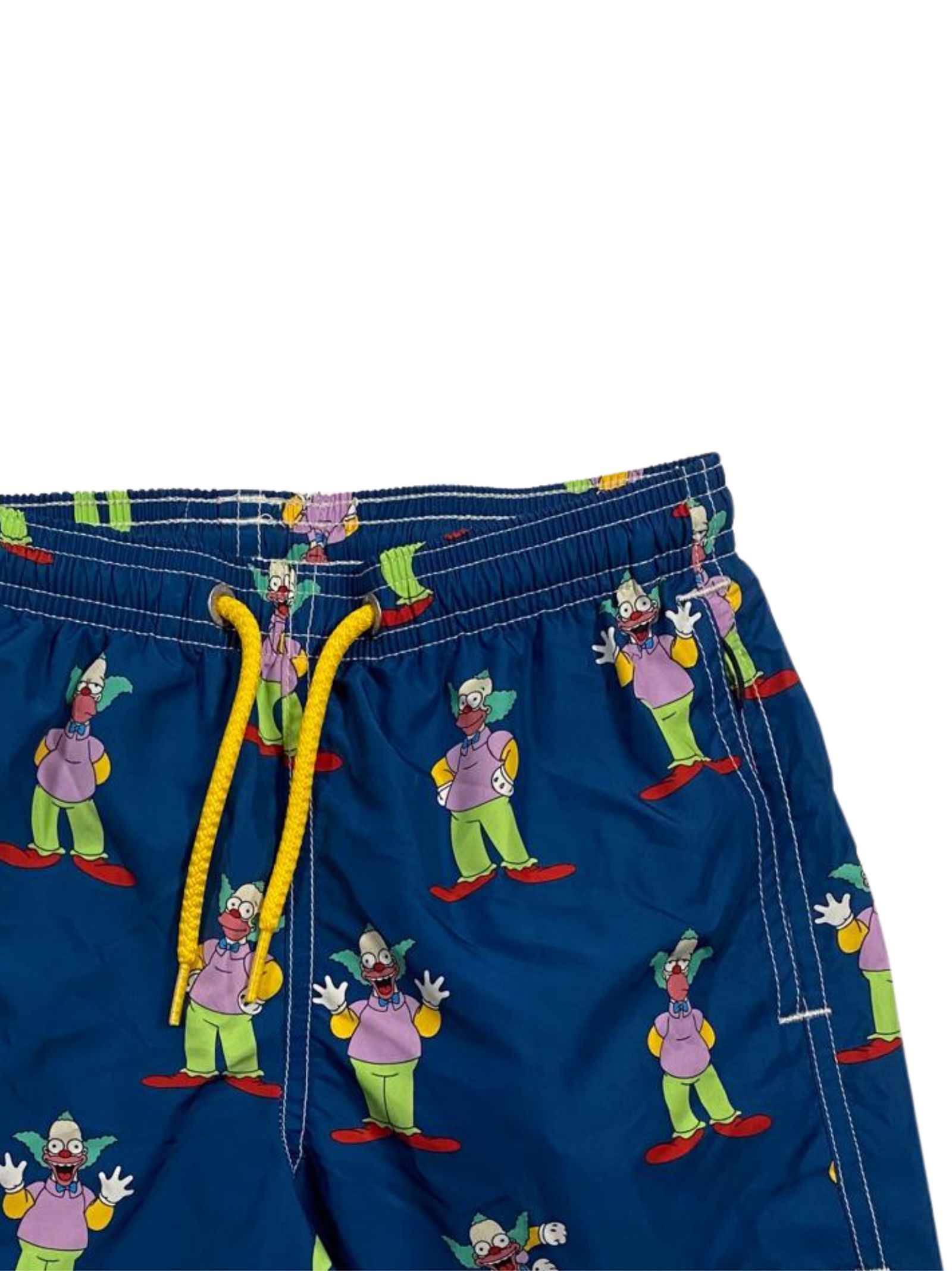 MC2 Saint Barth Kids blue swimsuit with a contrasting multicolor pattern, elasticated drawstring waist, logo on the back, two side welt pockets and a patch back pocket. Composition: 100% polyester.