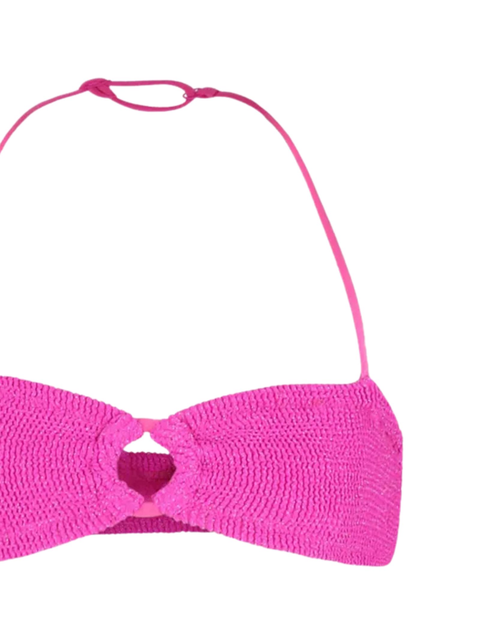 MC2 Saint Barth Kids fuchsia swimsuit, ruffled fabric, two-piece design, bandeau top with central ring and adjustable drawstring, classic bottoms, logo patch. Composition: 87% polyamide, 8% metal, 5% elastane. Made in Italy