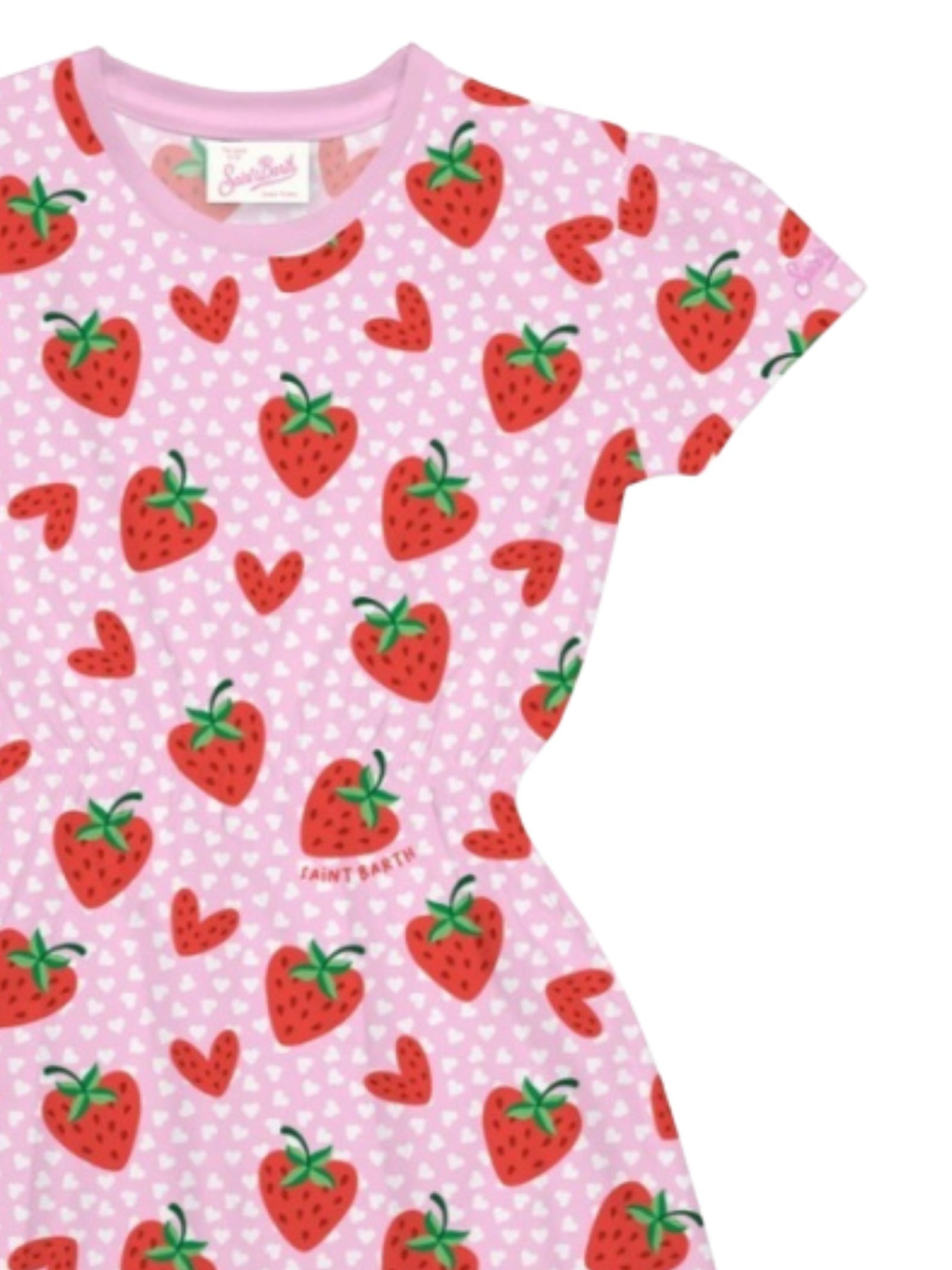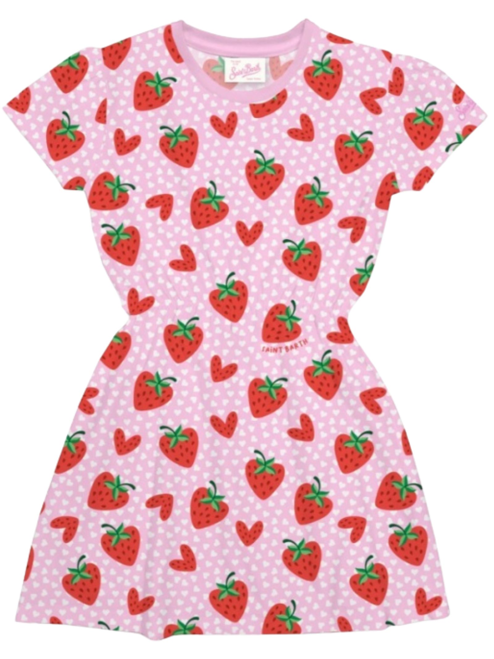 MC2 Saint Barth Kids pink dress with an all-over contrasting strawberry print, pull-on design, round neckline, flared fit. Composition: 100% cotton.