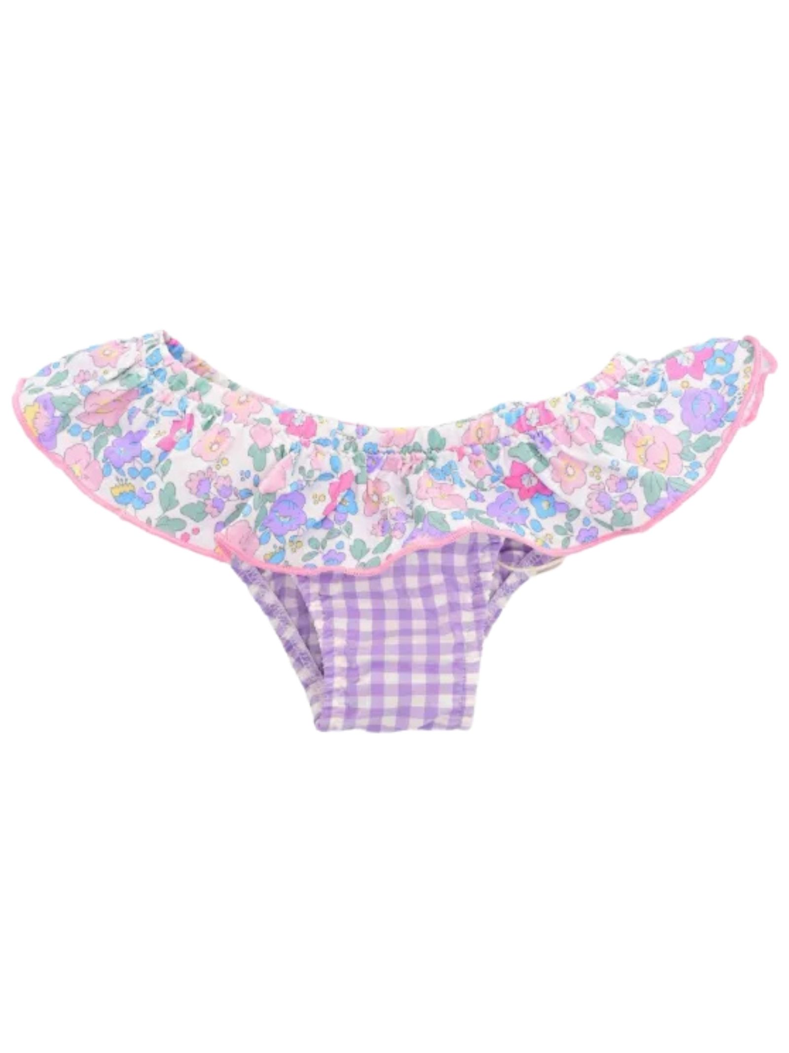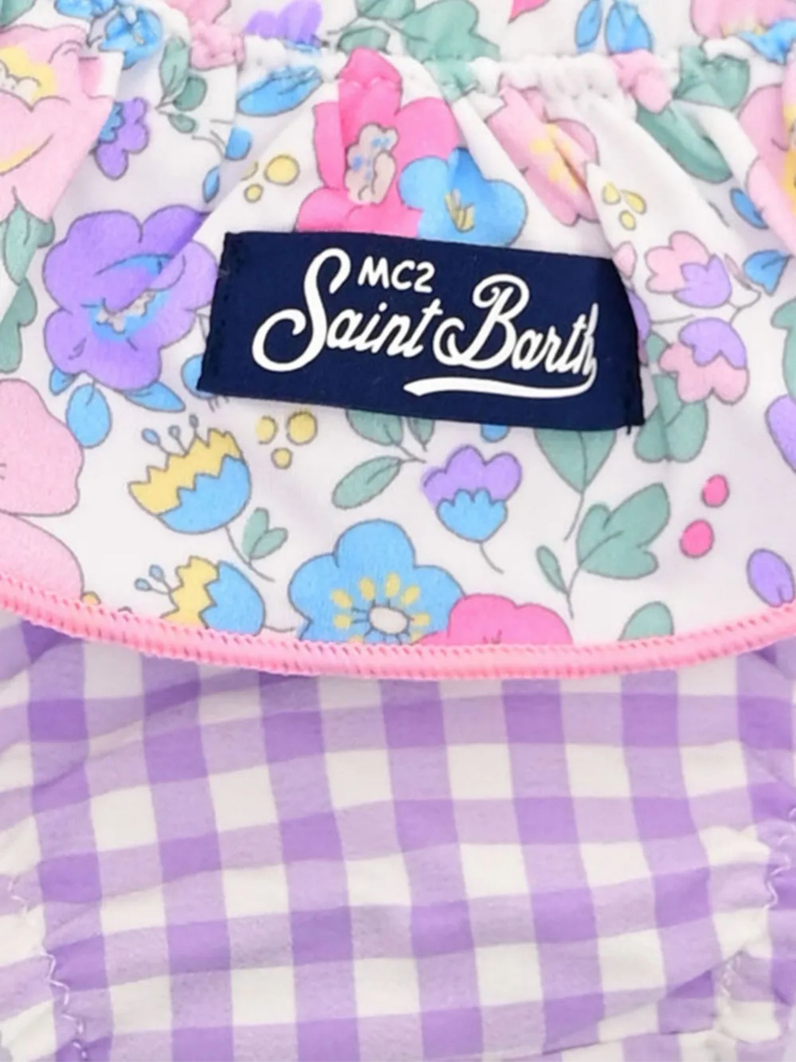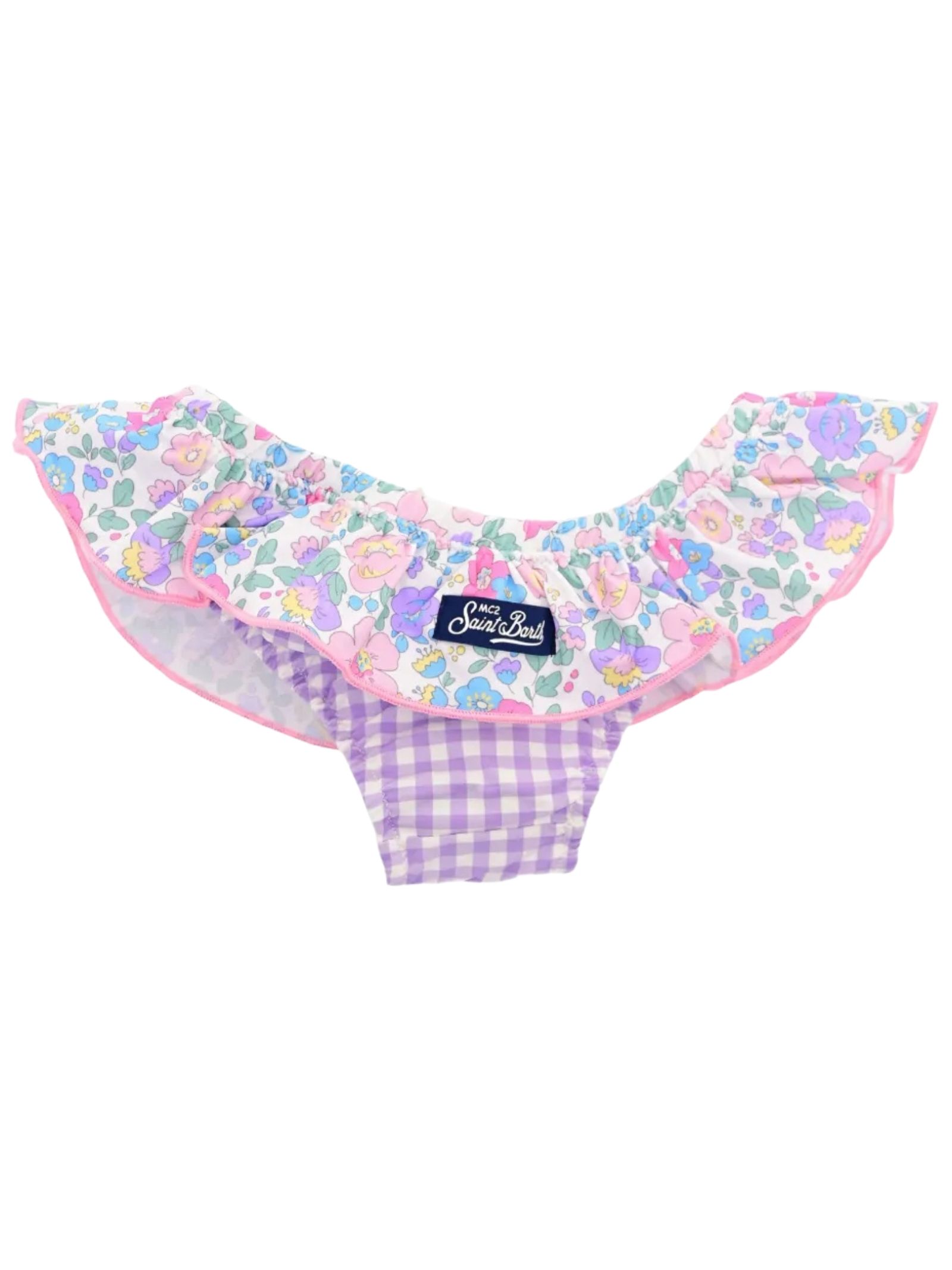 MC2 Saint Barth Kids lilac checked swimsuit with contrasting multicolor flower print all over, elastic waistband with ruffles, logo patch on the back. Composition: 90% polyamide 10% elastane.