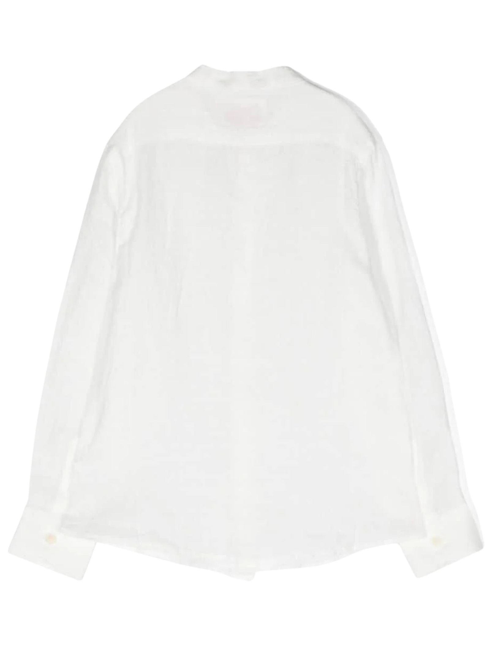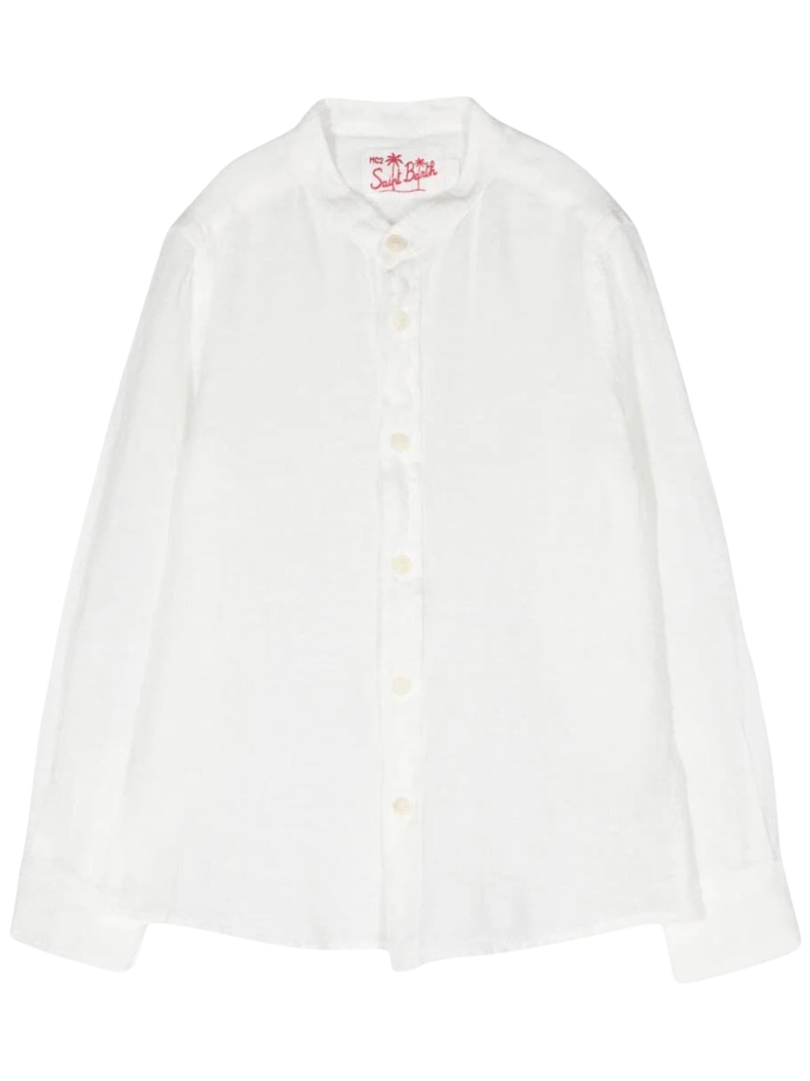 MC2 Saint Barth Kids white shirt, made of pure linen, with a mandarin collar, long sleeves, logo embroidery on the chest, curved hem, regular fit. Composition: 100% linen. Made in Italy.