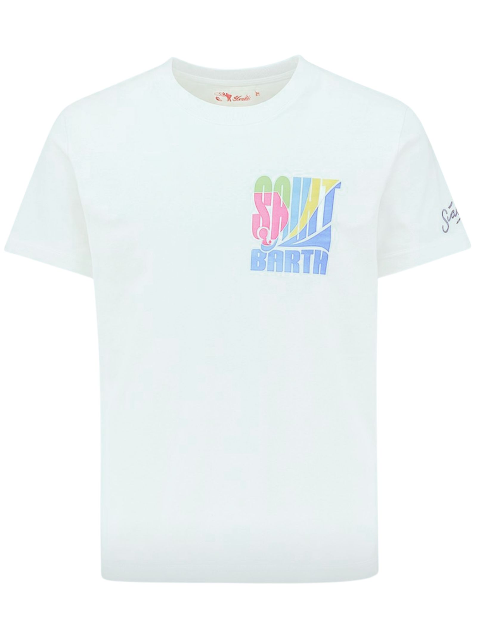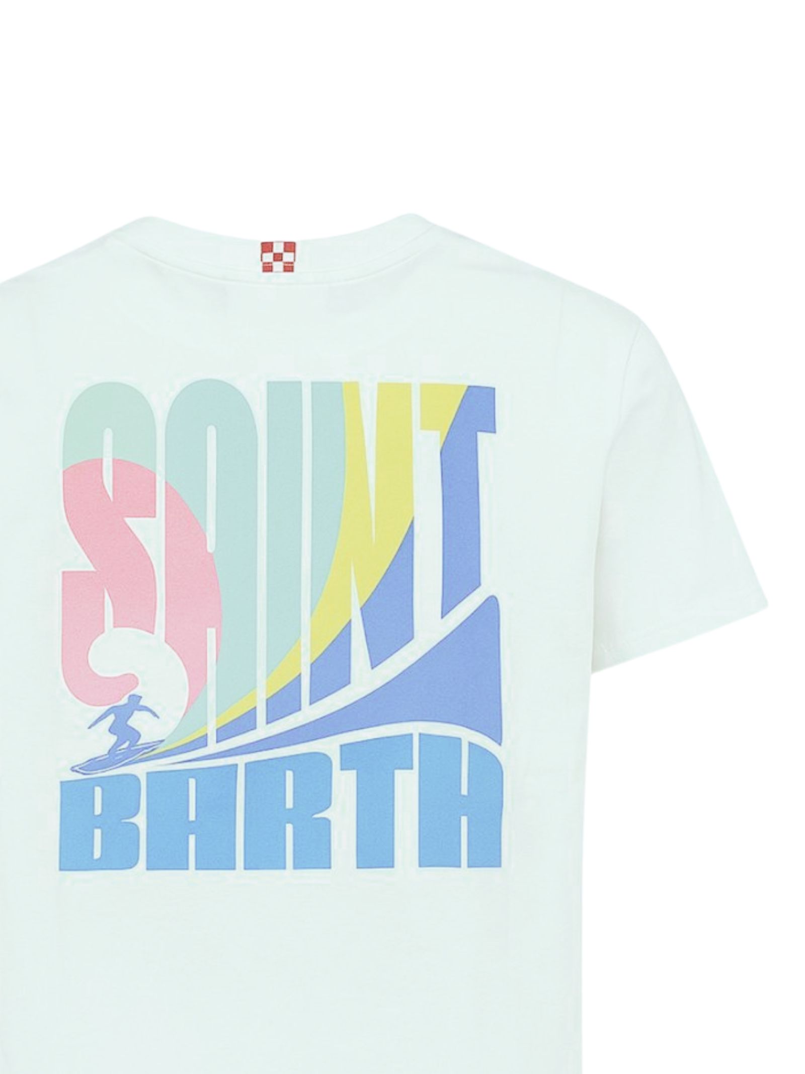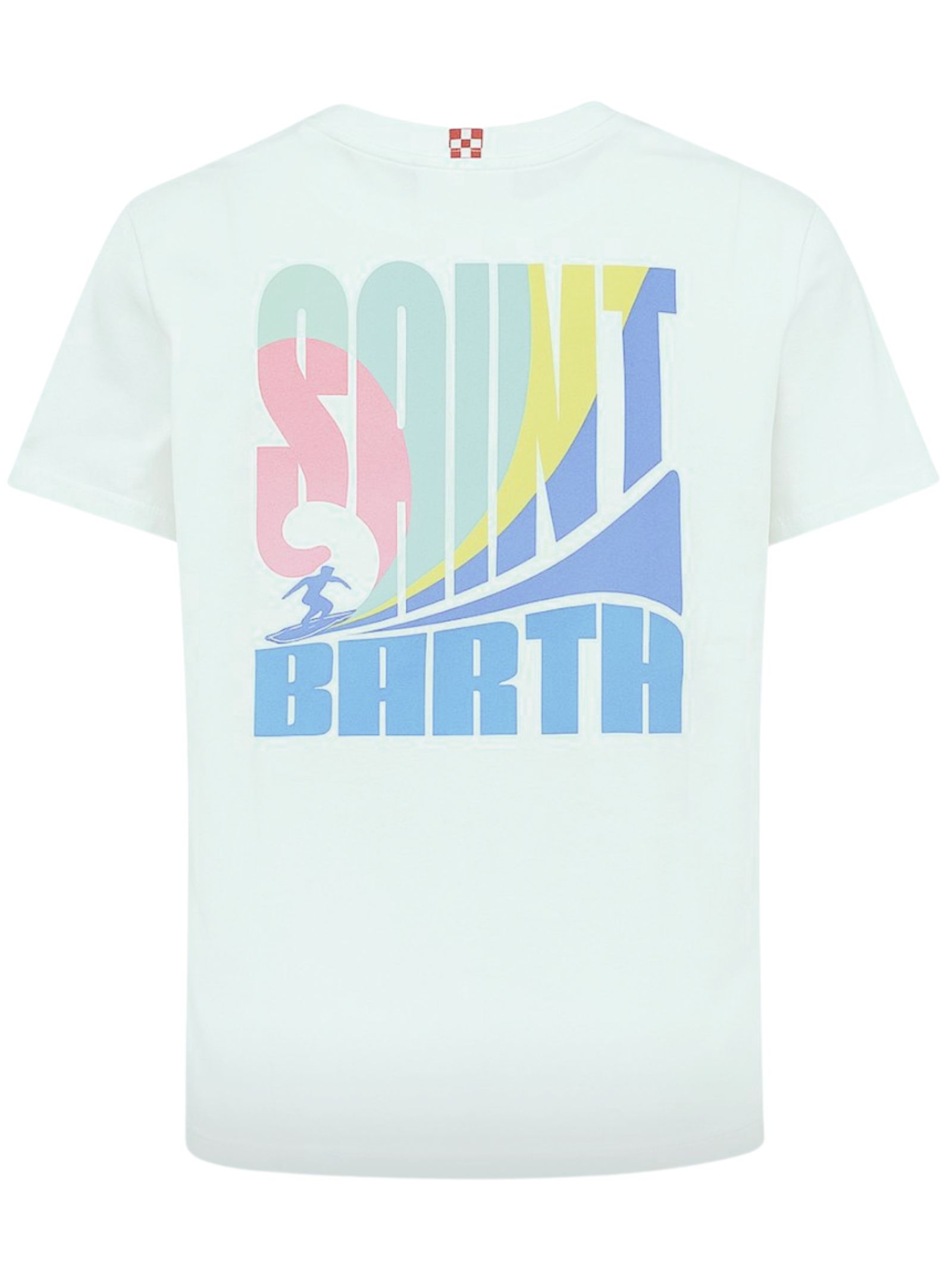 MC2 Saint Barth Kids white t-shirt, crew neck, short sleeves, maxi print on the back and print on the chest with contrasting multicolor logo, regular fit. Composition: 100% cotton