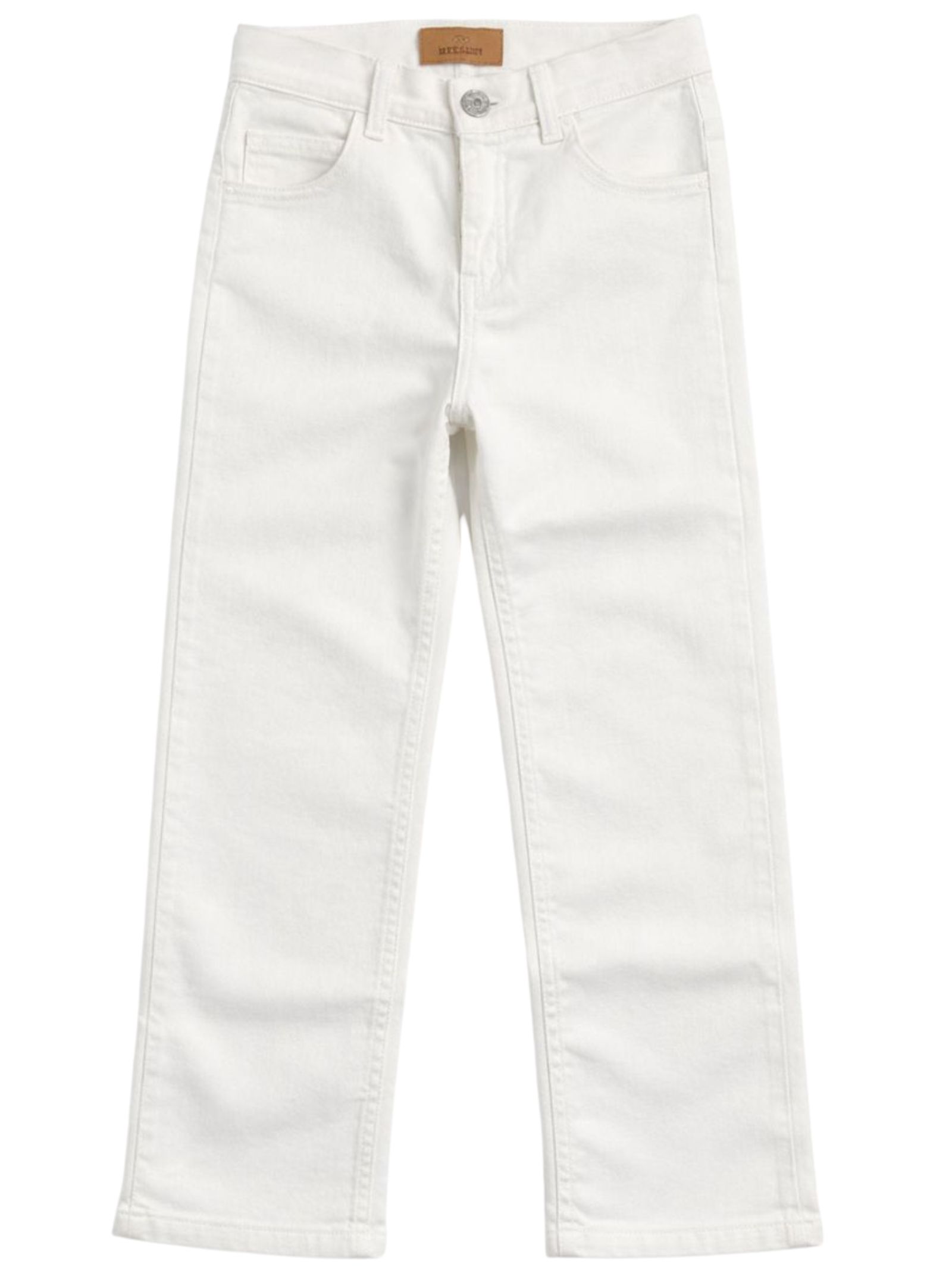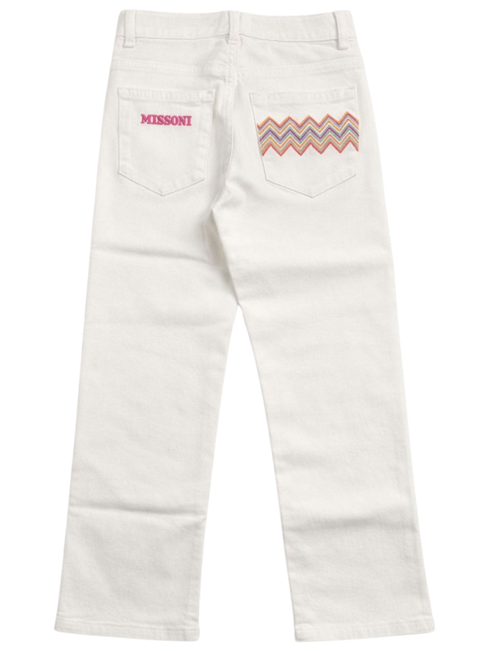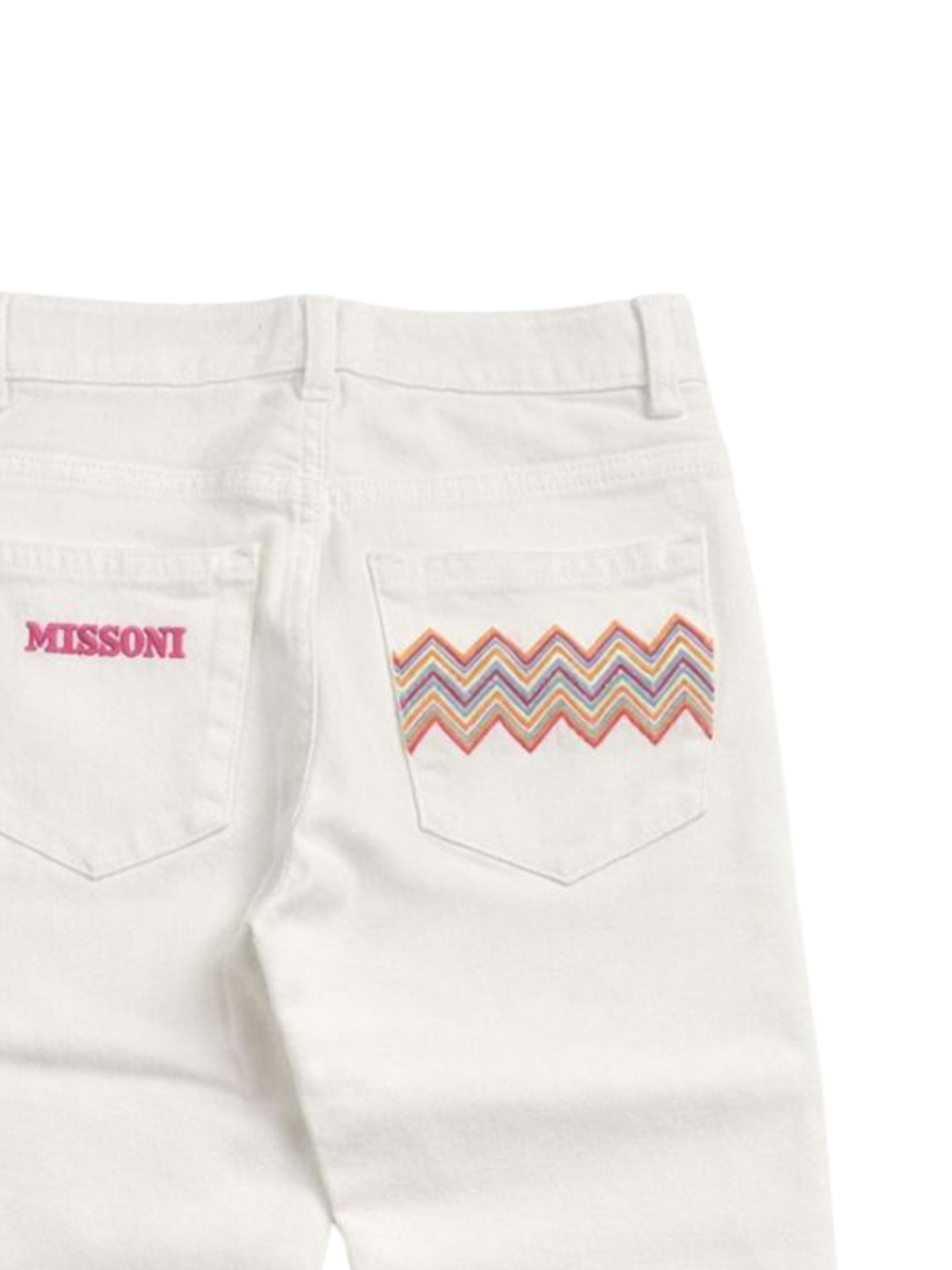 Missoni Kids white five-pocket jeans with a regular waist, belt loops, contrasting multicolor logo embroidery on the back, and a regular fit. Composition: 92% cotton, 8% elastane. Made in Italy.