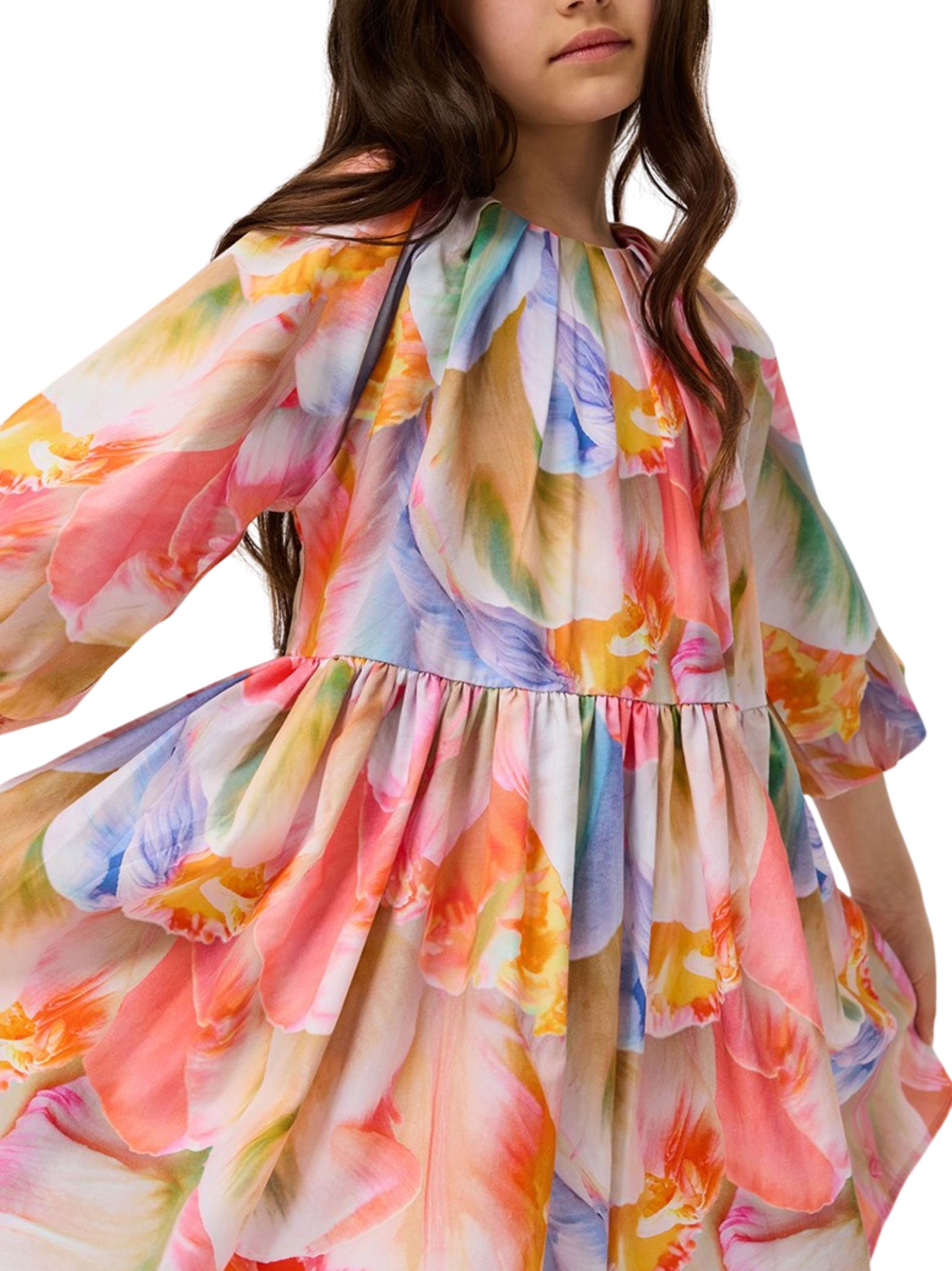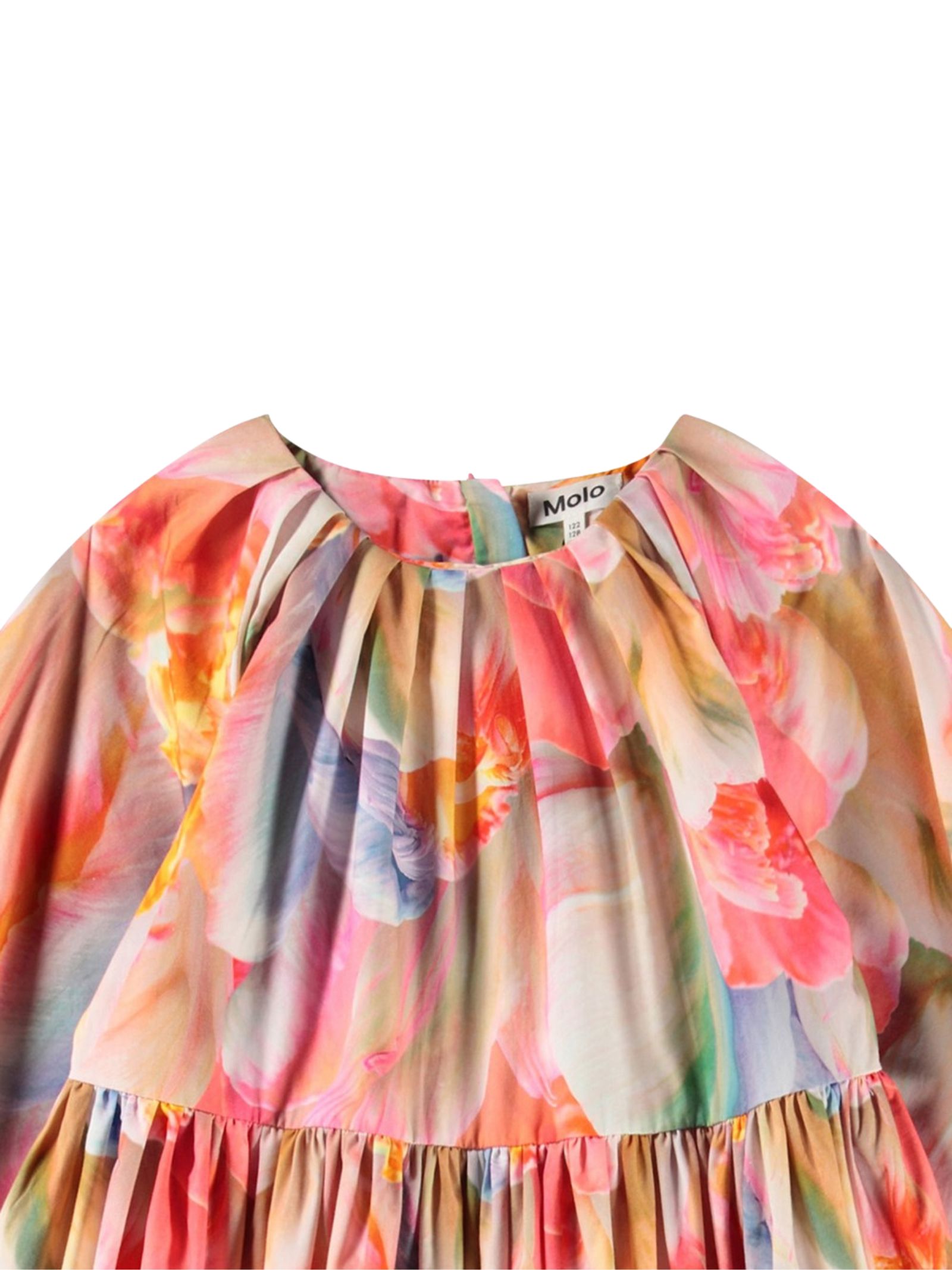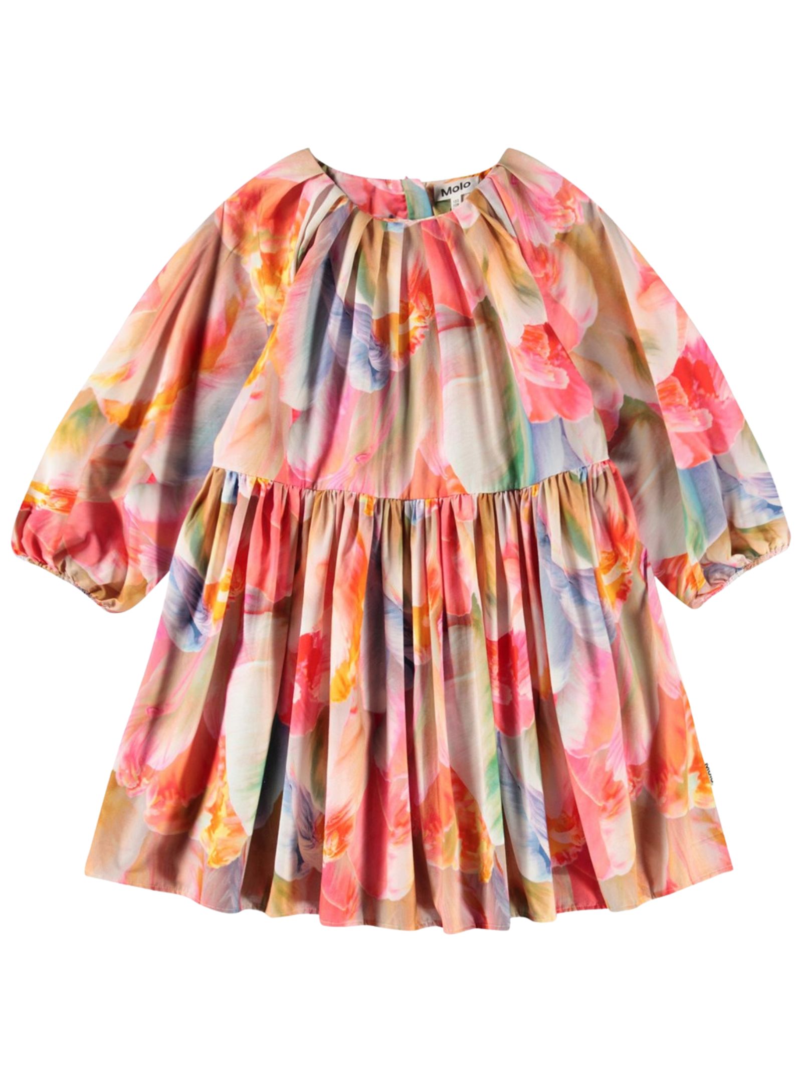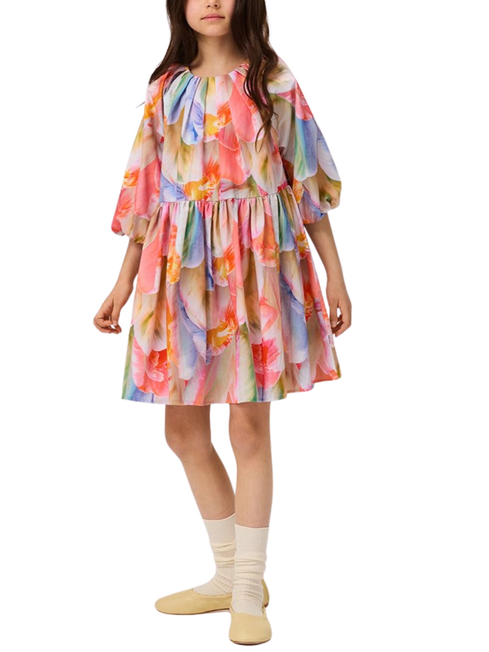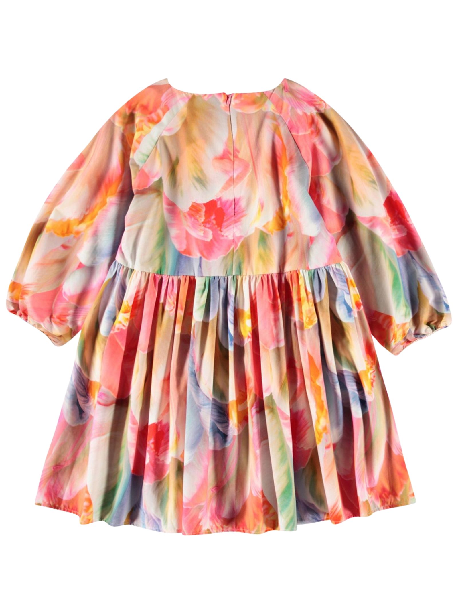 Molo Kids dress with a multicolored floral pattern, crew neck, puff sleeves with elastic hem, flared design, back zip, regular fit. Composition: 100% cotton