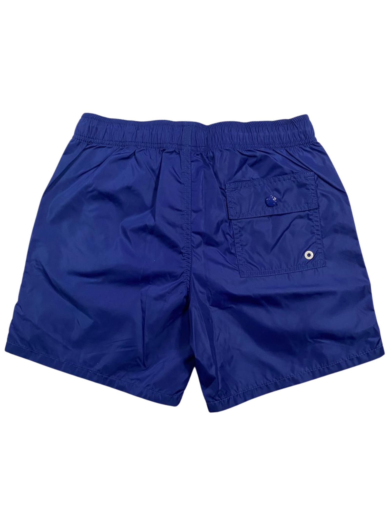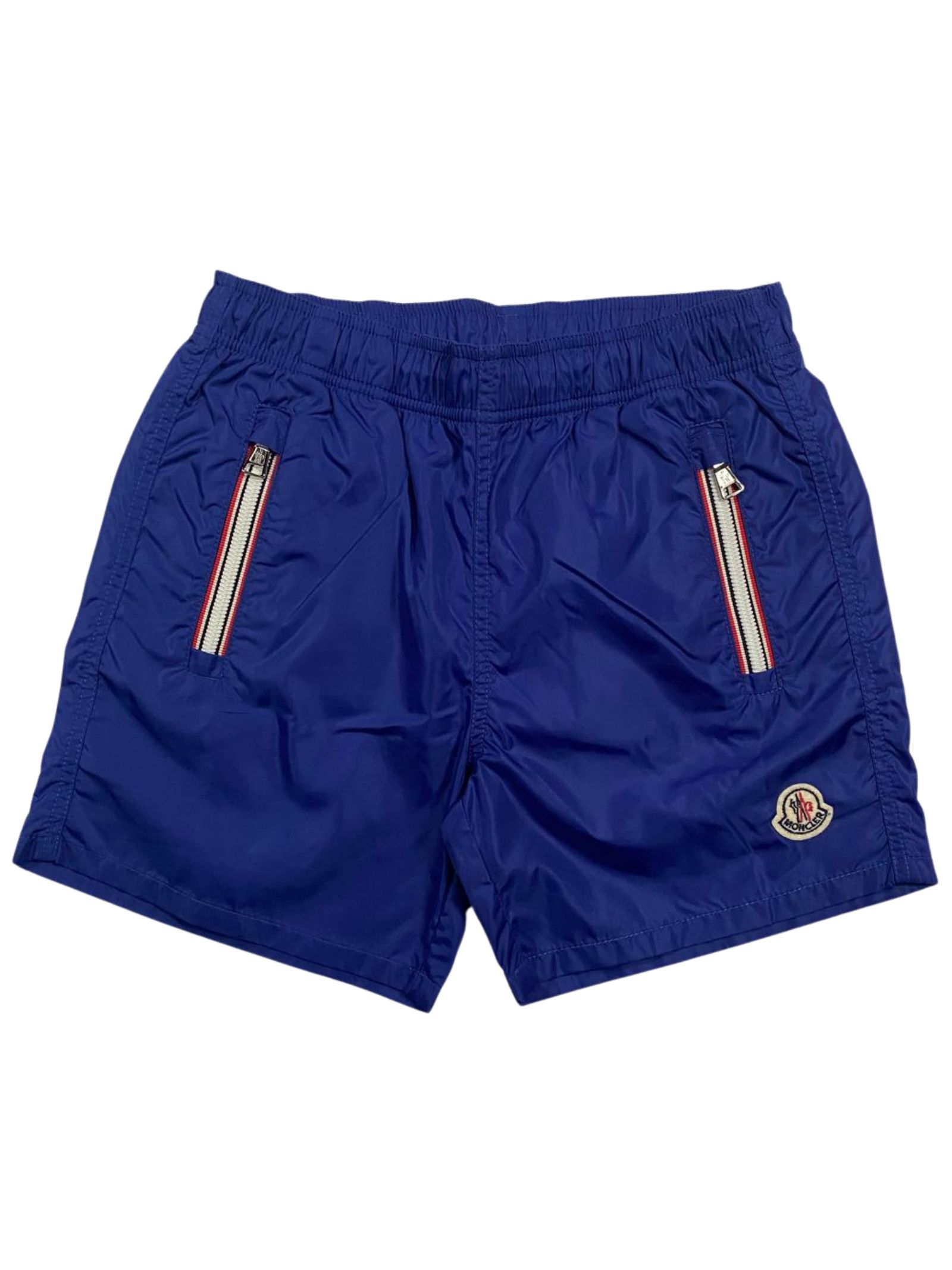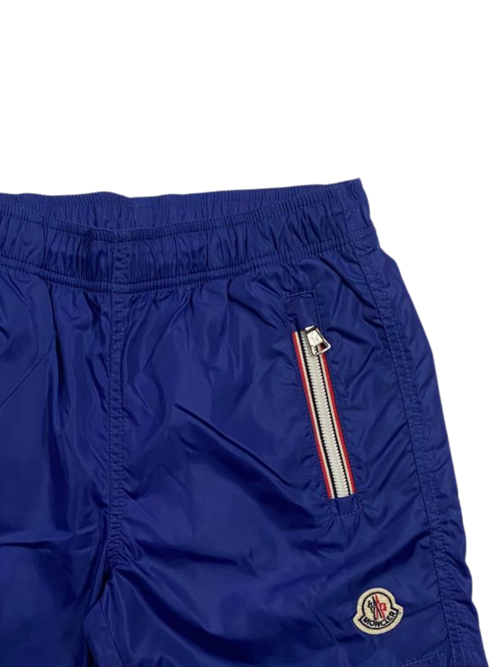Moncler Kids blue swimsuit, two zip pockets decorated with contrasting red side bands, boxer style, elastic waistband, internal drawstring, contrasting logo appliqué, back pocket with flap and button, internal mesh briefs. Composition: 100% polyamide