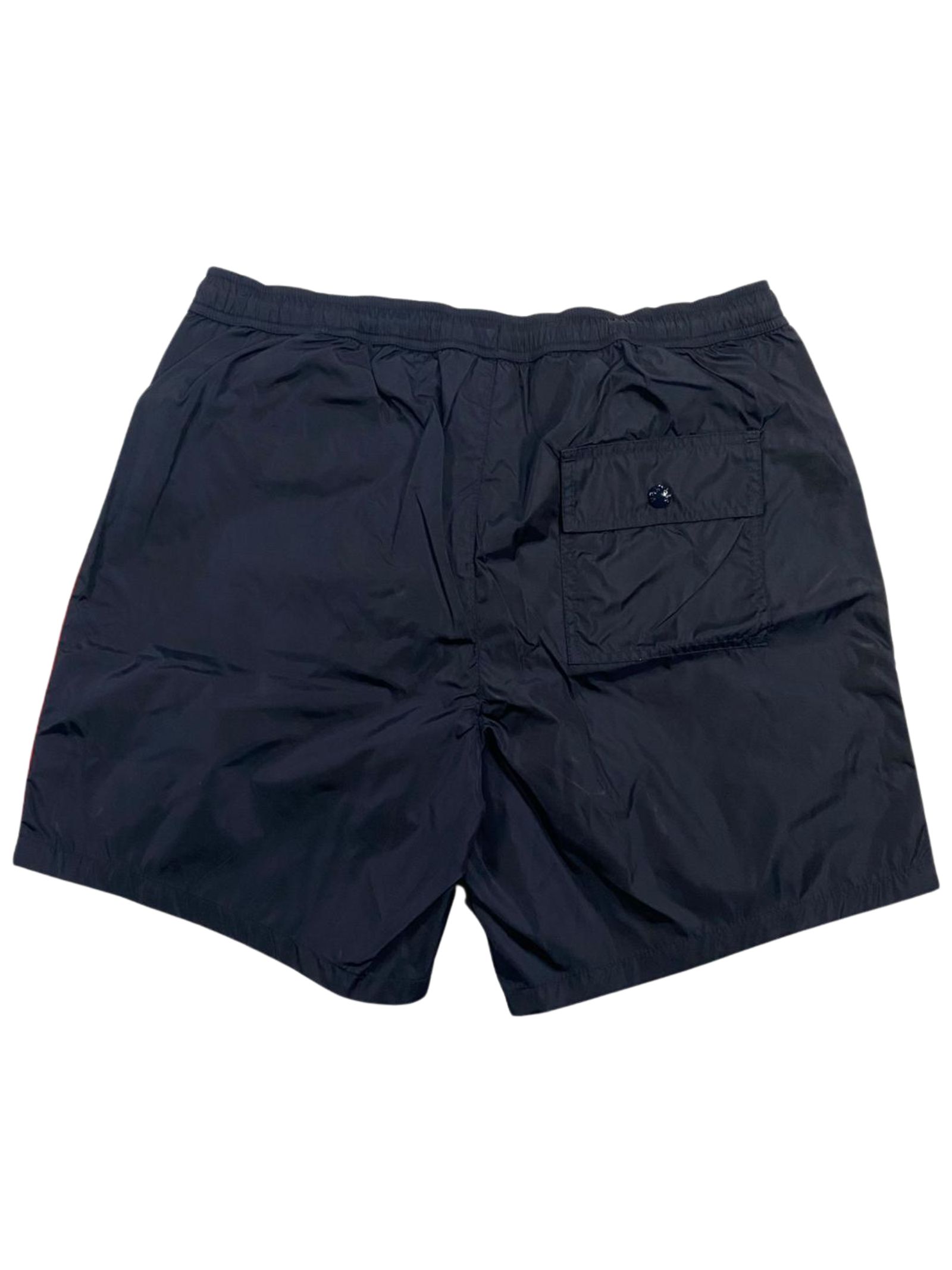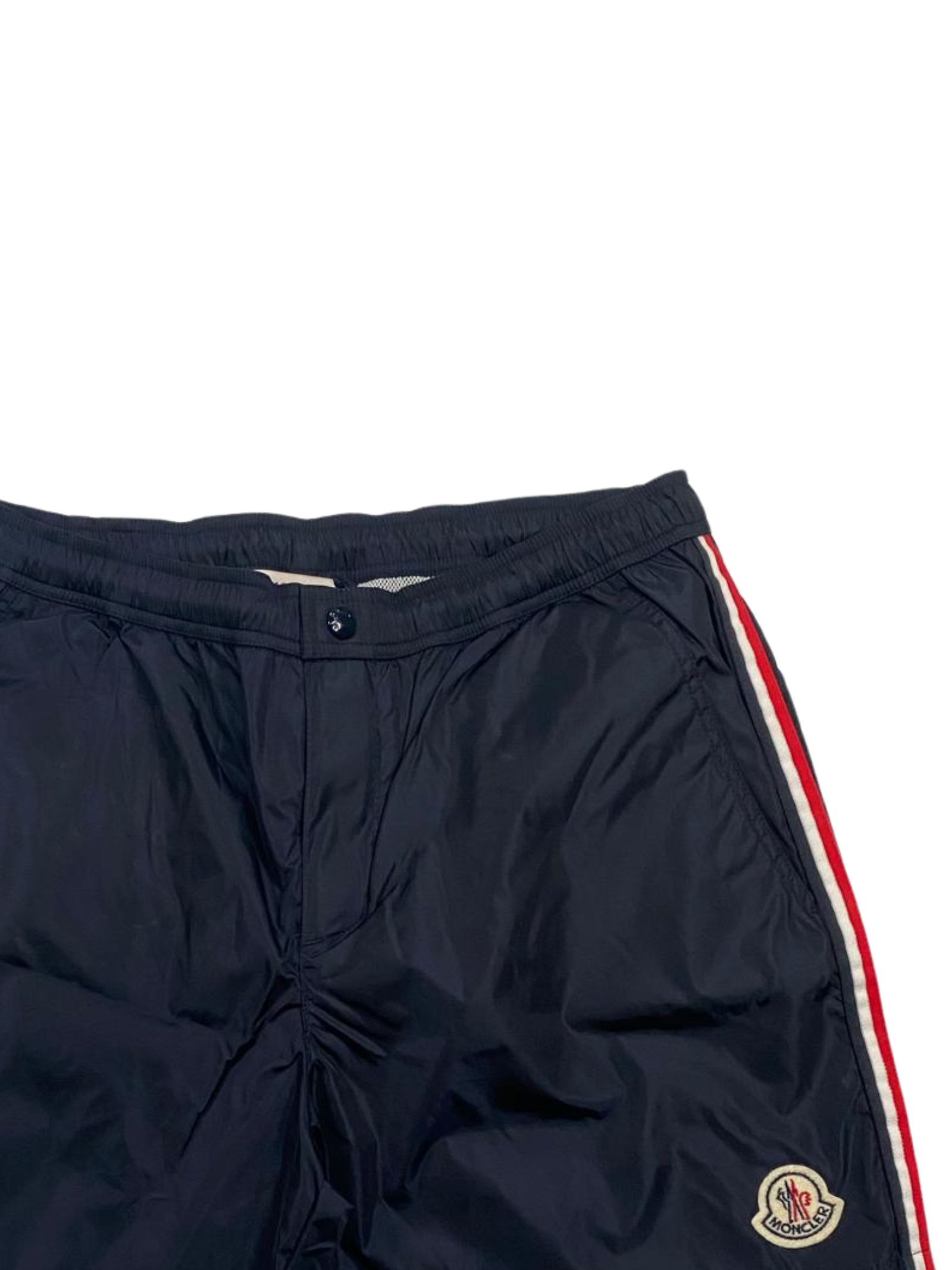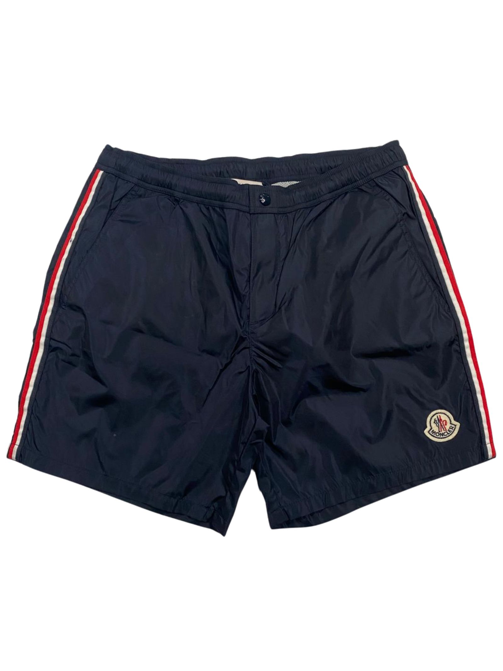 Moncler Kids midnight blue swimsuit with contrasting red side stripes, boxer briefs, elastic waistband, central button closure, internal drawstring, contrasting logo, back pocket with flap and button, internal mesh briefs. Composition: 100% polyamide