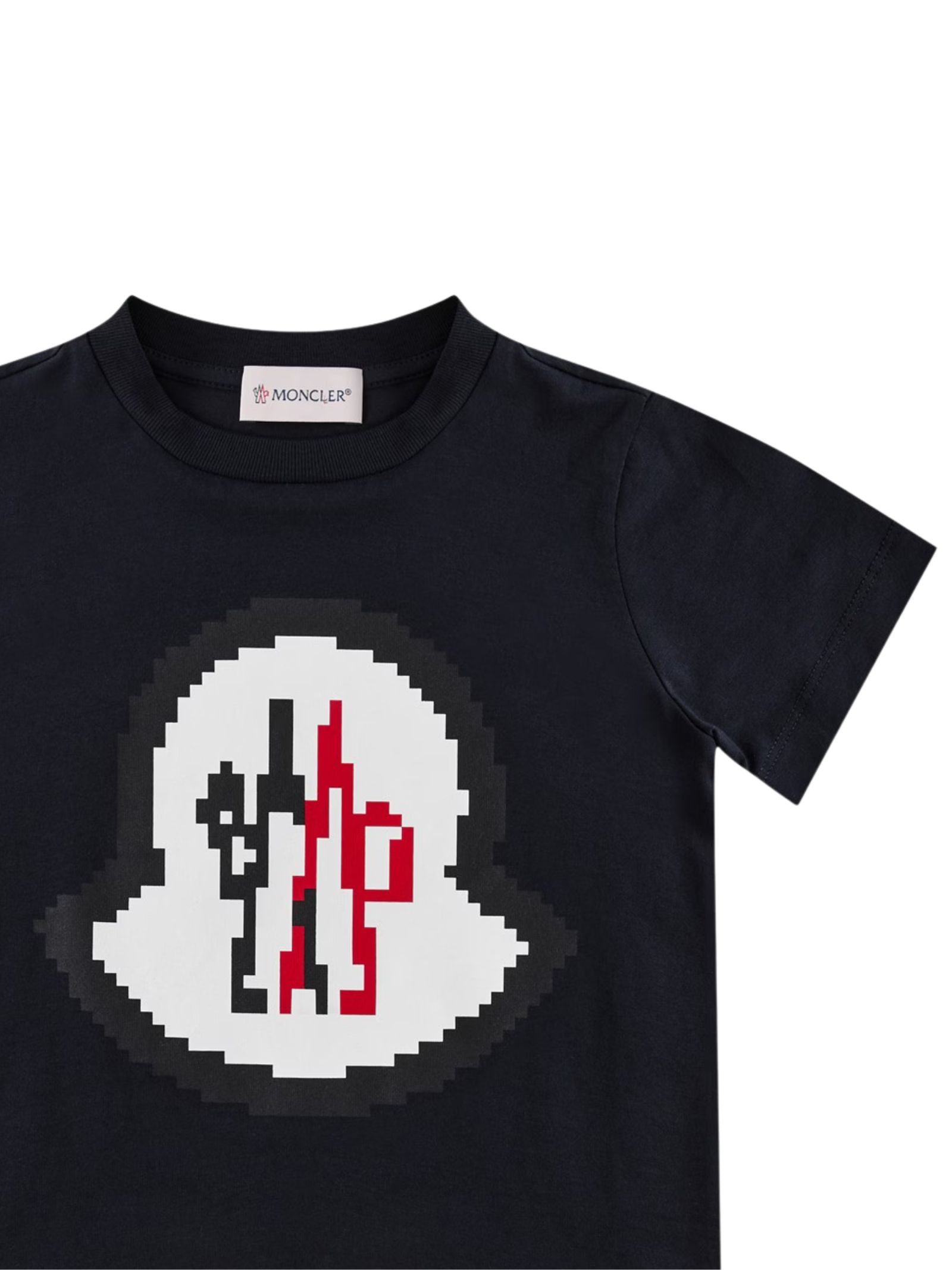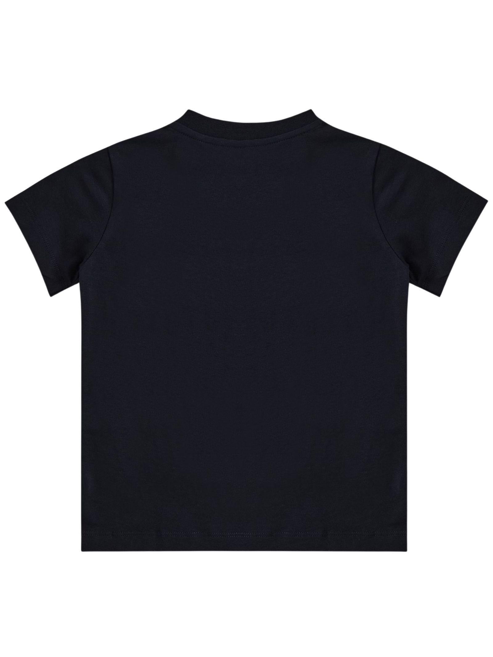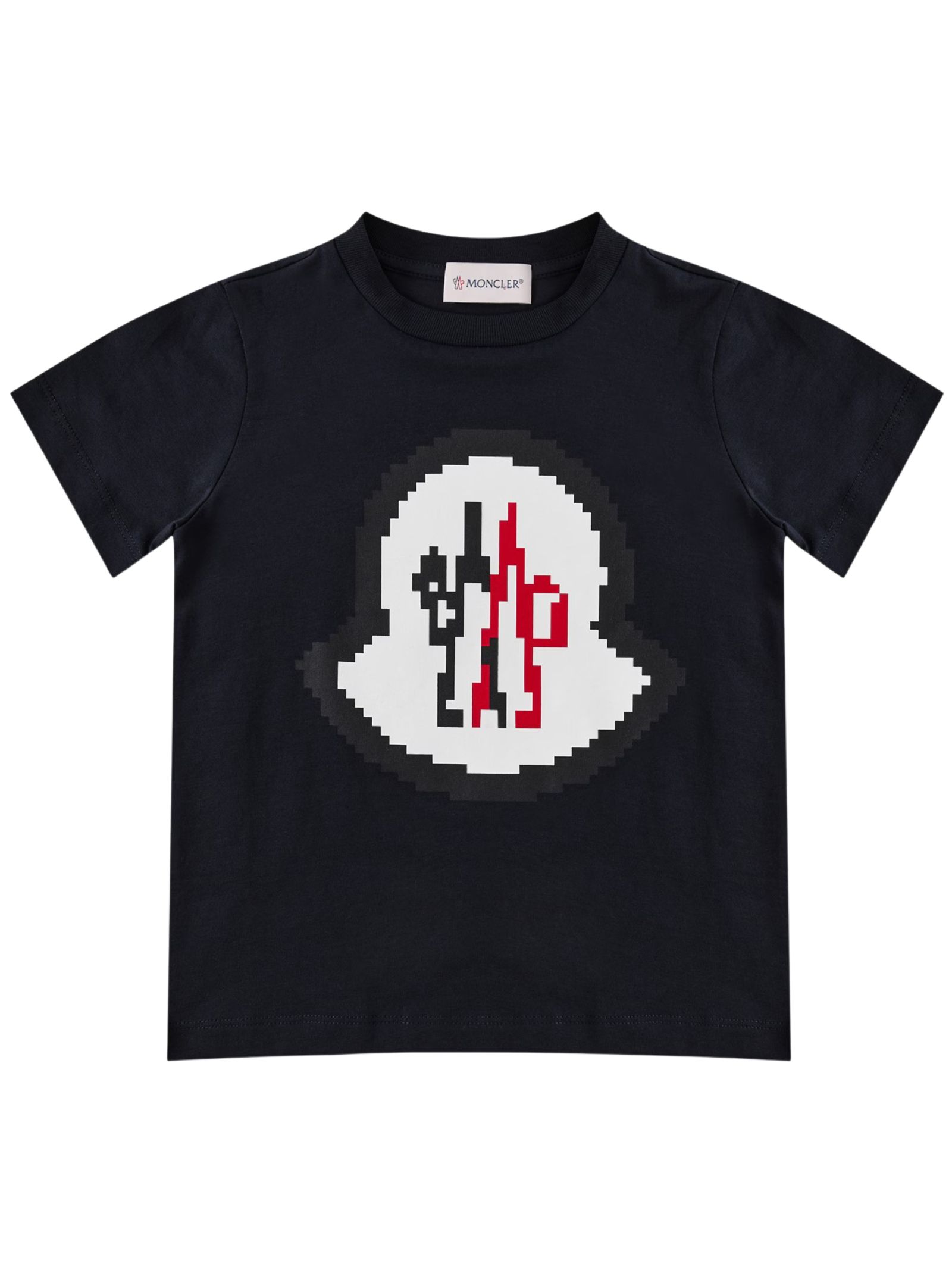 Moncler Kids navy blue T-shirt, crew neck, short sleeves, contrasting central logo print, felt logo appliqué on the arm, straight hem, regular fit. Composition: 100% cotton