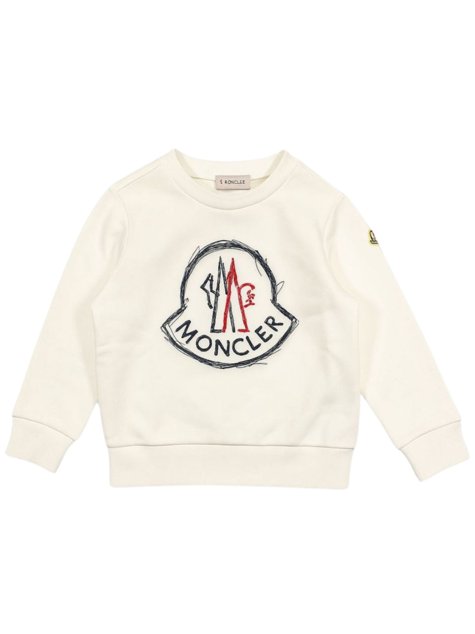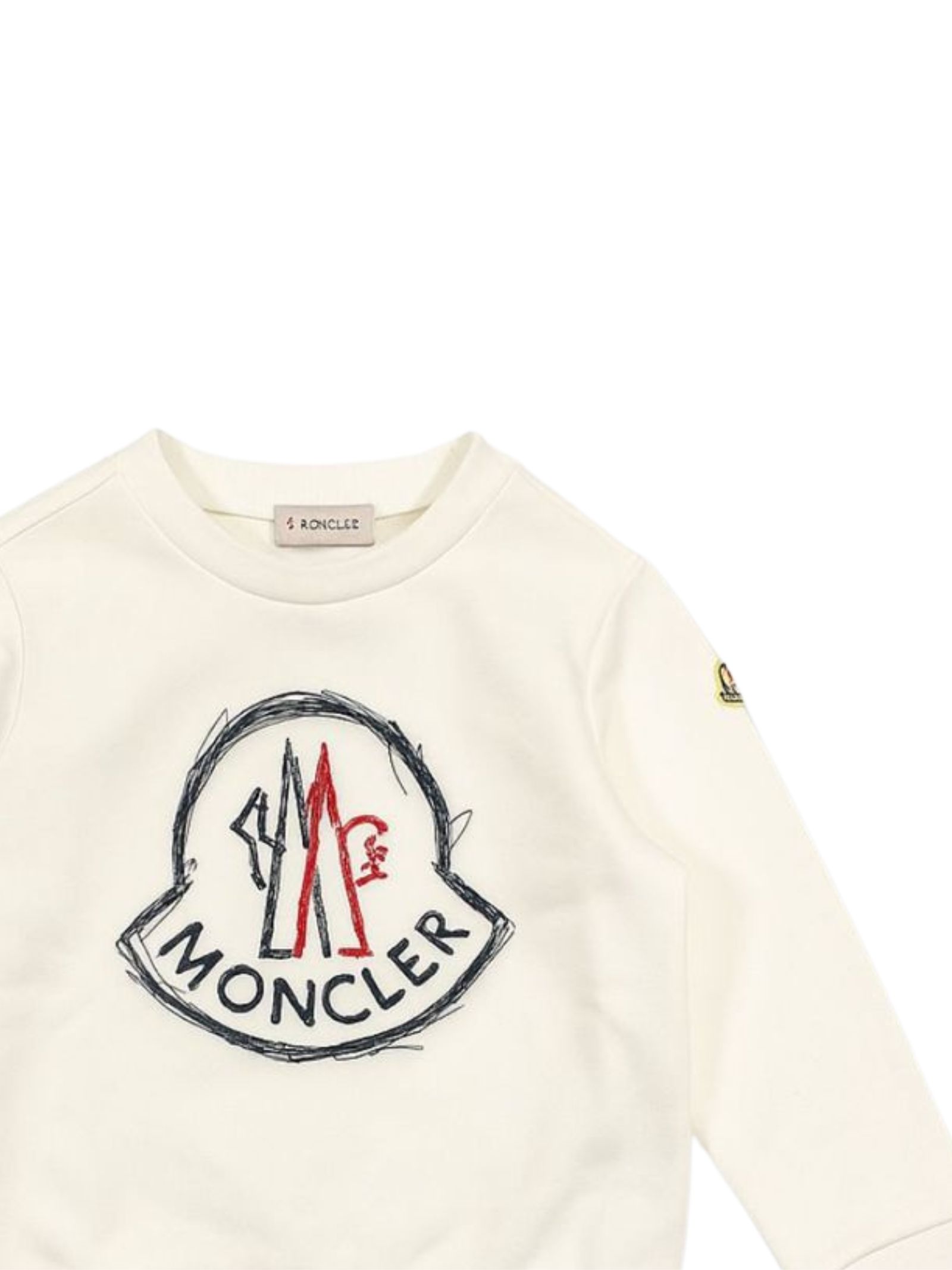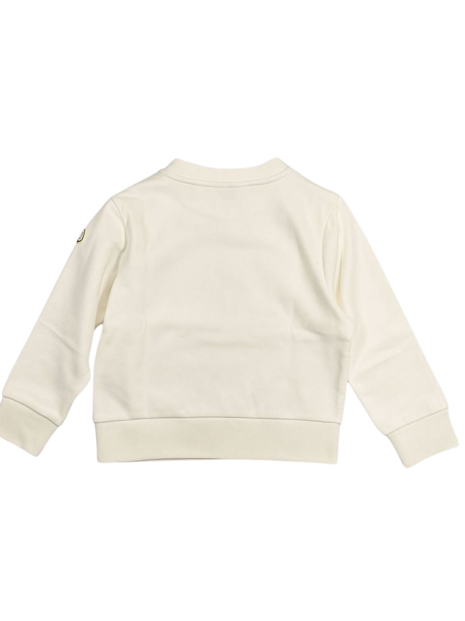 Moncler Kids white sweatshirt, crew neck, long sleeves, contrasting central logo print, ribbed cuffs, regular fit. Composition: 100% cotton