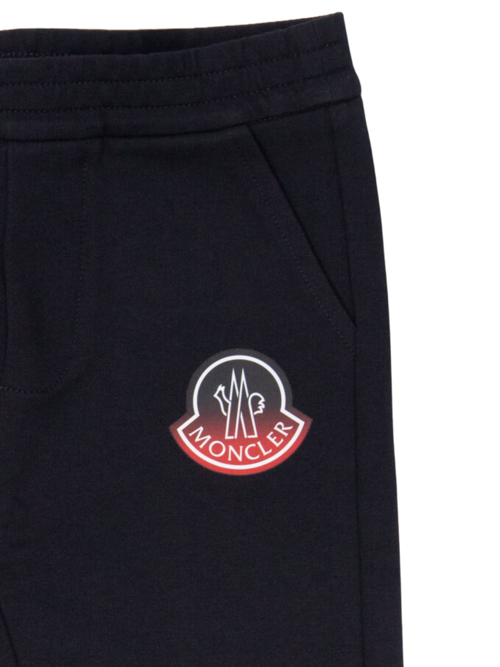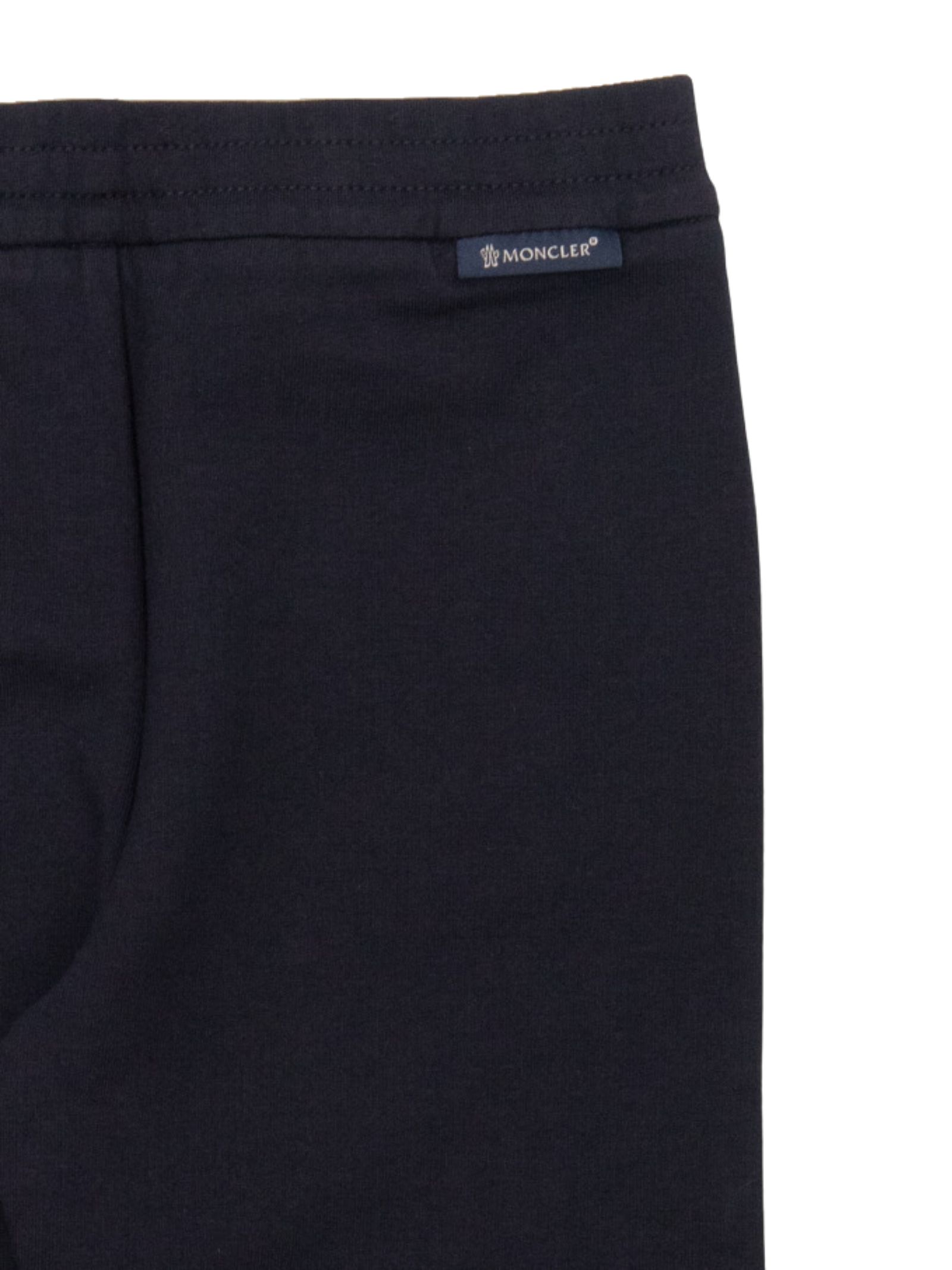 Moncler Kids blue trousers, contrasting logo print, elasticated waist, two slanted side pockets and elasticated ankle cuffs. Composition: 100% cotton