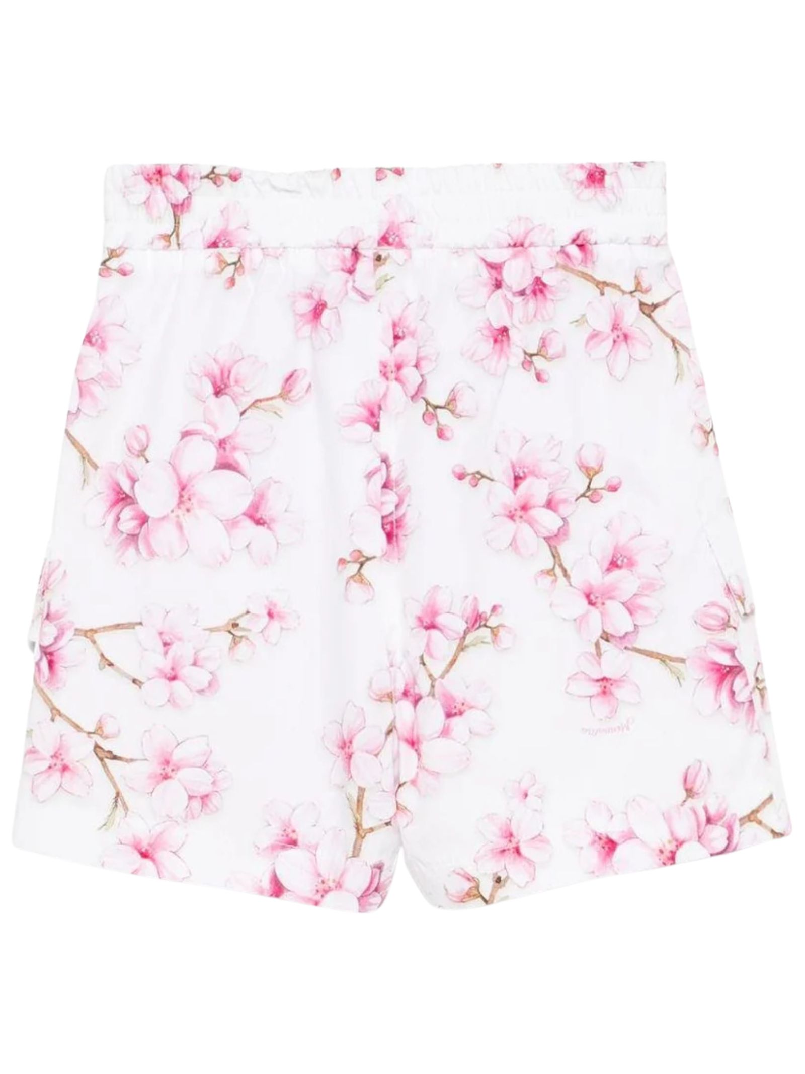 Monnalisa Kids white shorts with an all-over contrasting flower print, made of cotton with an elastic waistband, two side patch pockets, and a regular fit. Composition: 100% cotton. Made in Italy.