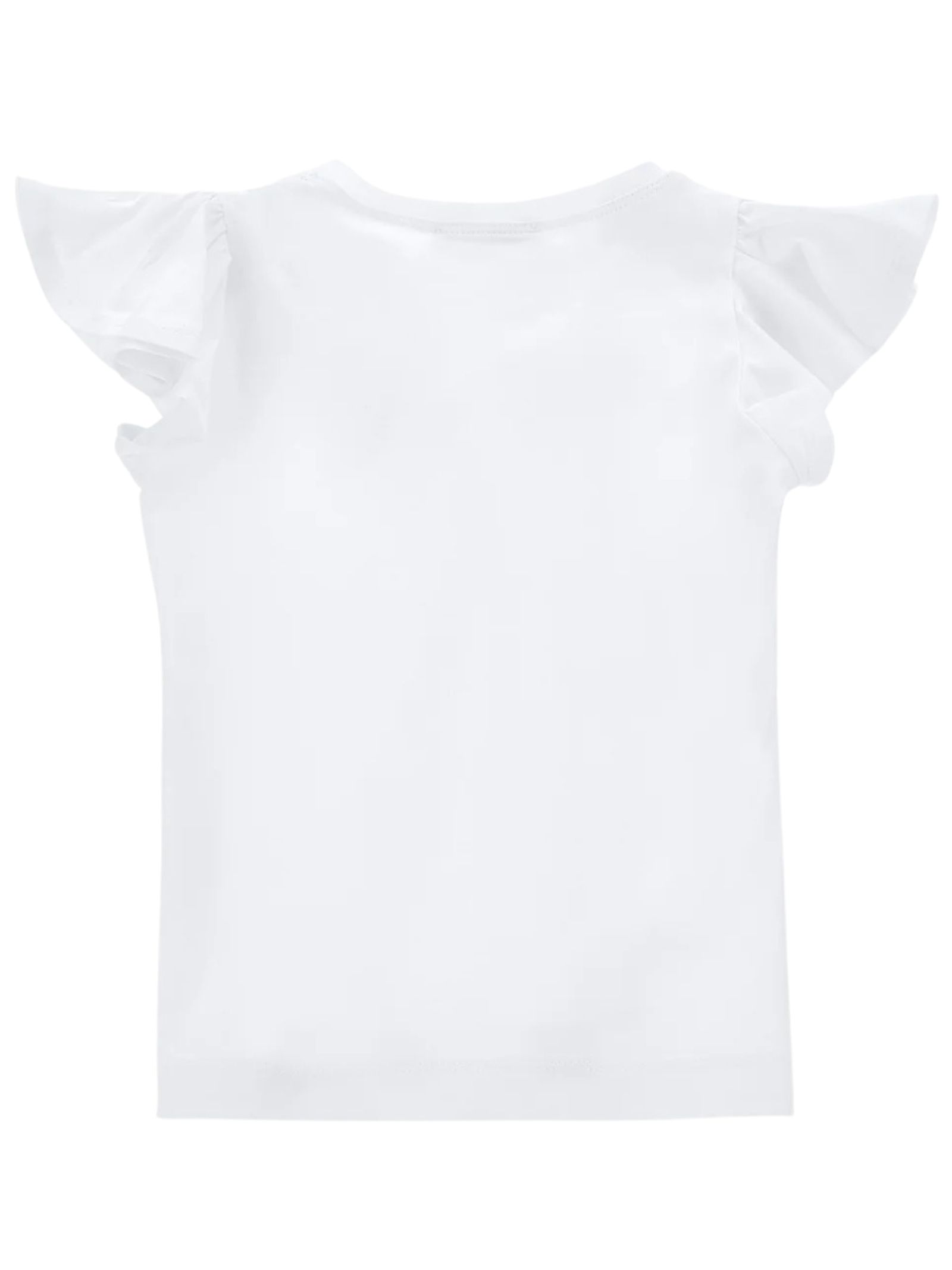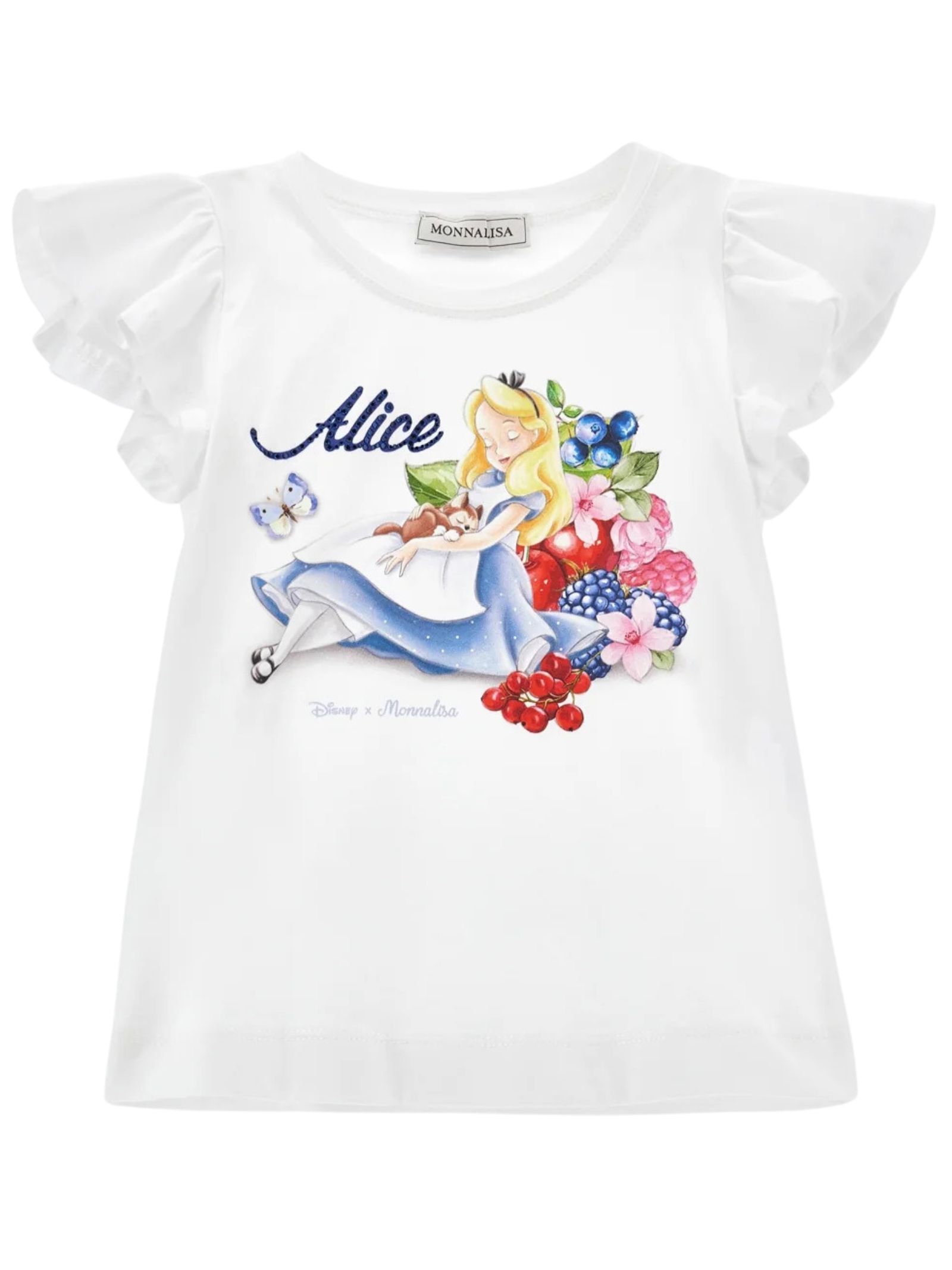 Monnalisa Kids white T-shirt, crew neck, short sleeves with ruffles, Alice in Wonderland print with logo, button fastening on the back, regular fit. Composition: 95% cotton 5% elastane