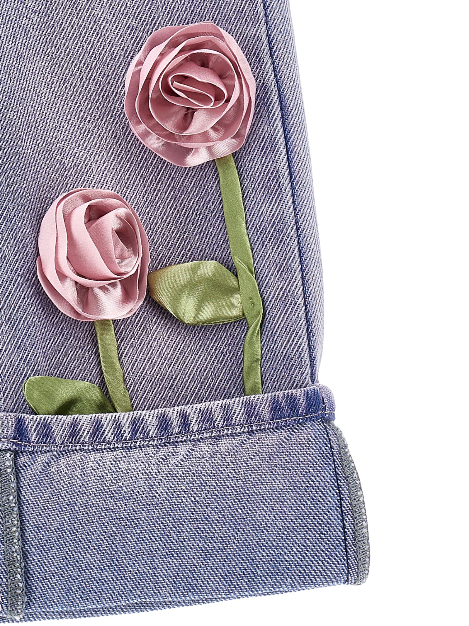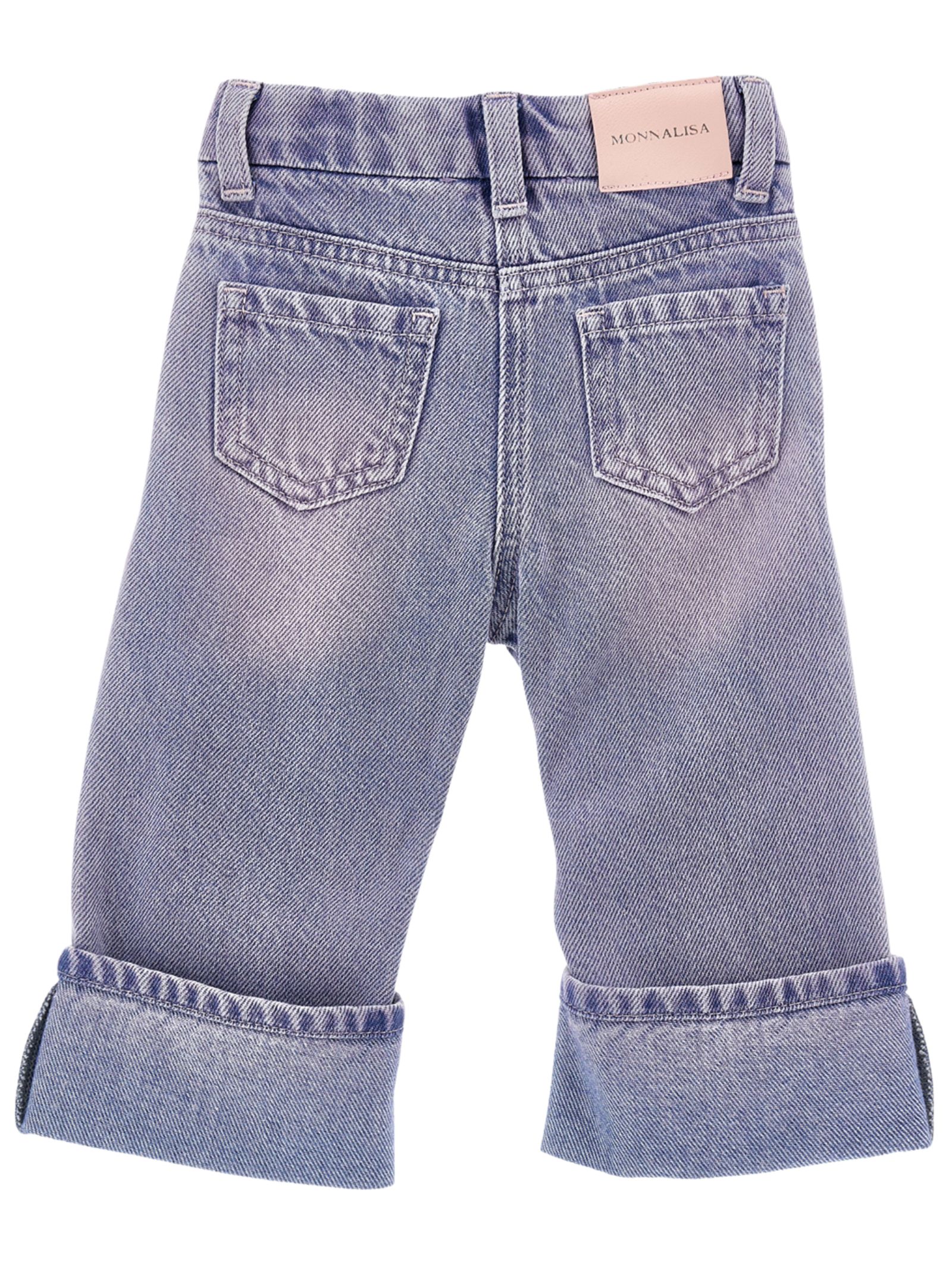Monnalisa Kids medium-light wash jeans with lightening detail, rose appliqué, elastic waistband. Multi-pockets, cuffed hems. Composition: 94% cotton, 5% polyester, 1% elastane.