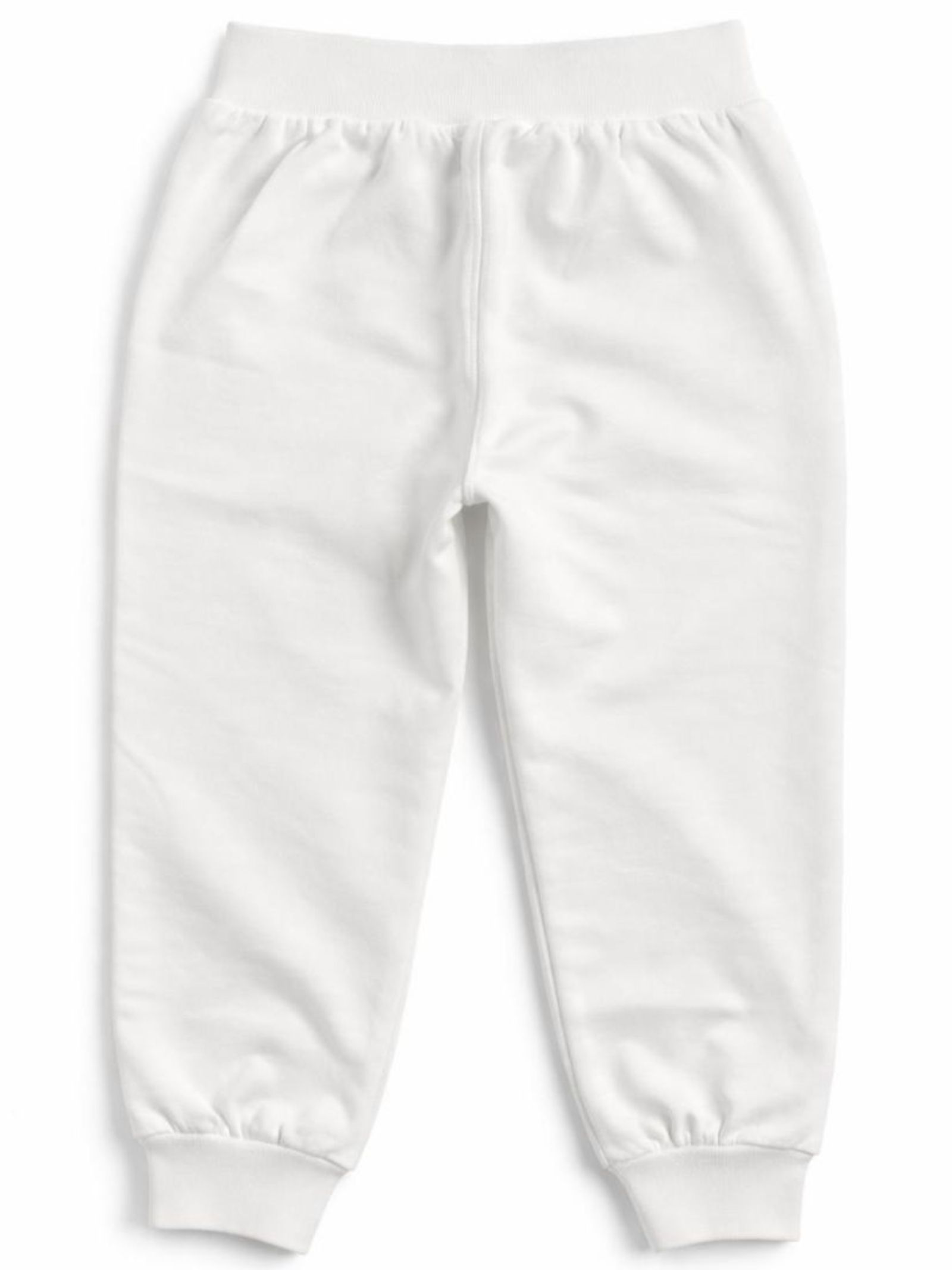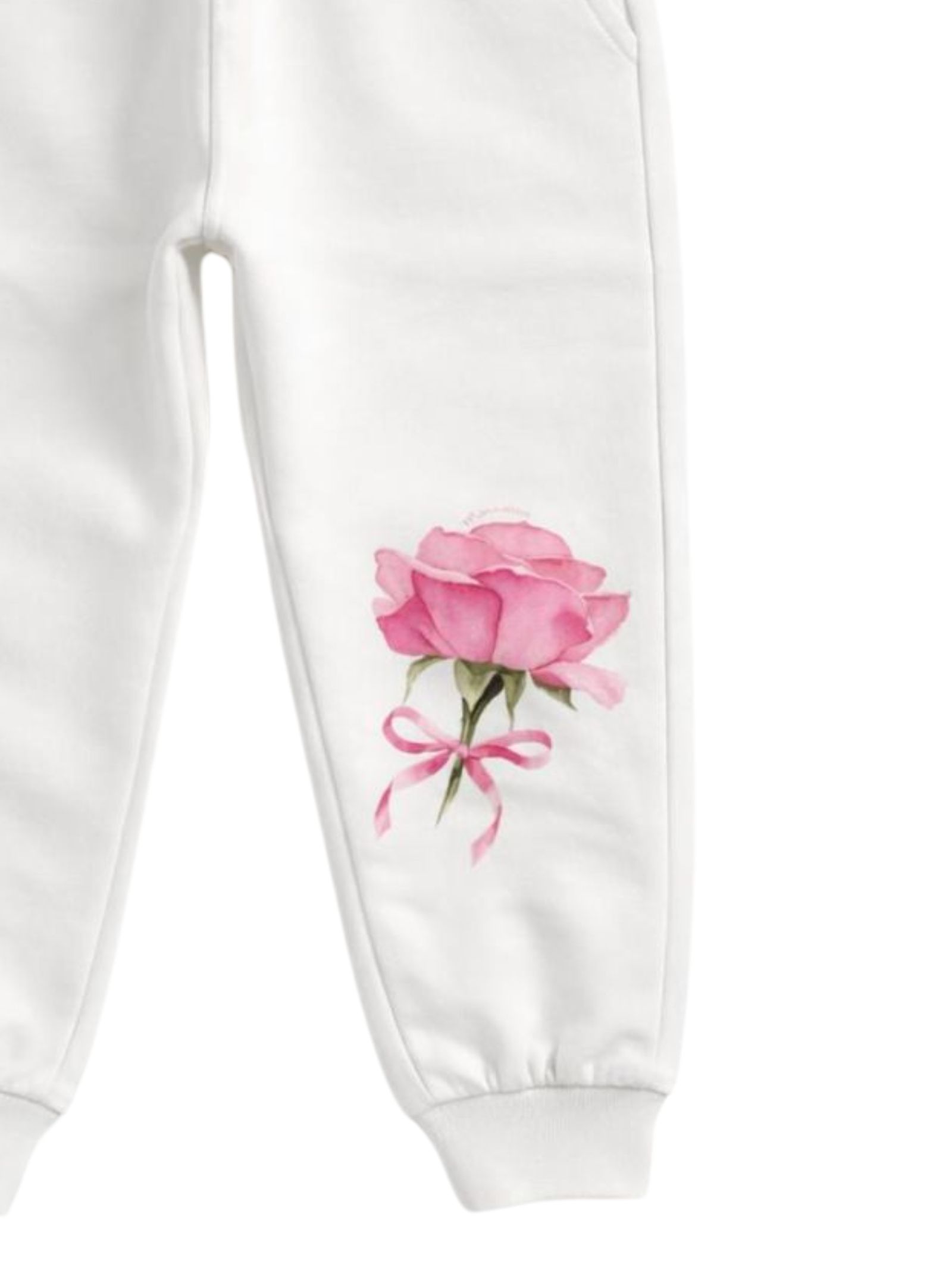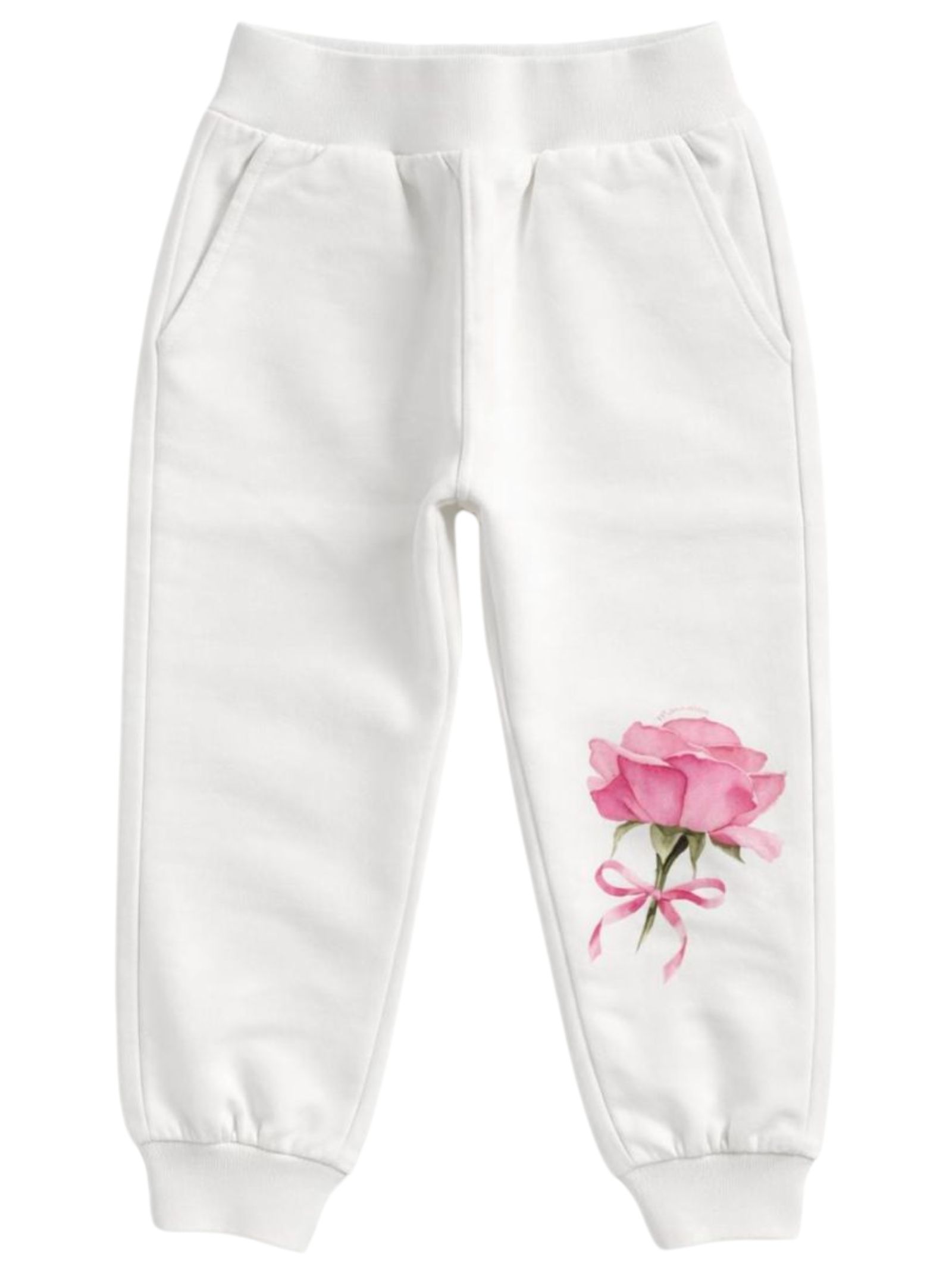 Monnalisa Kids white trousers with a contrasting pink print, made of stretch cotton with an elastic waistband, two side pockets, and elastic ankles. Composition: 95% cotton, 5% elastane.