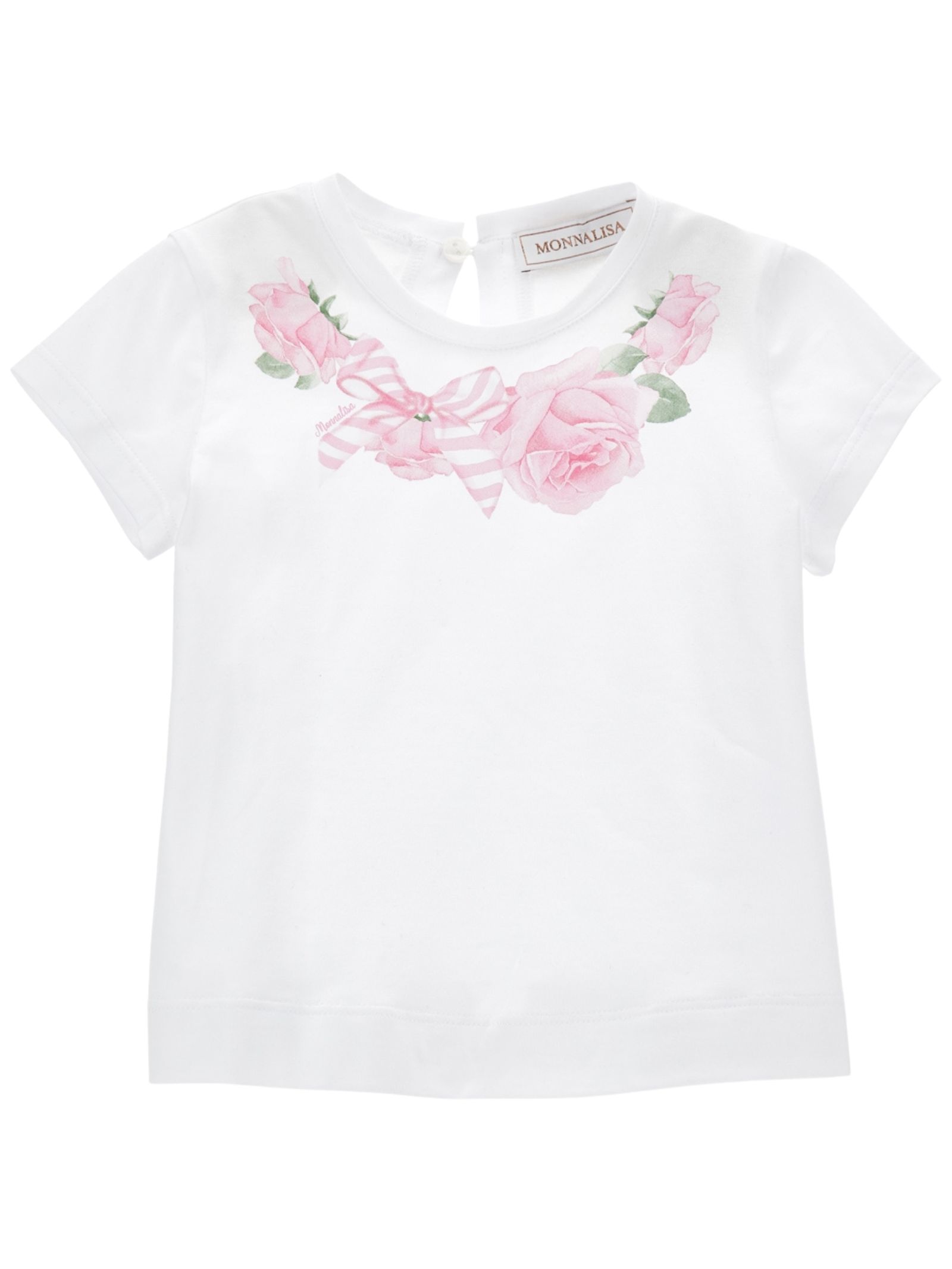 Monnalisa Kids white T-shirt, crew neck, short sleeves, rose print, button fastening on the back, regular fit. Composition: 100% cotton