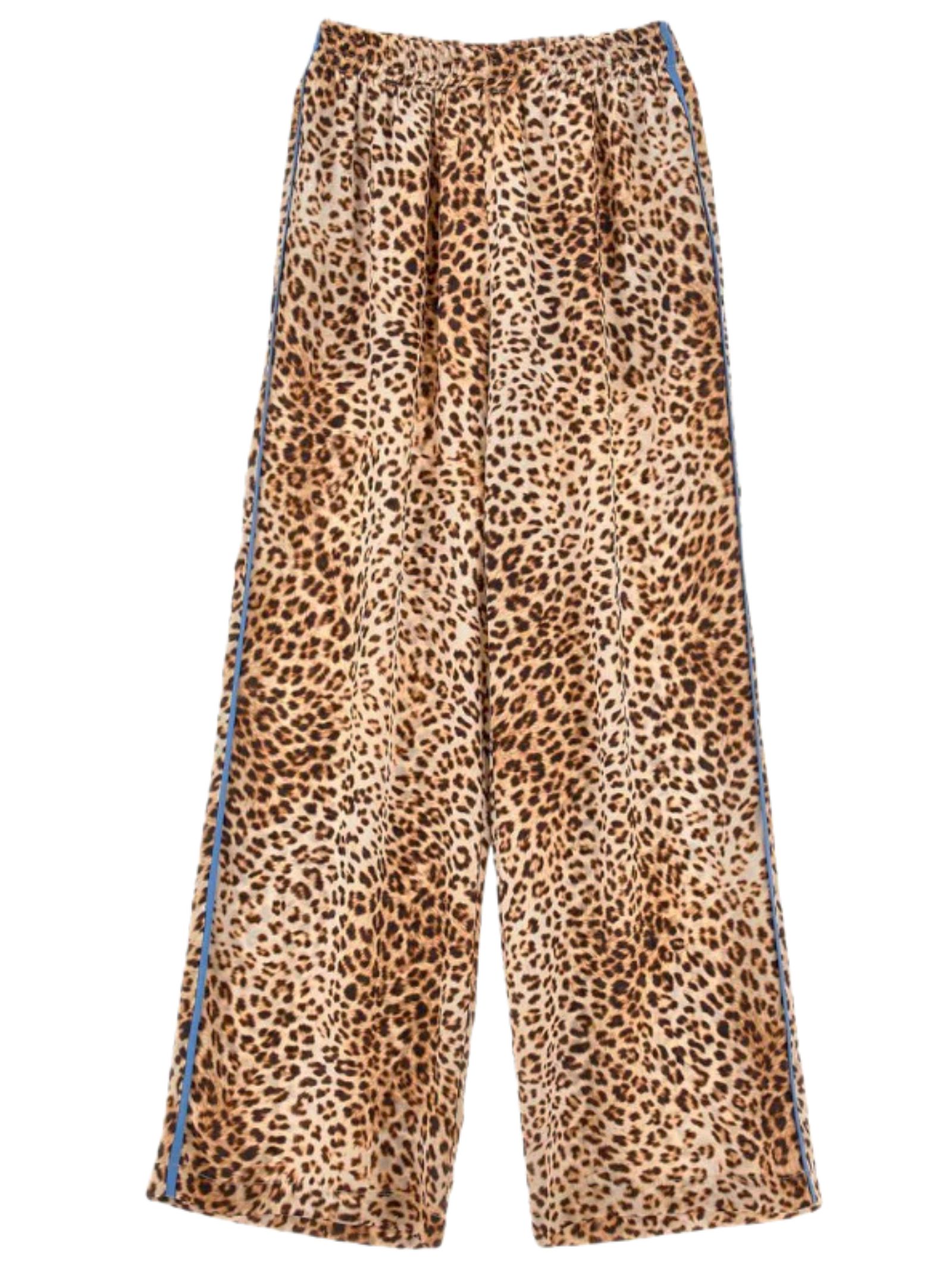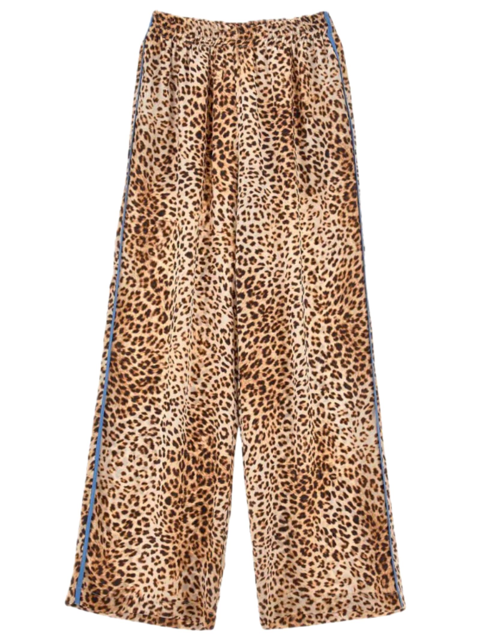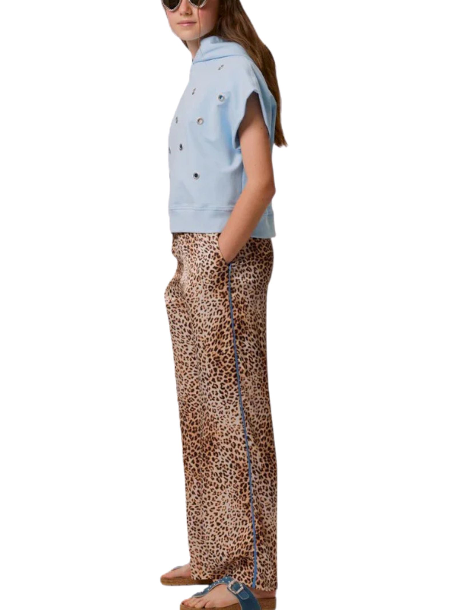 Monnalisa Kids pantalone realizzato in texture setosa al tatto in fantasia maculato, design con elastico in vita, due tasche laterali, bande laterali turchesi, vestibilità gamba ampia. Composizione: 100% viscosa. Made in Italy