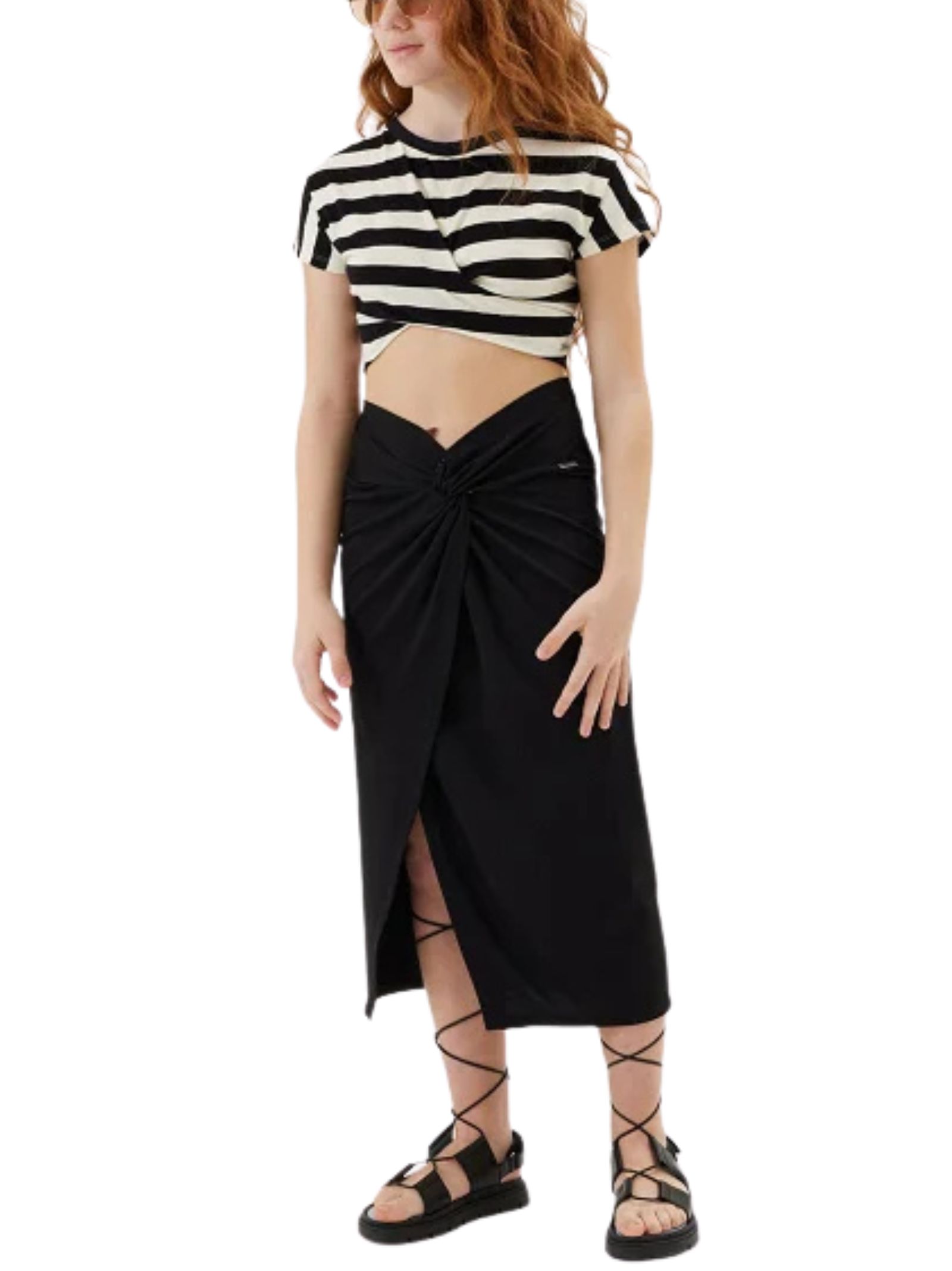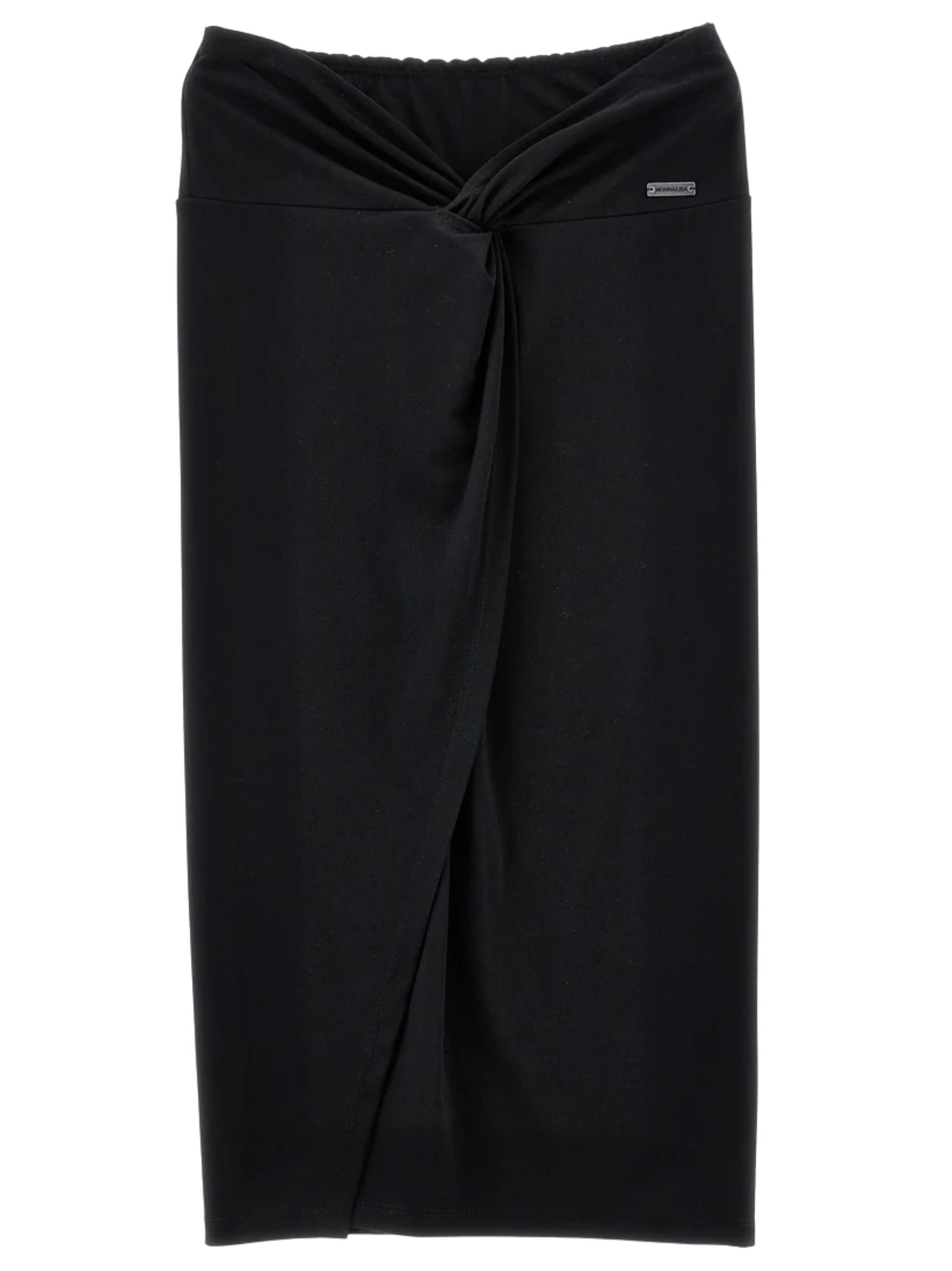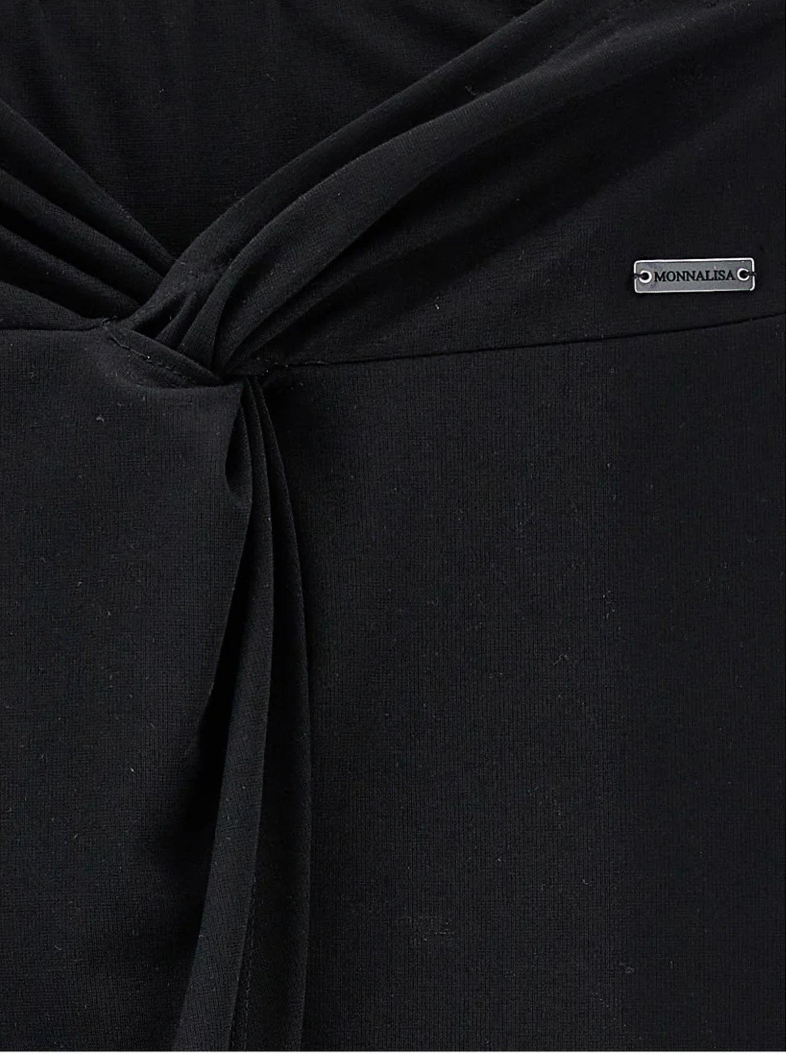 Monnalisa Kids black skirt with an elastic waistband, a central knot detail, a below-the-knee length, a metal logo plaque, and a fitted fit. Composition: 65% viscose, 28% polyamide, 7% elastane. Made in Italy.