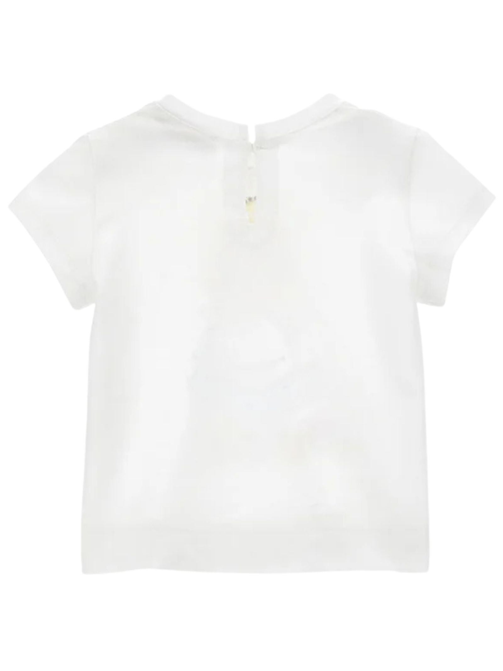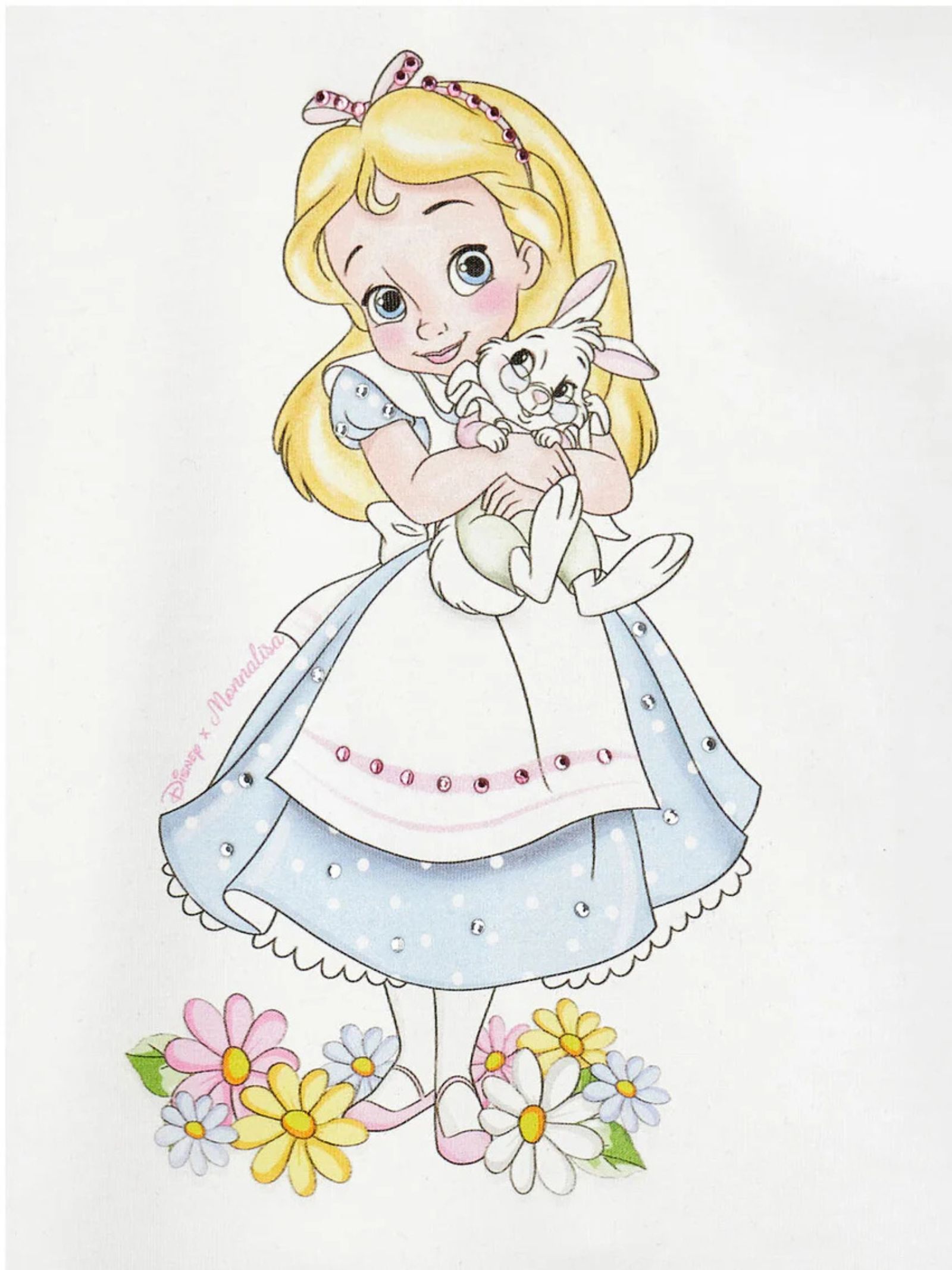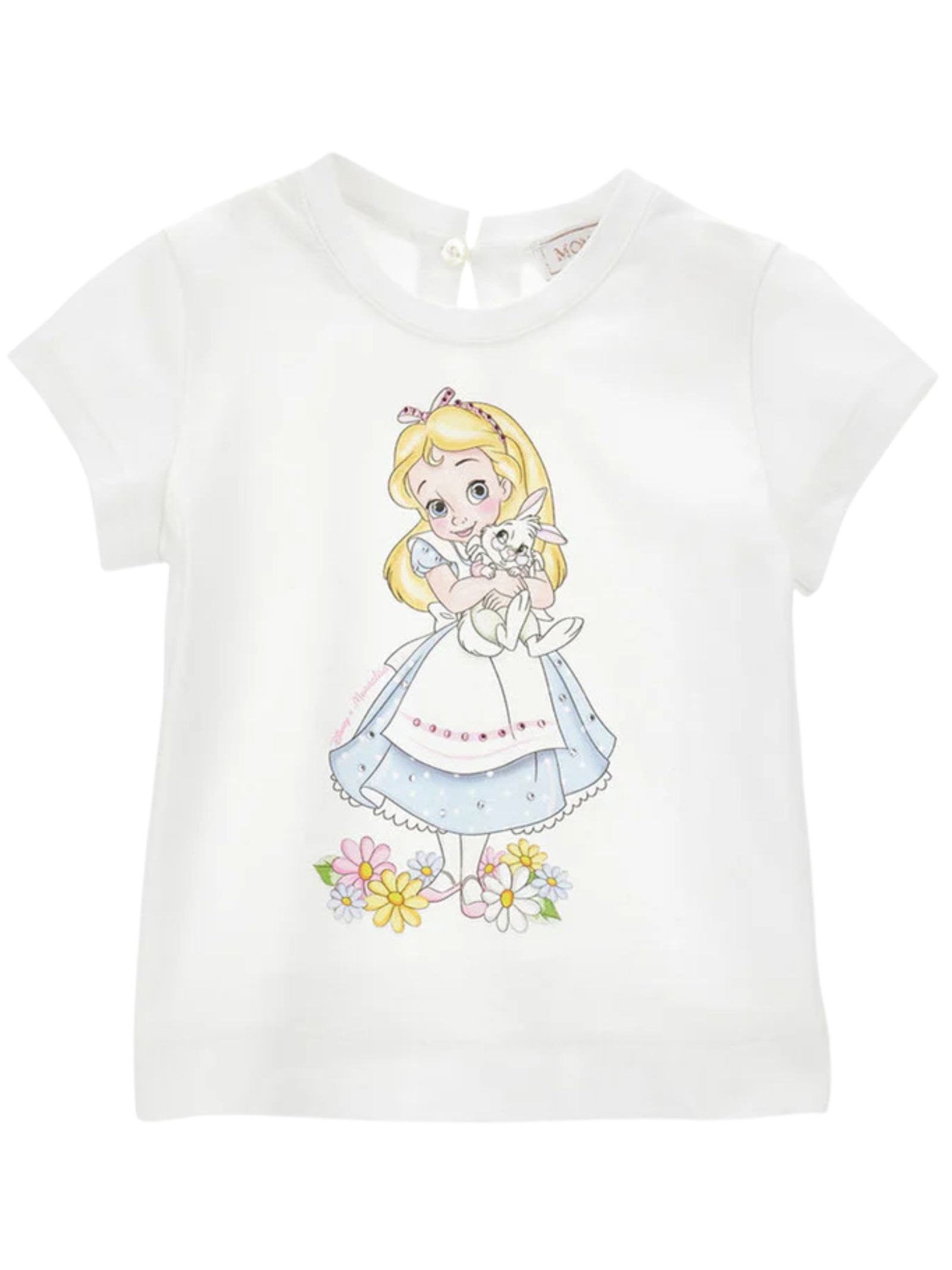 Disney x Monnalisa Kids white t-shirt, crew neck, short sleeves, contrasting Alice in Wonderland logo print at the center, button closure on the back, regular fit. Composition: 100% cotton.