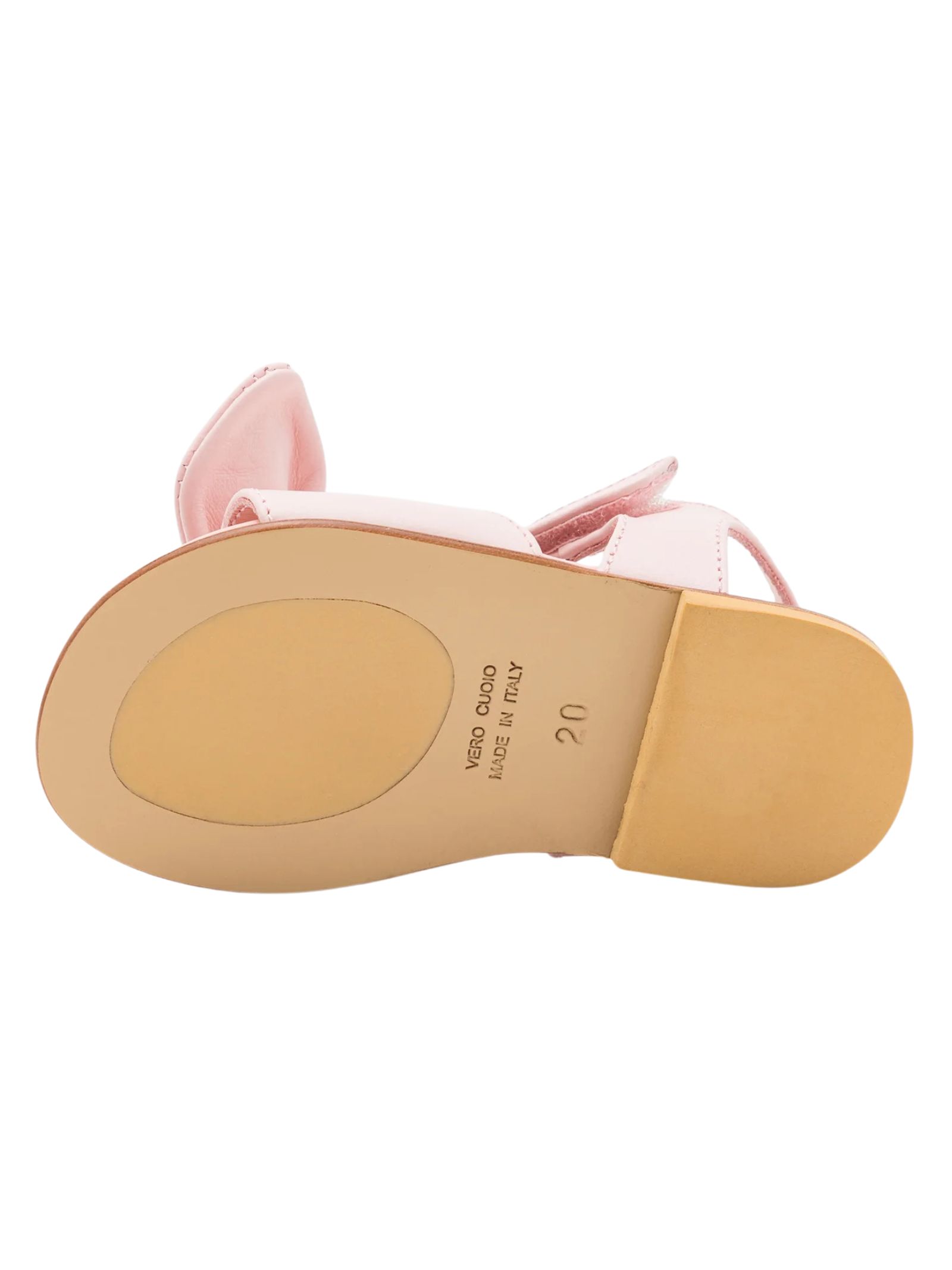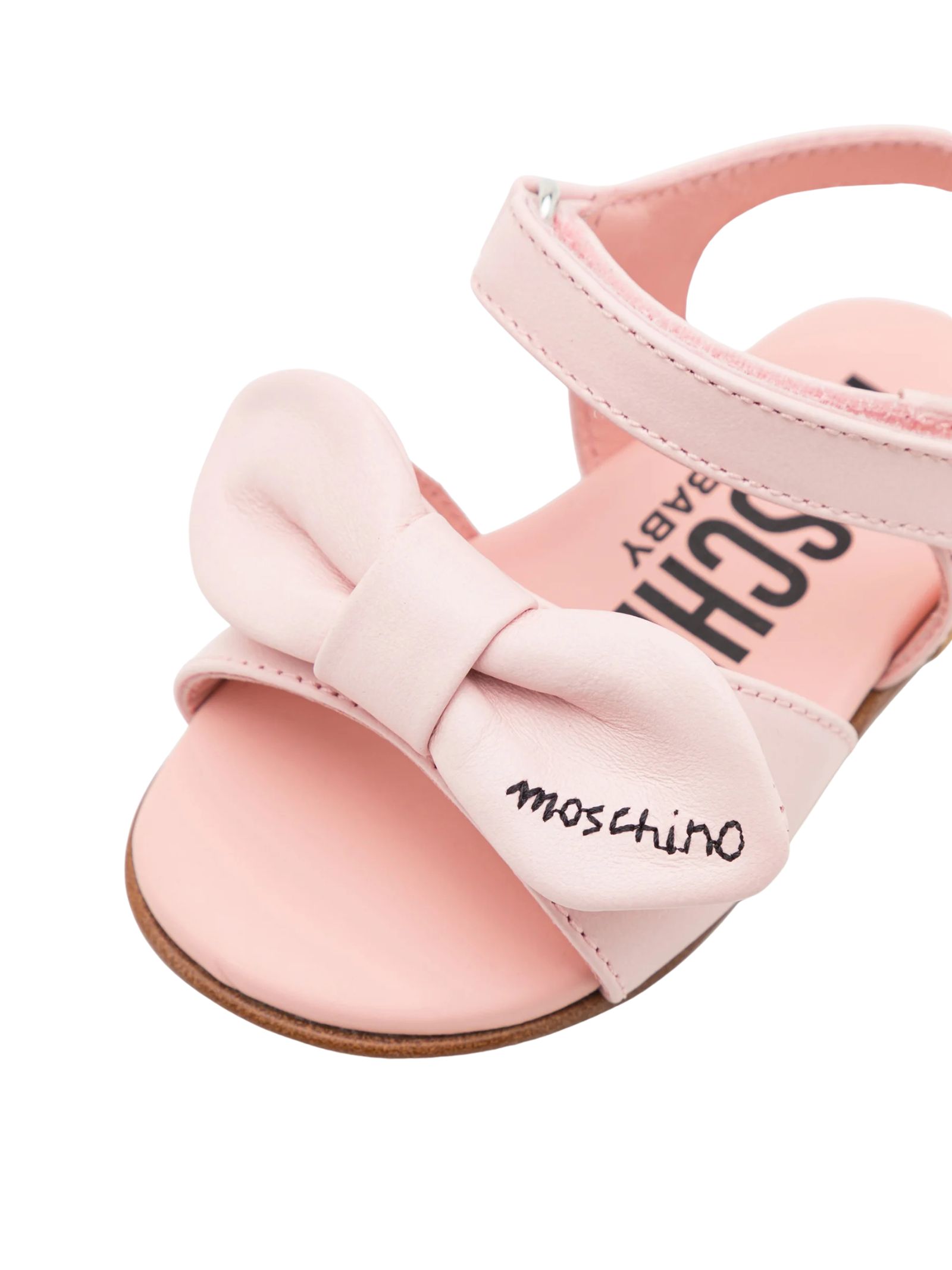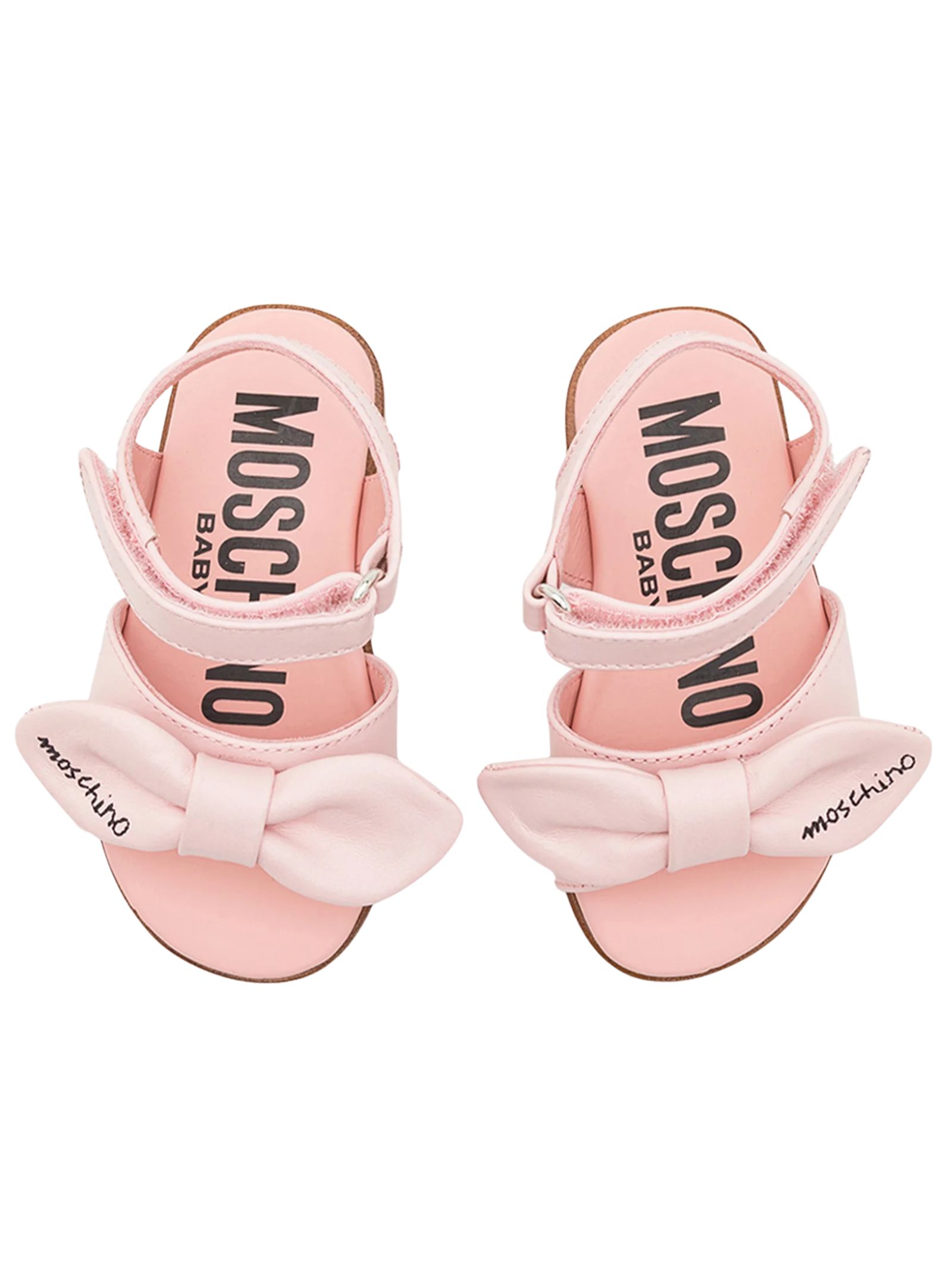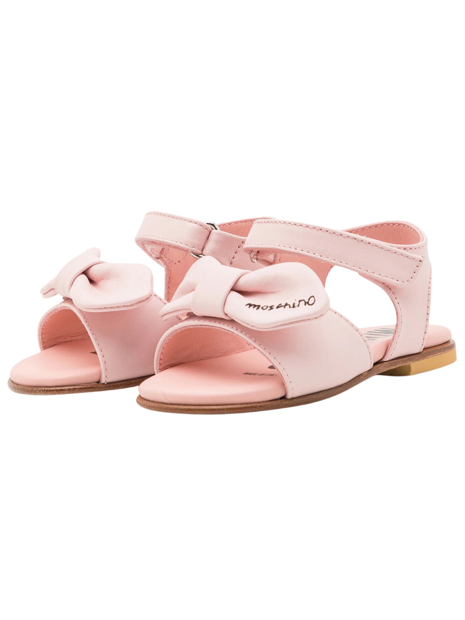 Moschino Kids pink calfskin sandal with logo insole, open toe, adjustable Velcro side closure, and bow detail. Lining: 100% calfskin. Sole: 100% leather. Made in Italy.