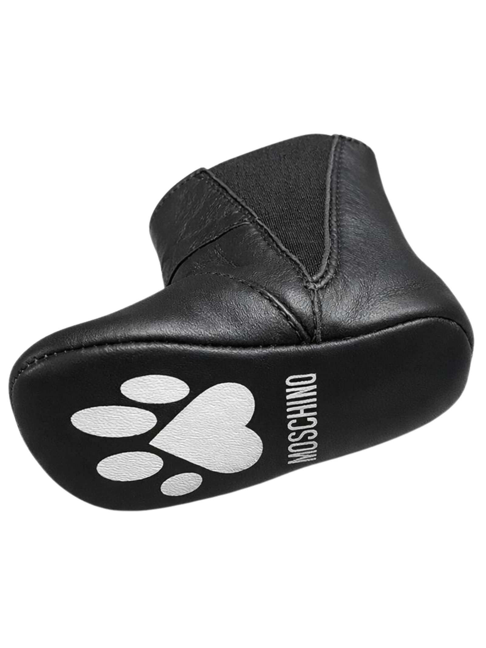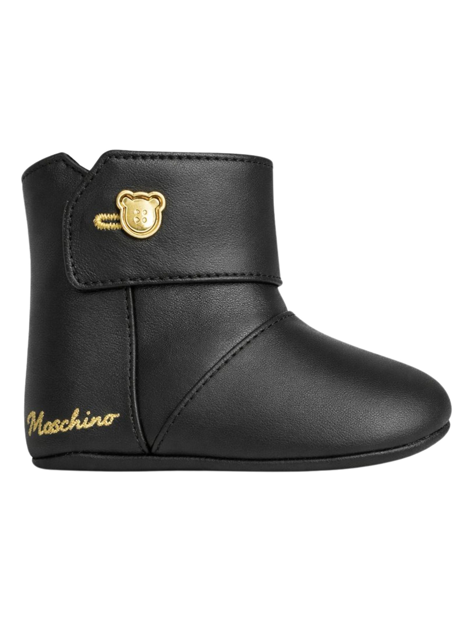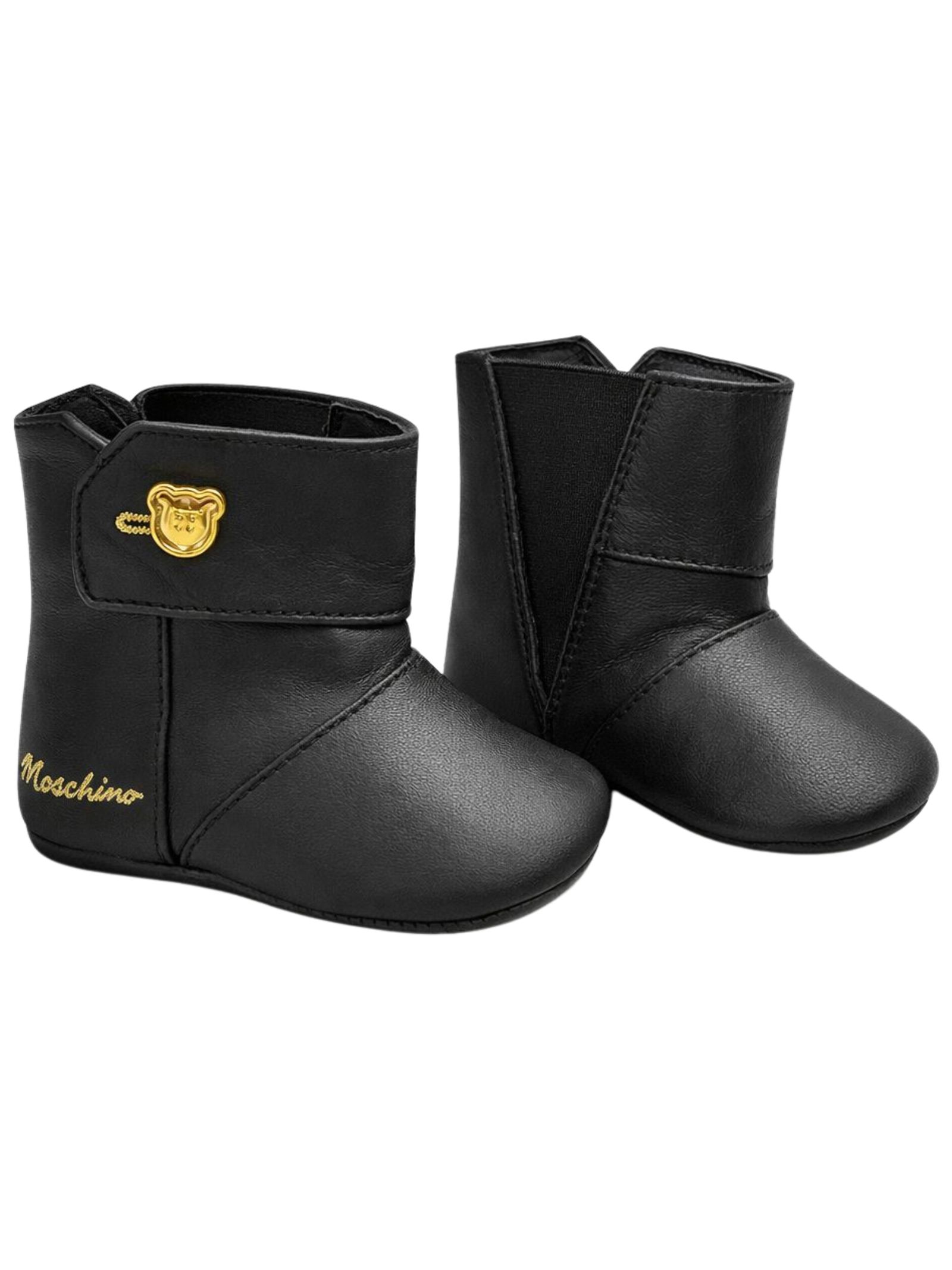 Moschino Kids black leather pre-walker shoes with a boot-style design, elastic side insert, and a contrasting gold embroidered logo, a metal teddy bear print on the side, and a logo on the sole. Made in Italy.