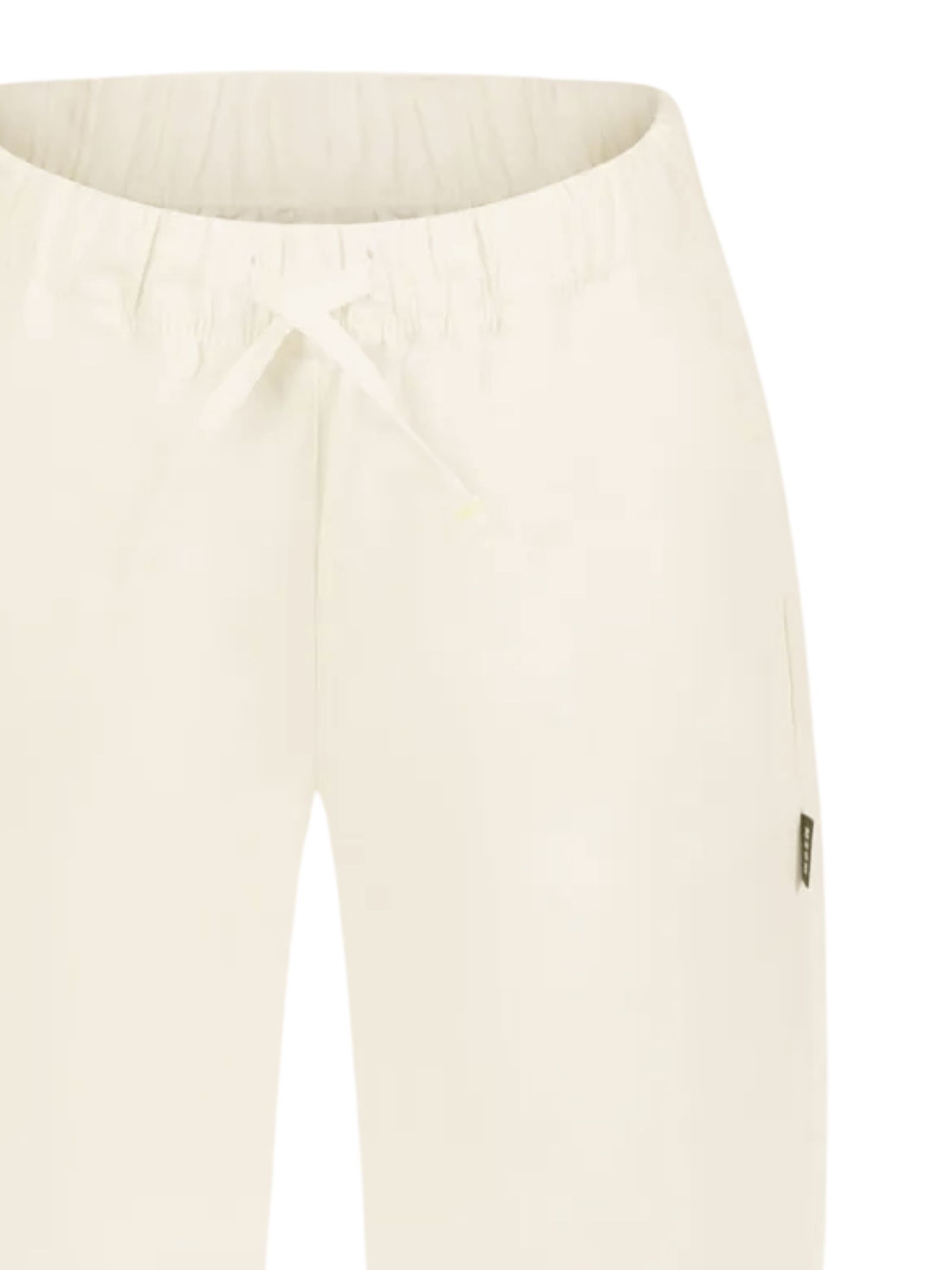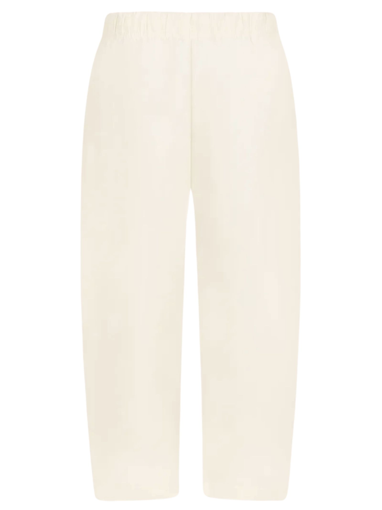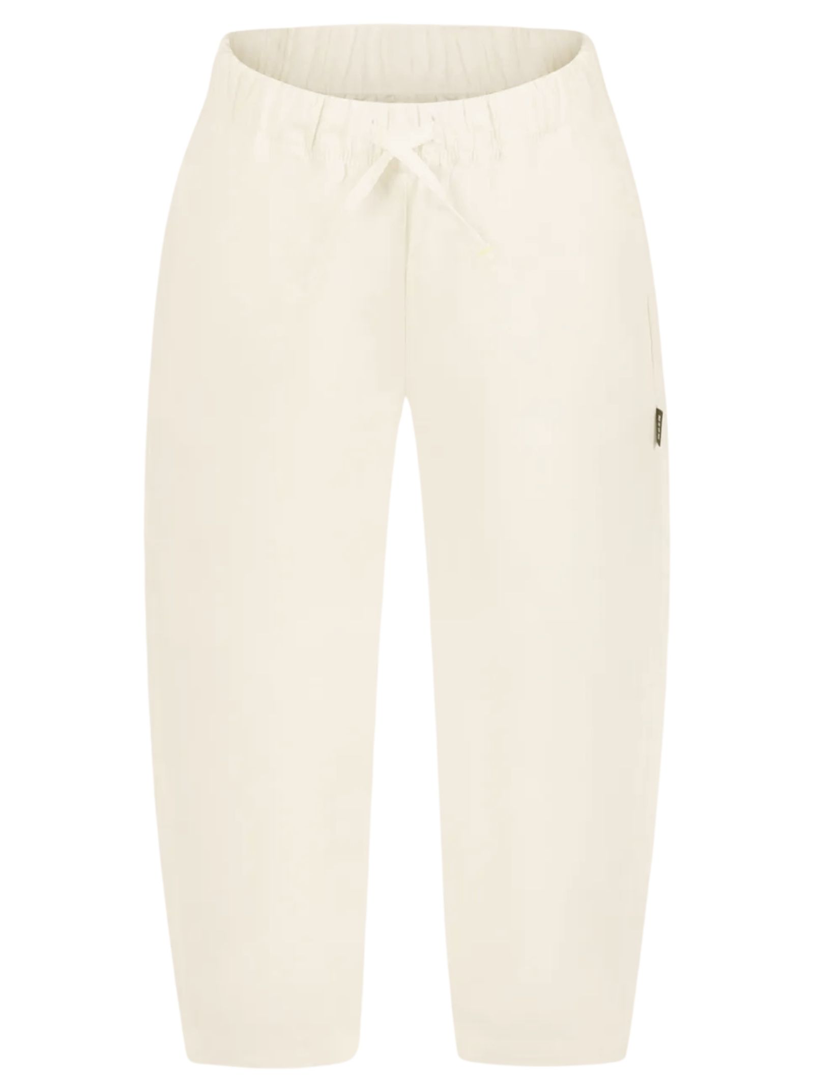 MSGM Kids cream-colored trousers with an elastic waistband and drawstring, two side pockets, a logo patch, elastic cuffs, and a wide leg. Composition: 97% cotton, 3% elastane. Made in Italy.