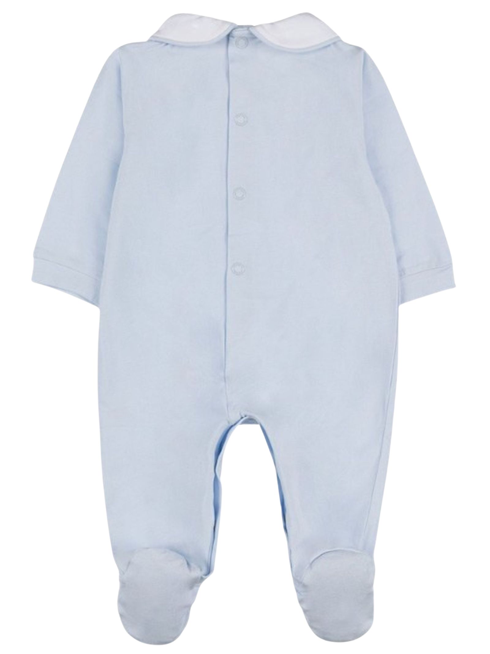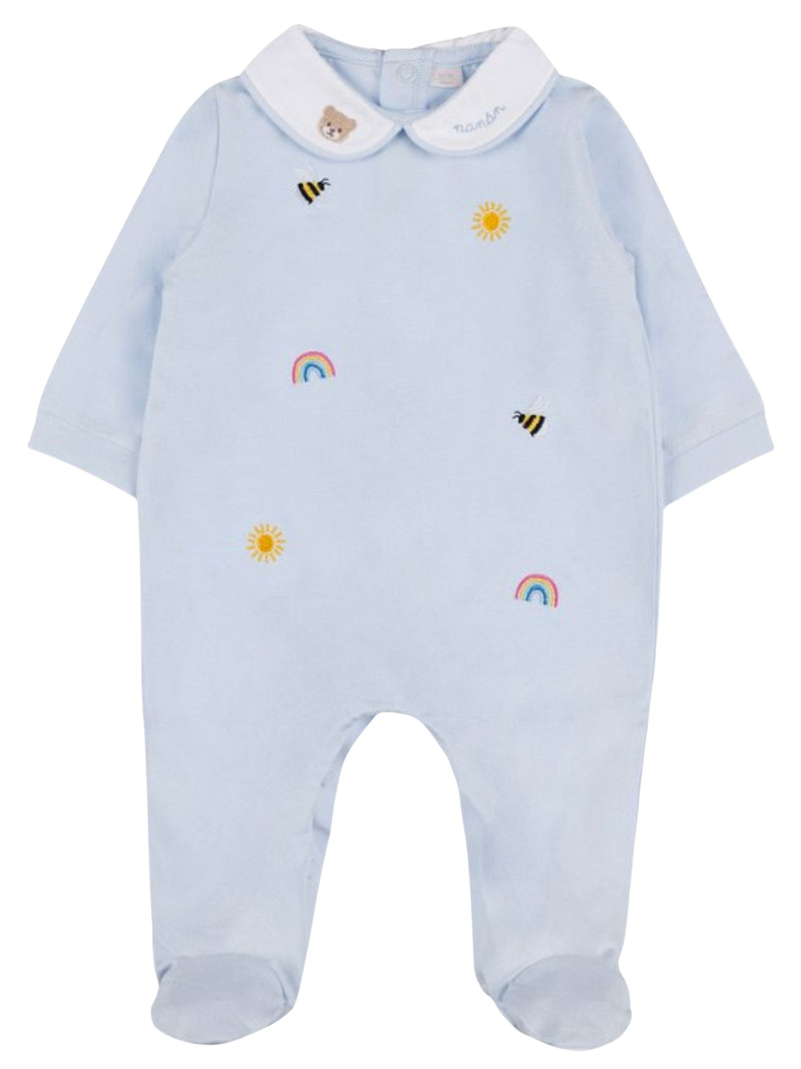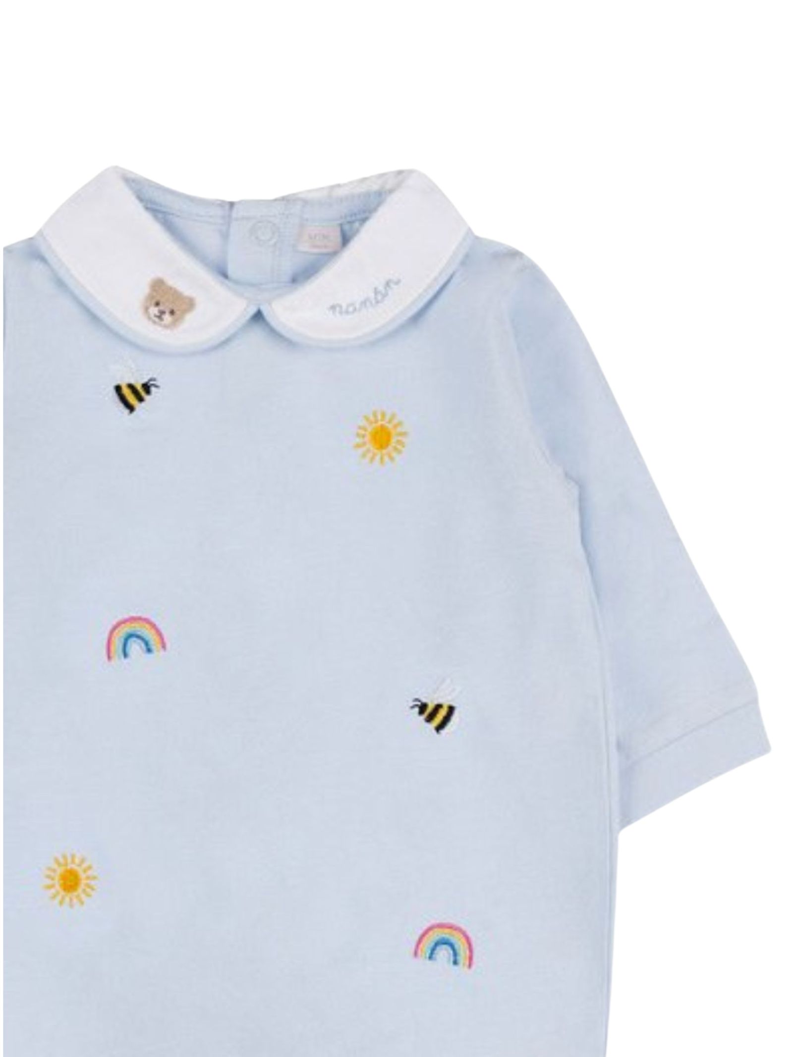 Nanan Kids light blue cotton romper with a collar, contrasting embroidery detail, long sleeves, button fastening at the back and crotch, and feet. Composition: 95% cotton, 5% elastane.