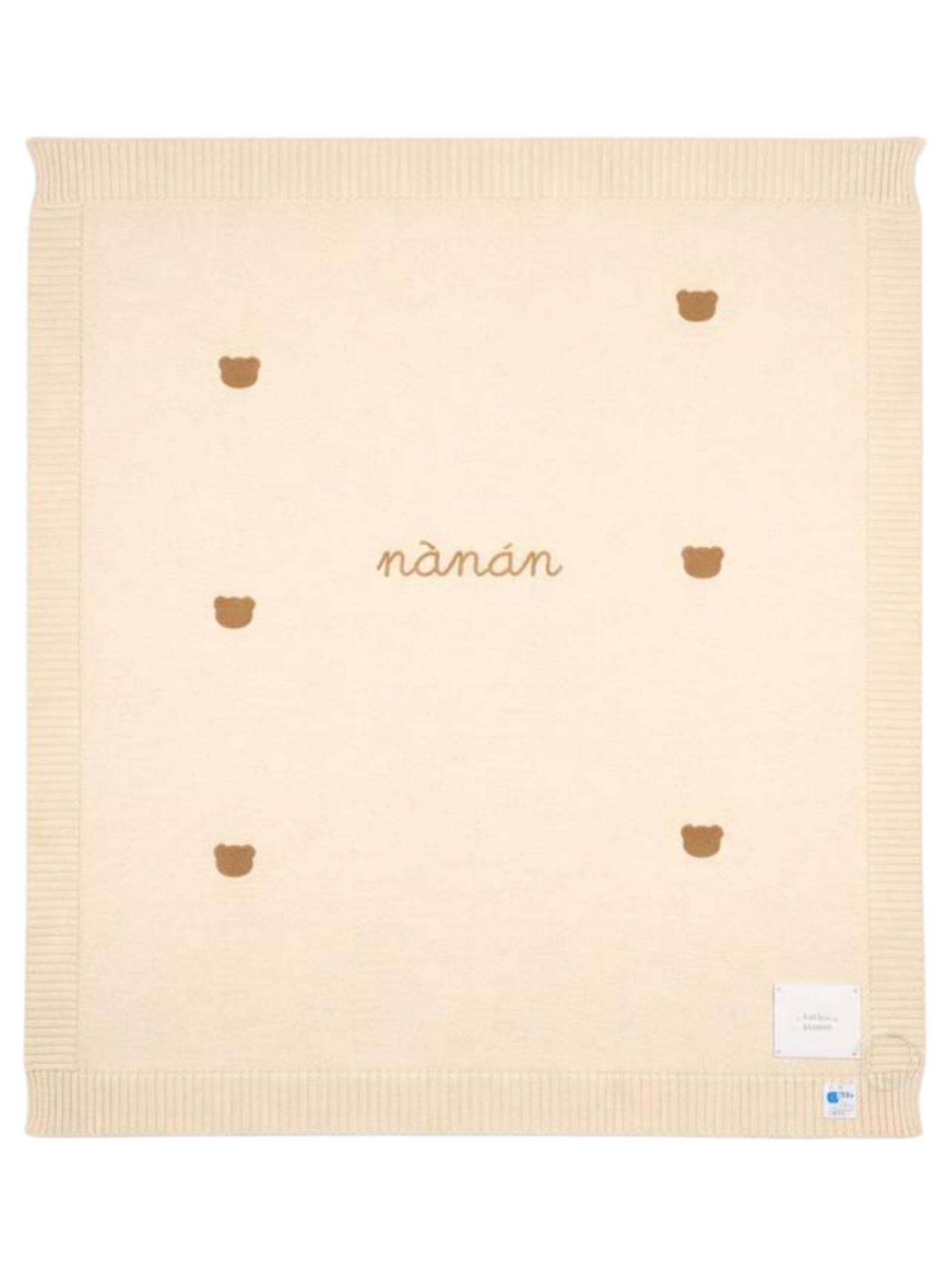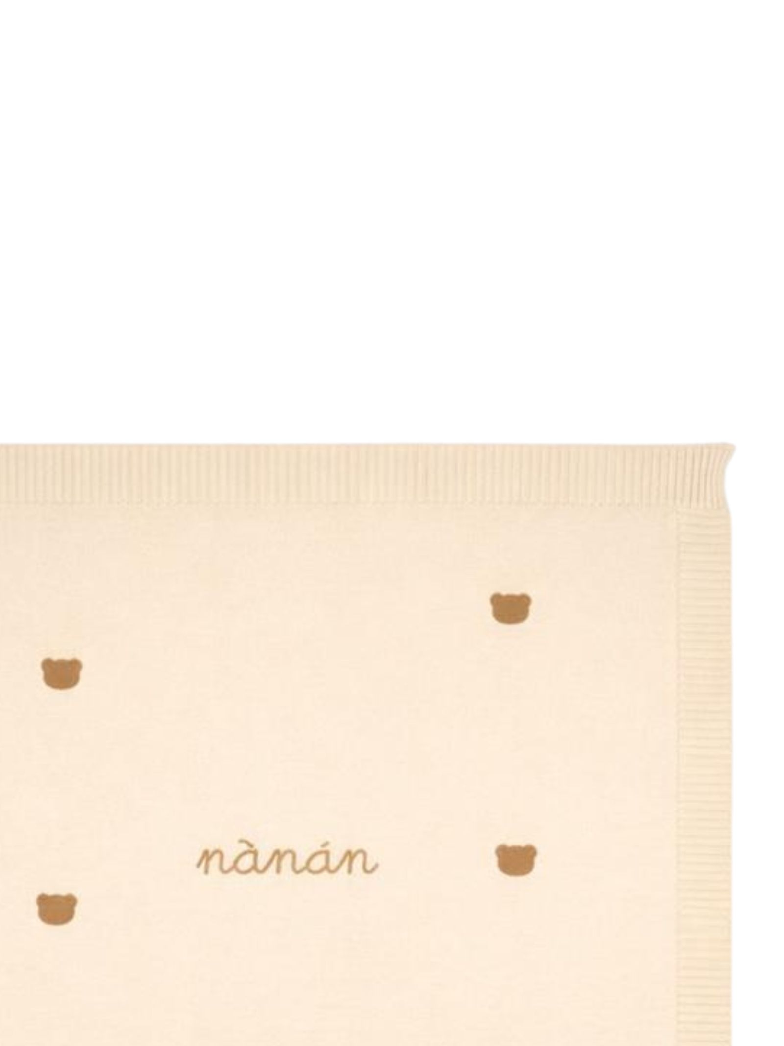 Nanan Kids beige blanket, made of soft cotton yarn, square design, central initial logo embroidery with hearts, ribbed edges. Composition: 100% cotton