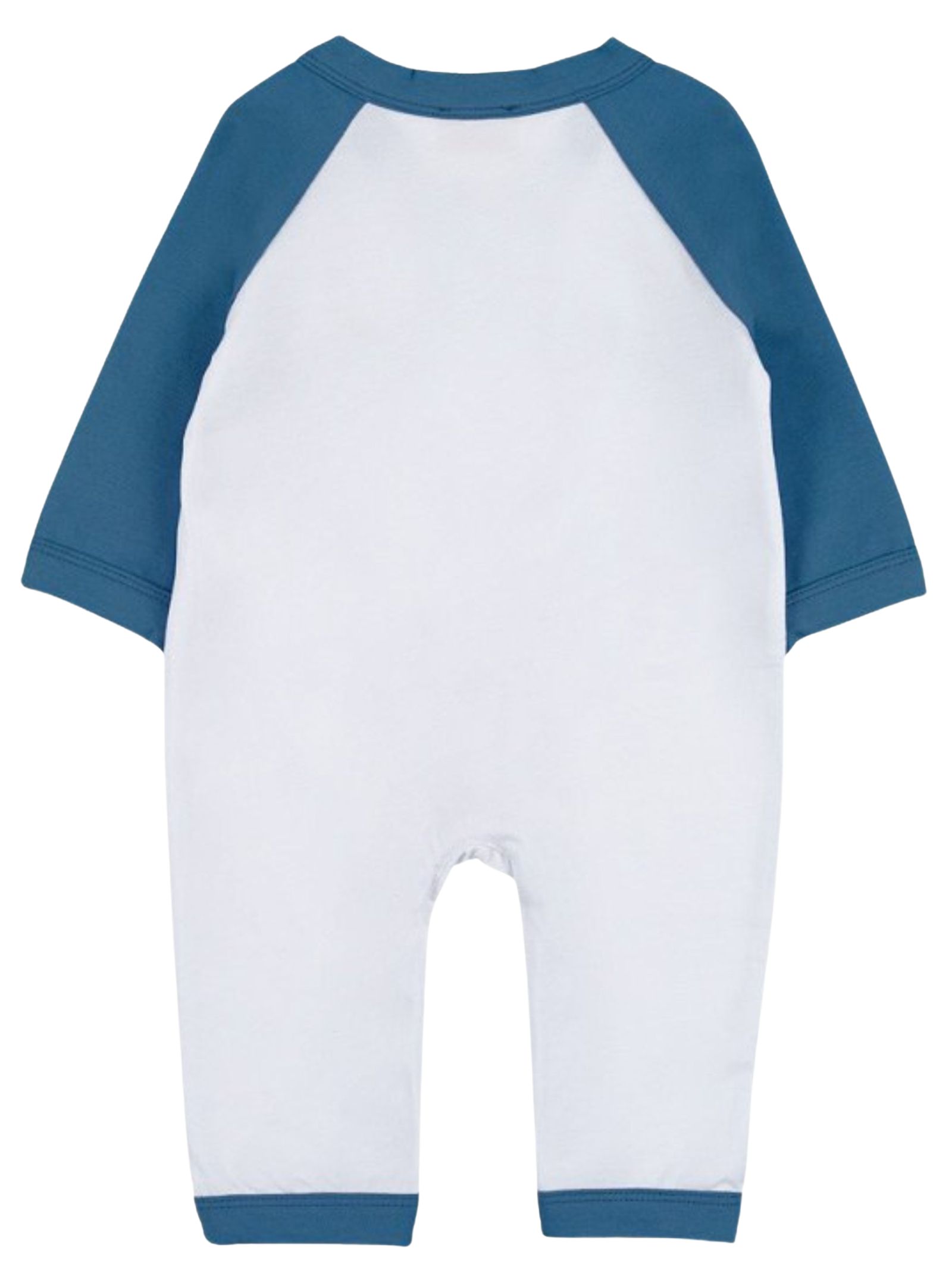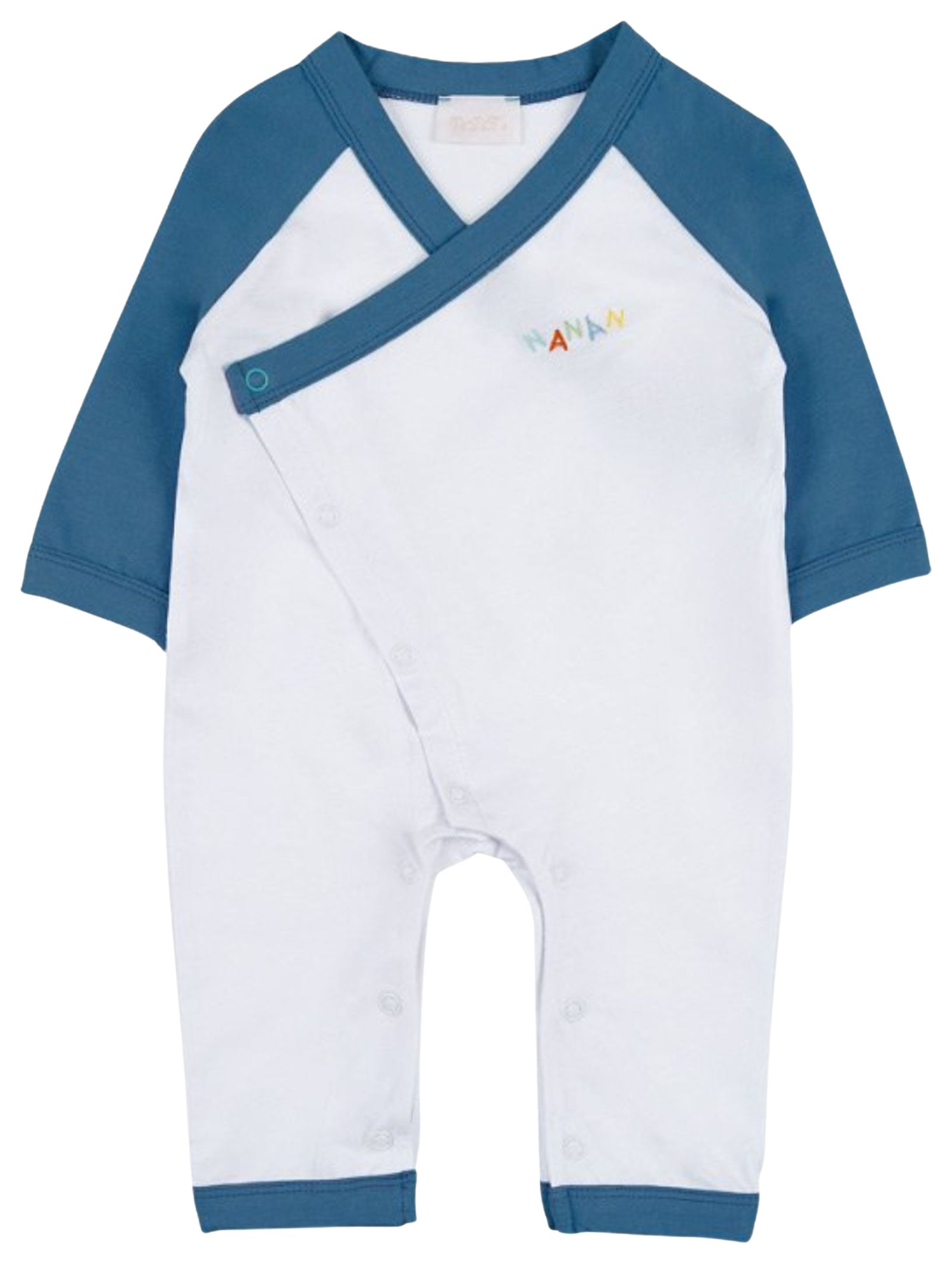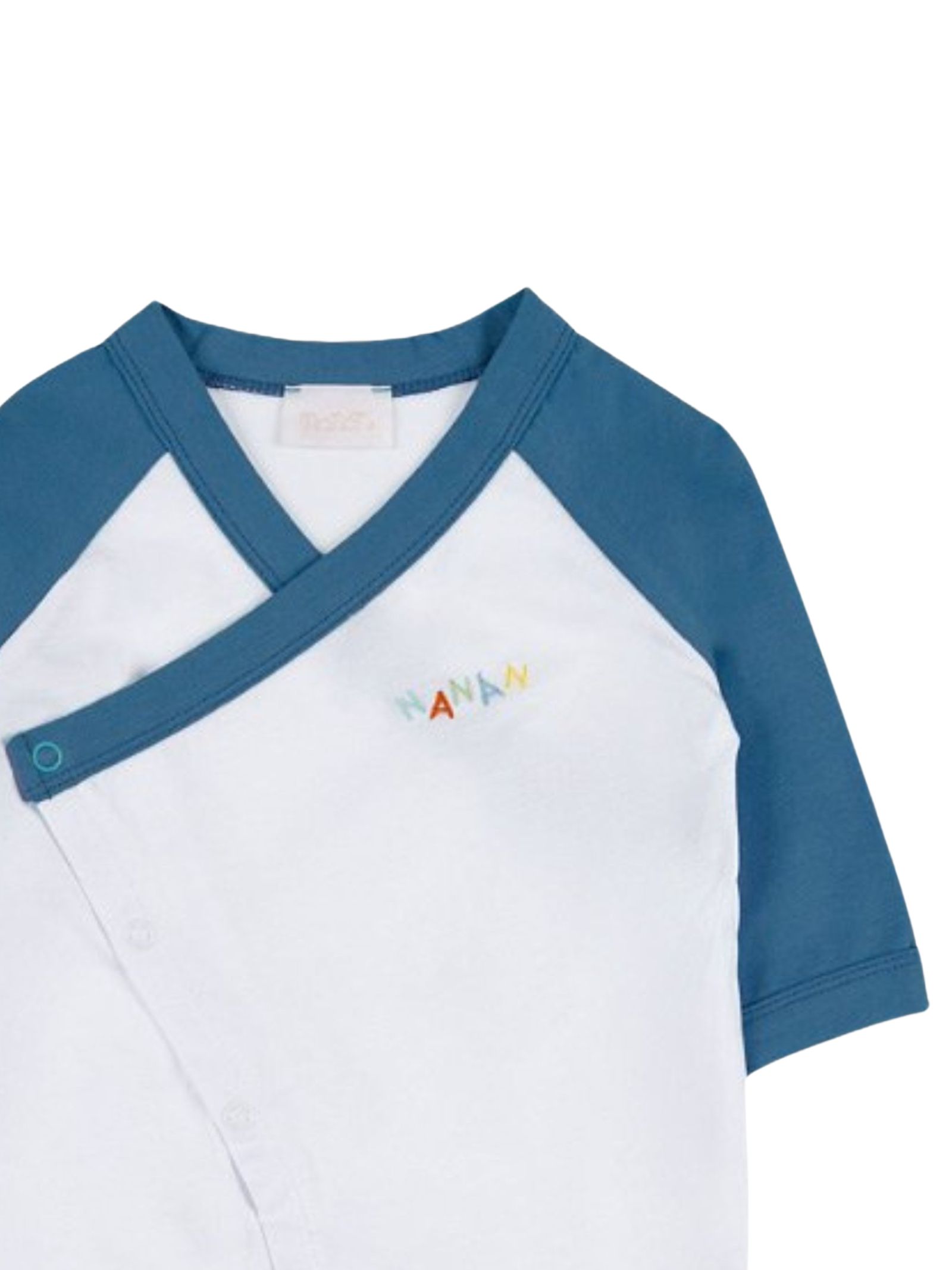 Nanan Kids light blue/white cotton onesie, V-neck design, contrasting logo detail, long sleeves, and a slit at the front and crotch. Composition: 100% cotton